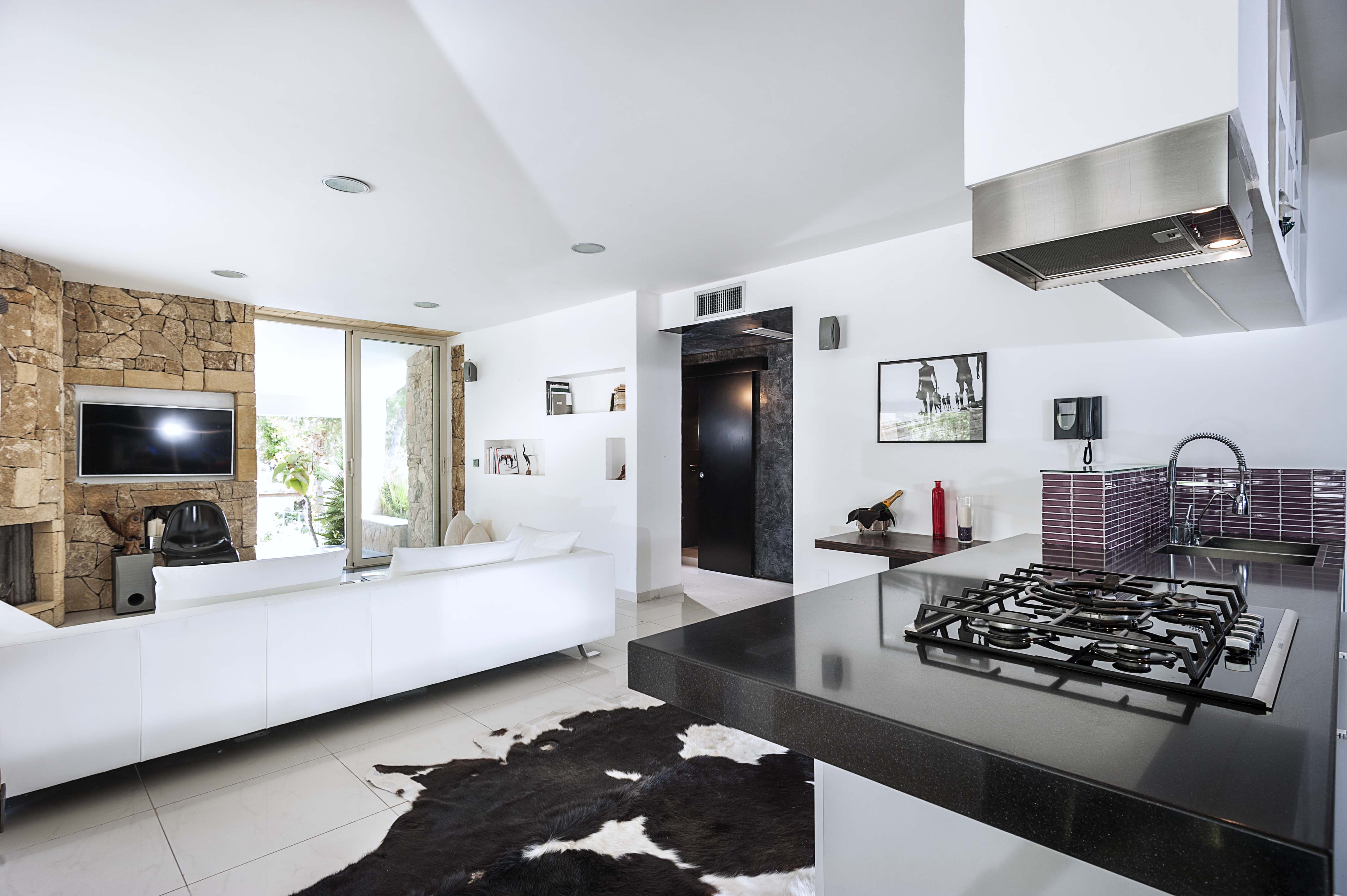 Nestled in a residential area, the villa is surrounded by a beautiful garden that embraces the pool and a large terrace. Recently renovated, the house is on split levels. At the entrance level there are a bright living area, kitchen and dining area, a master bedroom with en suite bathroom, a double room and a bathroom. On the lower level with access from the outside there are two additional bedrooms with en suite bathrooms.
