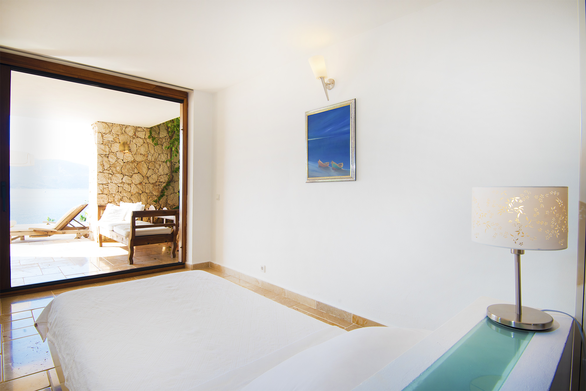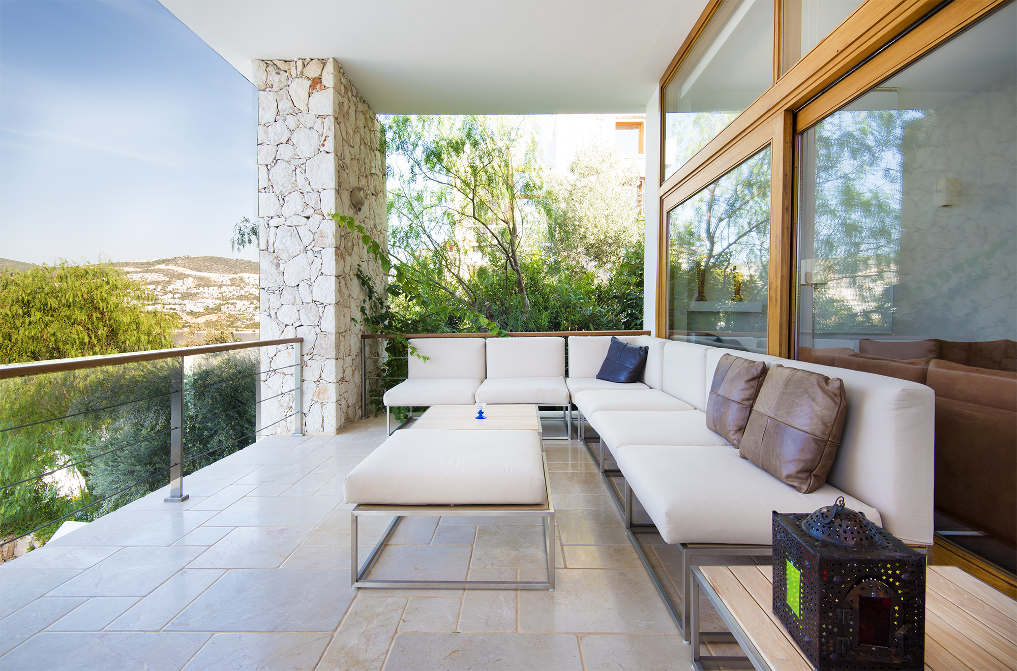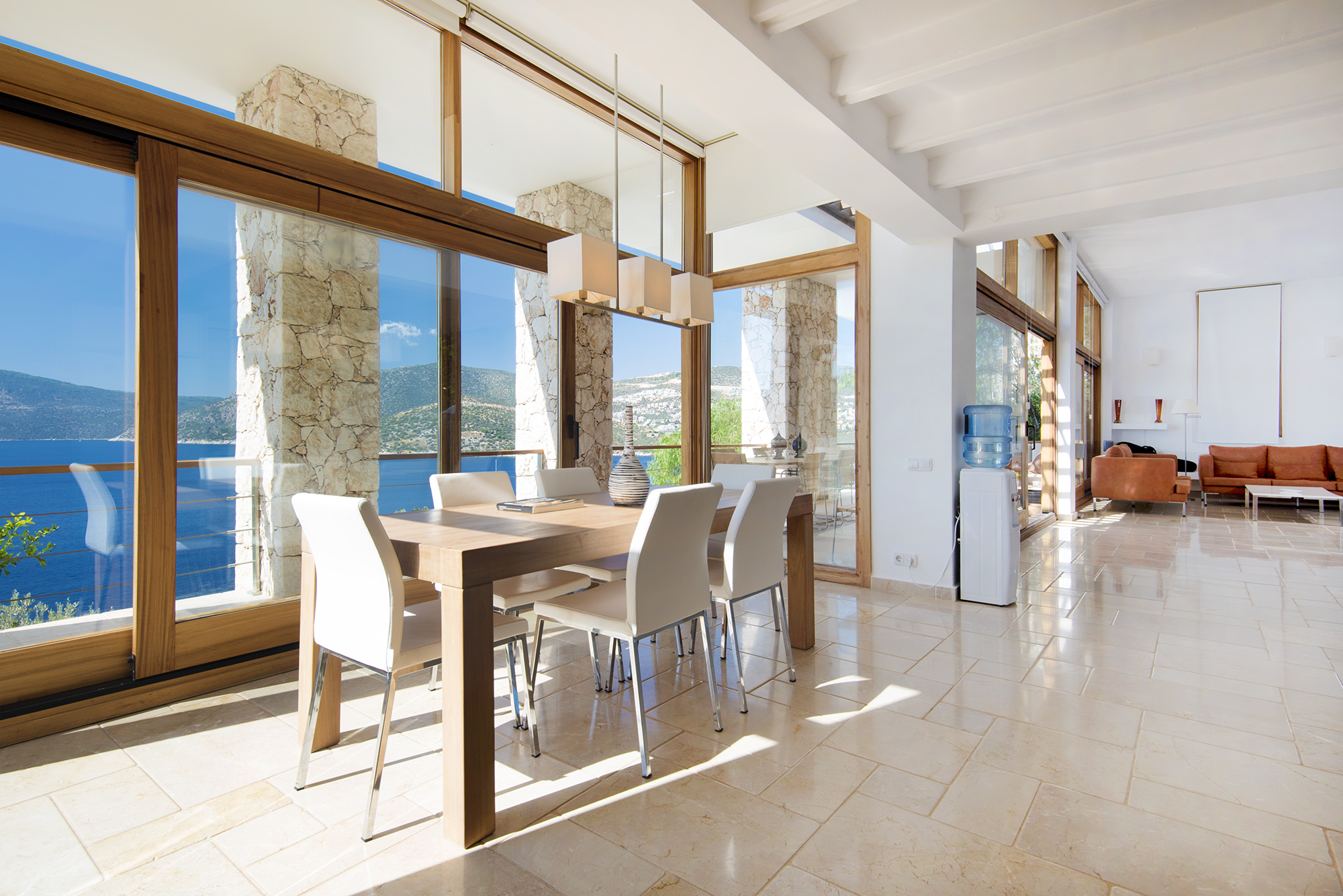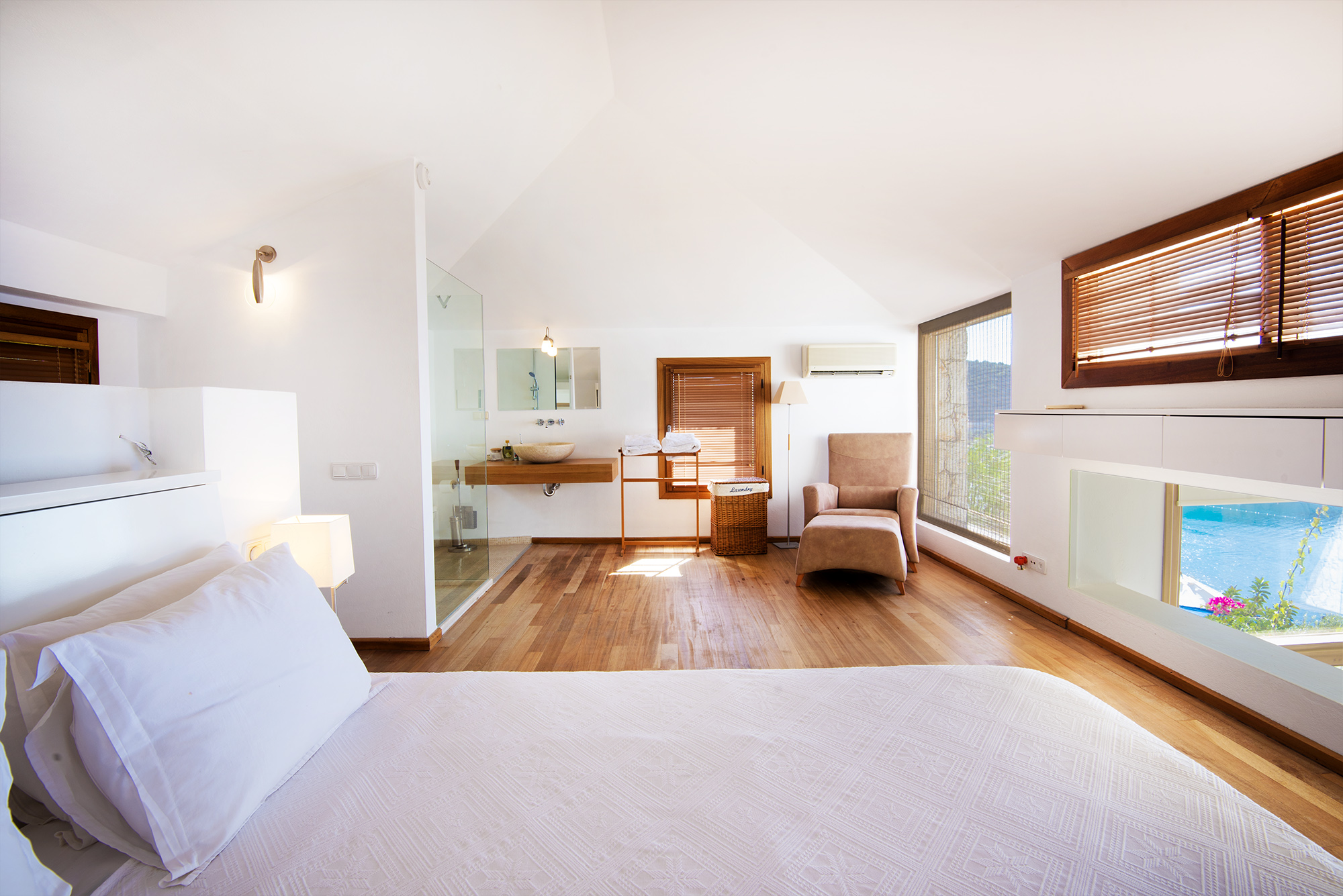 Villa Su just like its neighbour Villa Gunbatimi has oodles of wow factor! The initial surprise comes when you enter the property from the garden area to find the long, low villa has an entire wall of glass looking out to Kalkan’s extraordinarily beautiful bay. It is breathtaking.