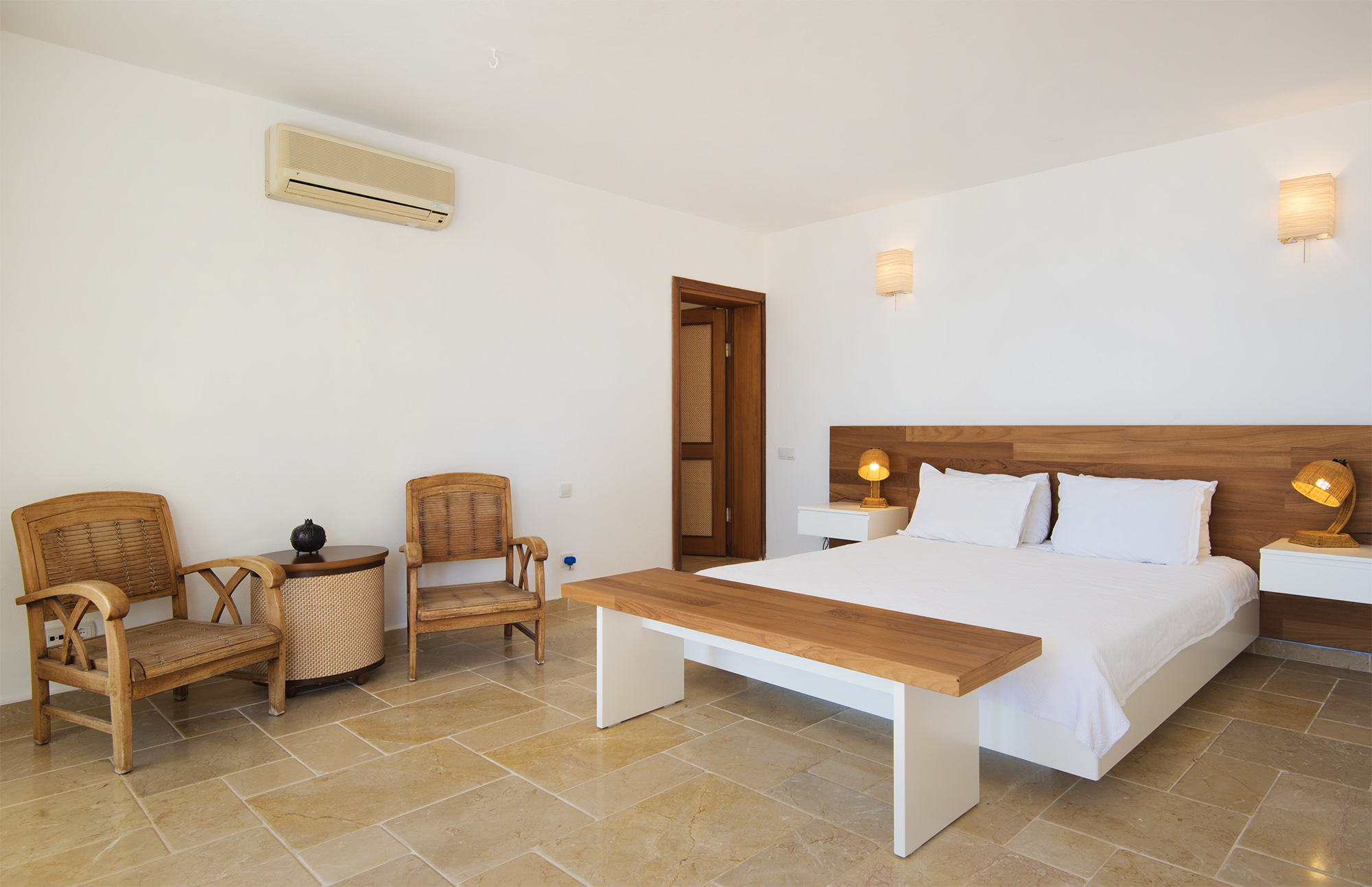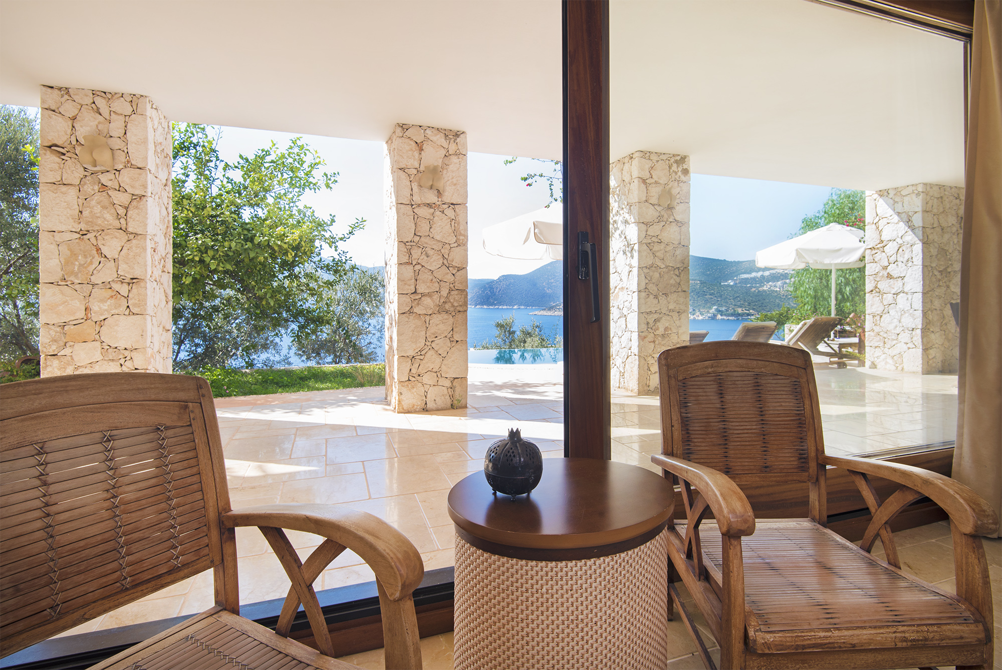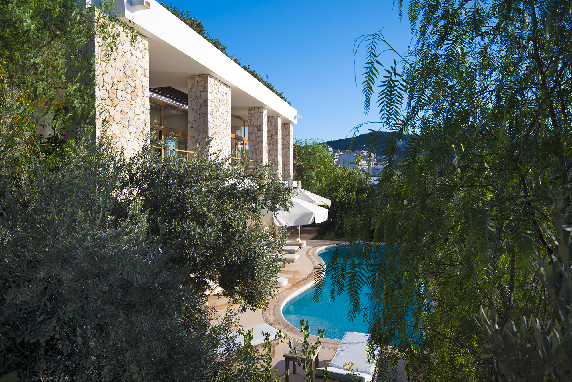The architecture is very clever; from the interior the huge glass windows make it appear that you are suspended in the view, whilst from the sea you can appreciate what a solid building this is. The pale stone huge vertical columns frame the views. Every room is spacious and takes full advantage of the panoramic outlook. The style is contemporary and at the same time comfortable, but with a nod to the traditional in the form of exquisite hand crafted Turkish kilims.
