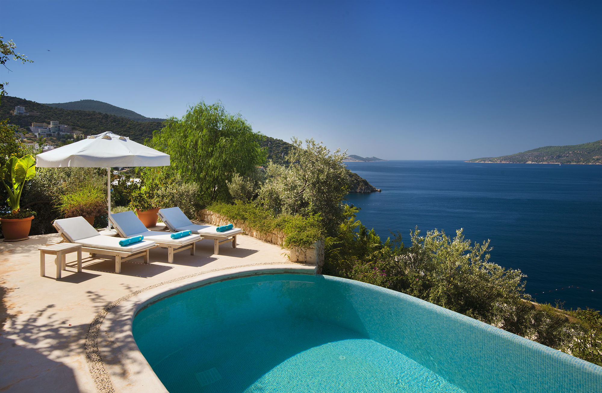The inimitable Ipek Hanim, creative genius of the Hotel Villa Mahal has used her vision and skill to create this collection of 3 villas set just above the Mahal Beach Club. Villa Günbatimi, Villa Ruya and this one, Villa Su. The Mahal Beach Club is Kalkan’s finest, platforms shaded by olive trees are cut into the cliff and offer sun beds and shades, at sea level the decked platforms with steps allow you to access the crystal clear water which is great for snorkelling. It is effortlessly stylish, sophisticated and fun! The beach clubs’ very chilled waterside restaurant offers an extensive menu and fabulous cocktails throughout the day and evening.