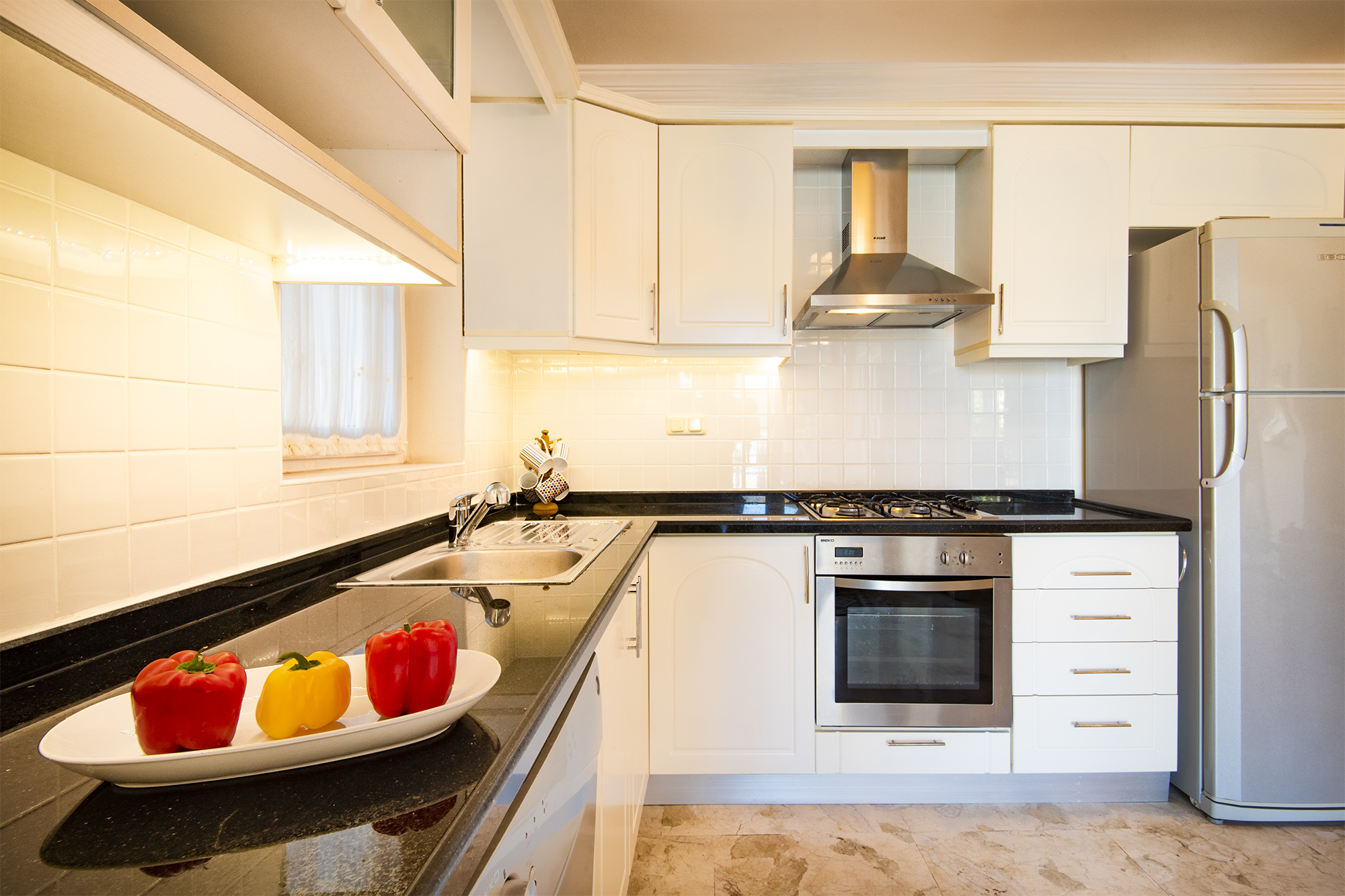 Fully fitted and equipped kitchen with electric oven, hob, fridge/freezer, dishwasher, kettle.