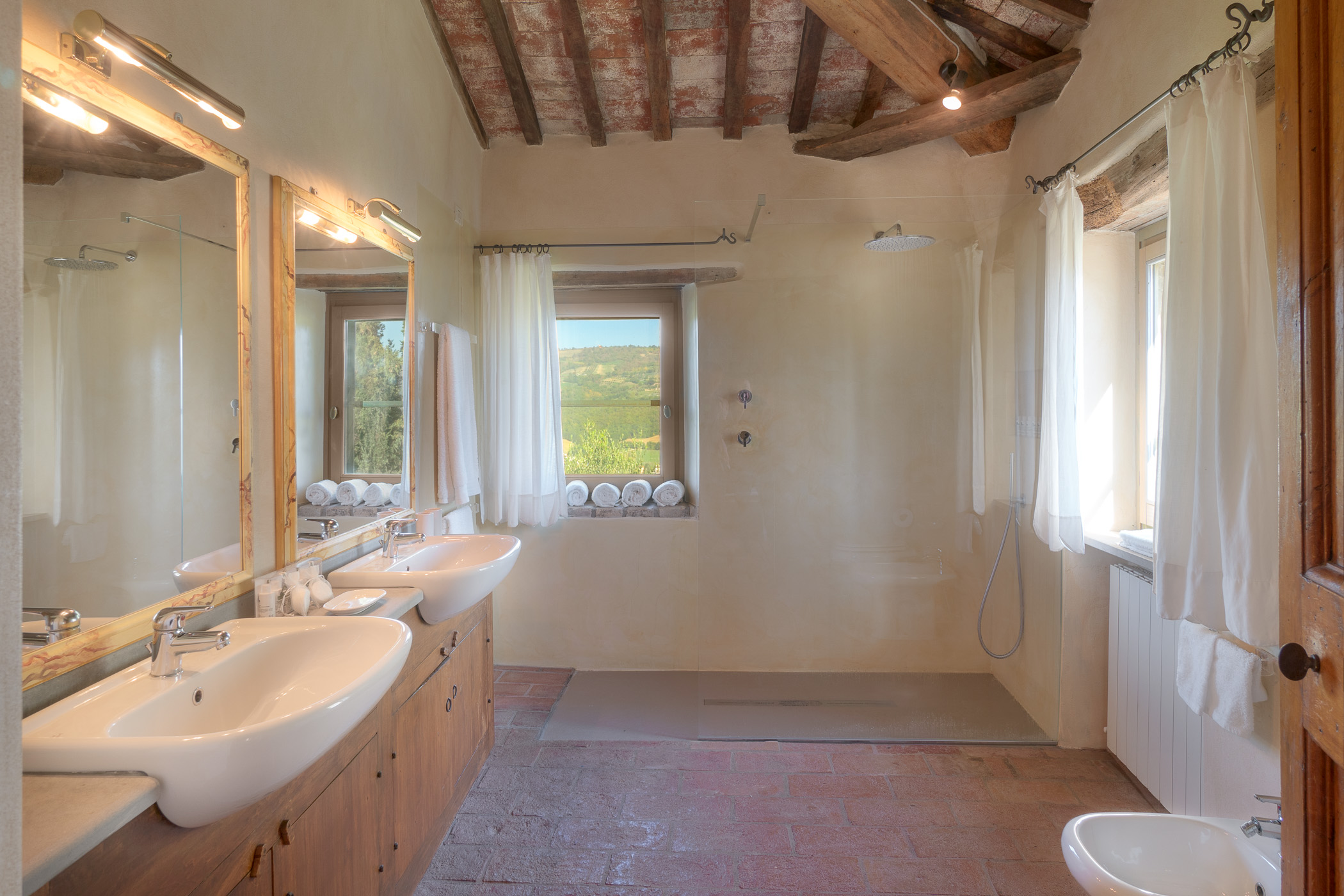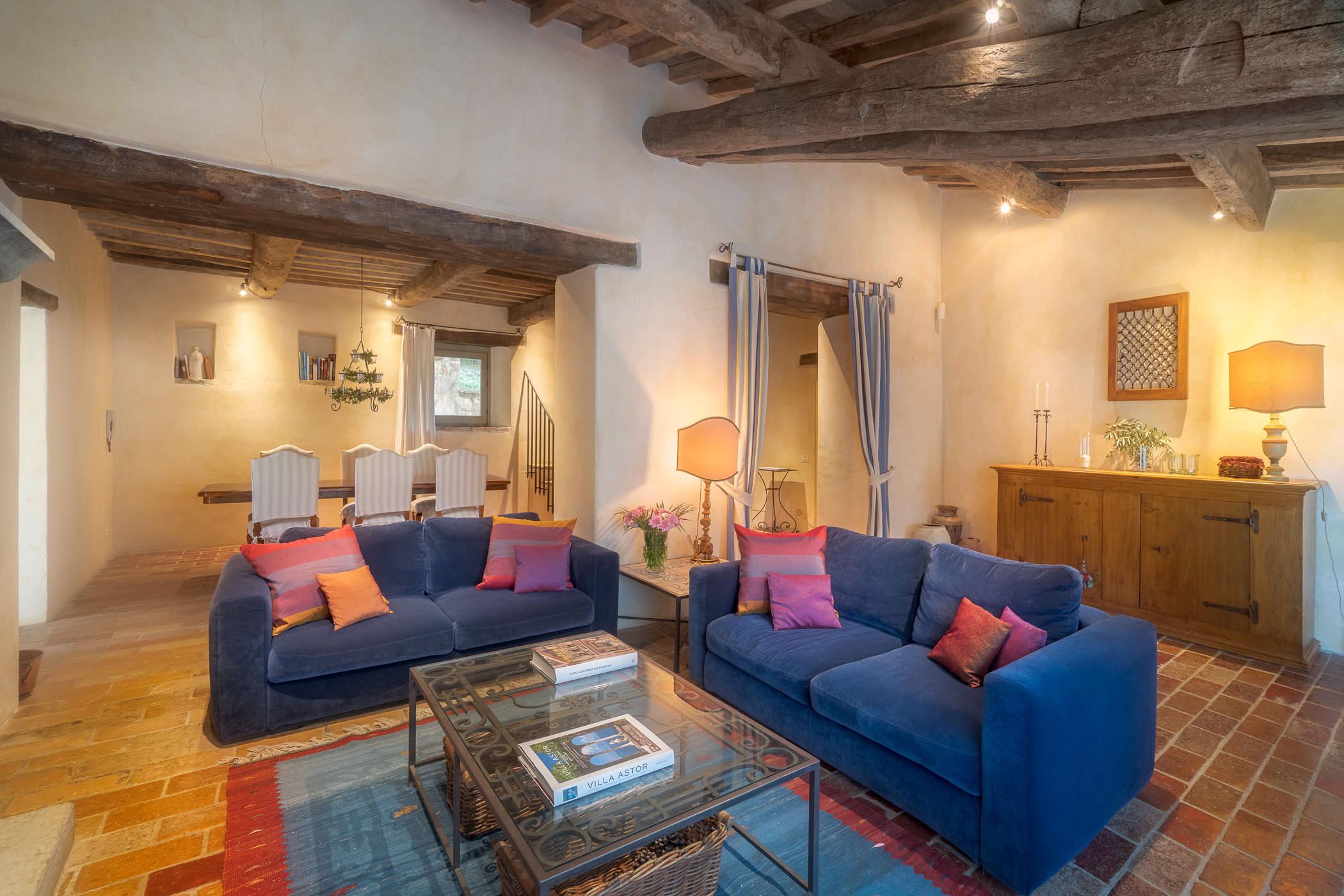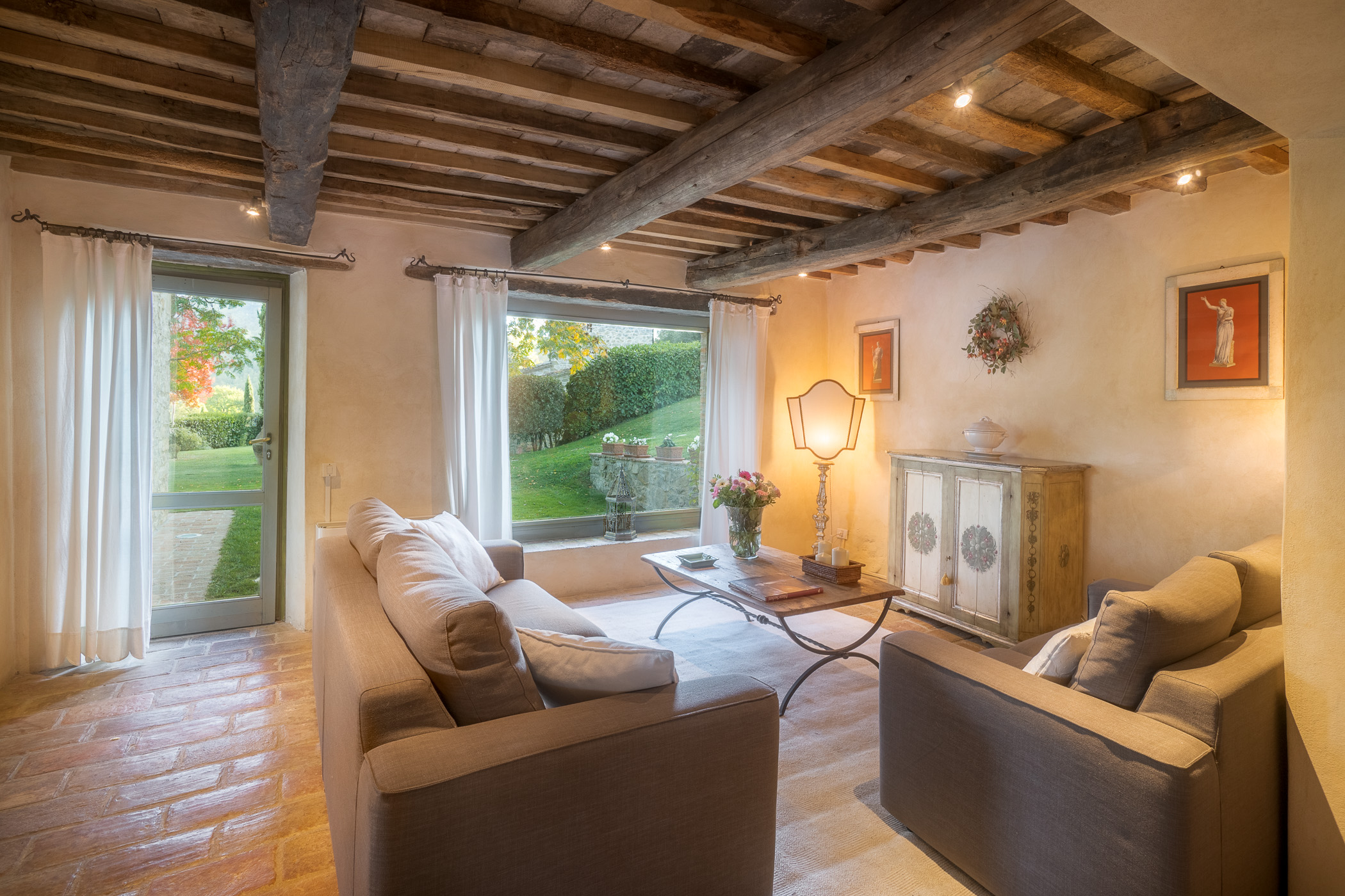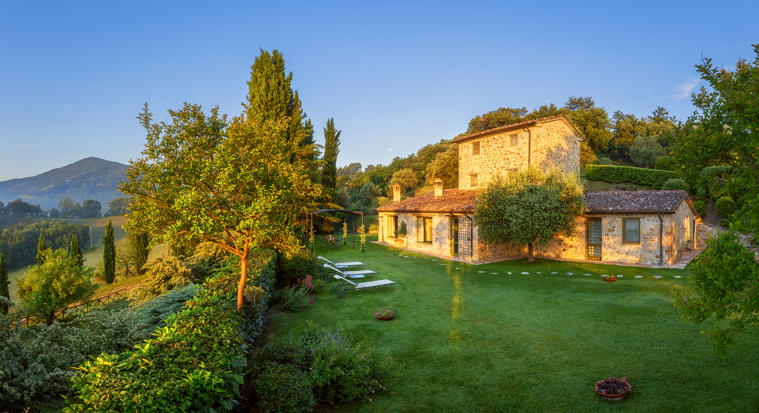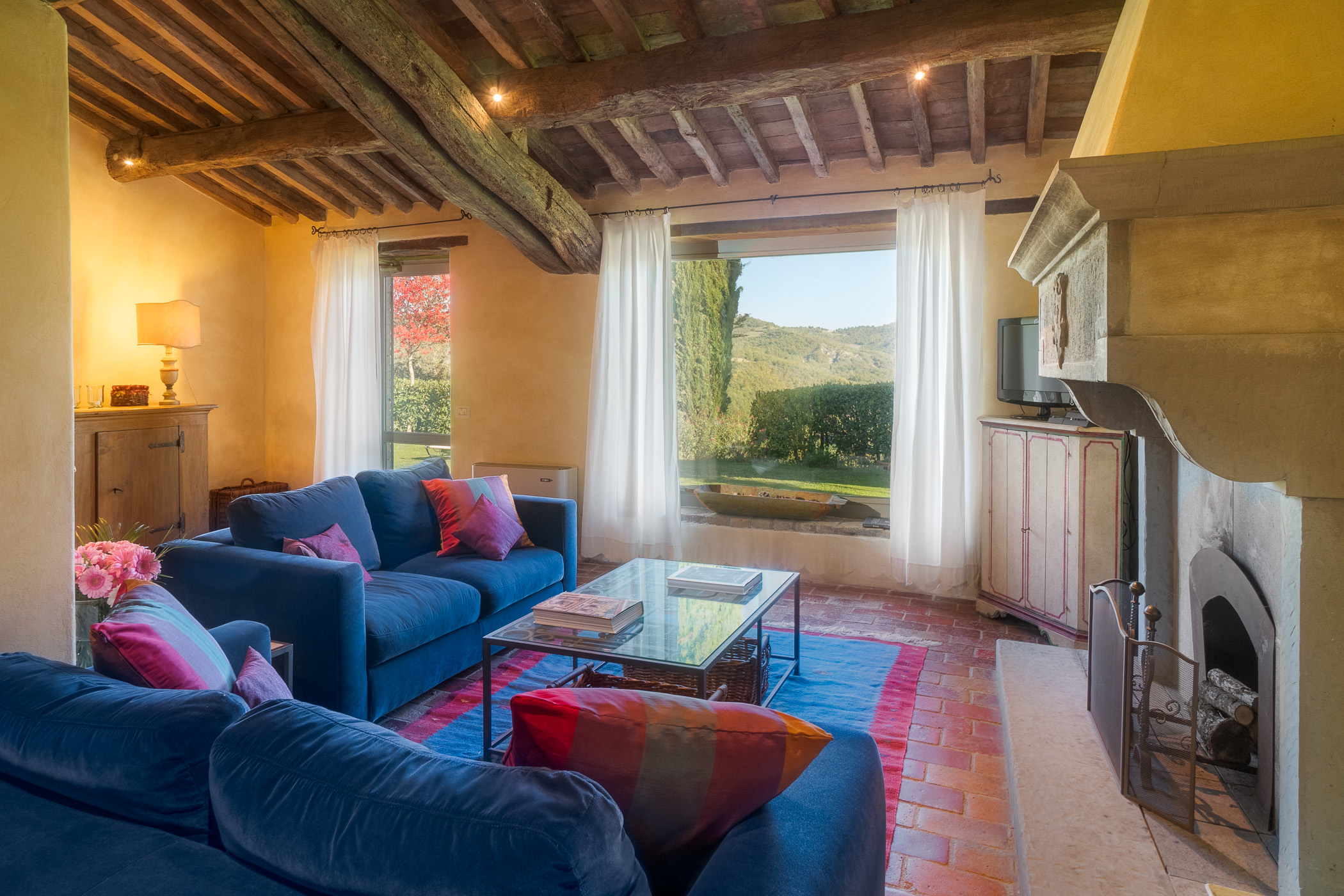 Large picture windows in the living areas of both houses maximize the enjoyment of the rolling Umbrian hills, the owners having taken their inspiration from the spectacular vistas all around, and the regular dramatic sunsets on offer. They have carefully restored both properties to the same high standard, with attractive décor throughout and using prestigious materials: antique doors, 18th Century oak-beamed ceilings, stone fireplaces and old terracotta floors. The property has been tastefully yet comfortably furnished with some beautiful antiques and quality furnishings.