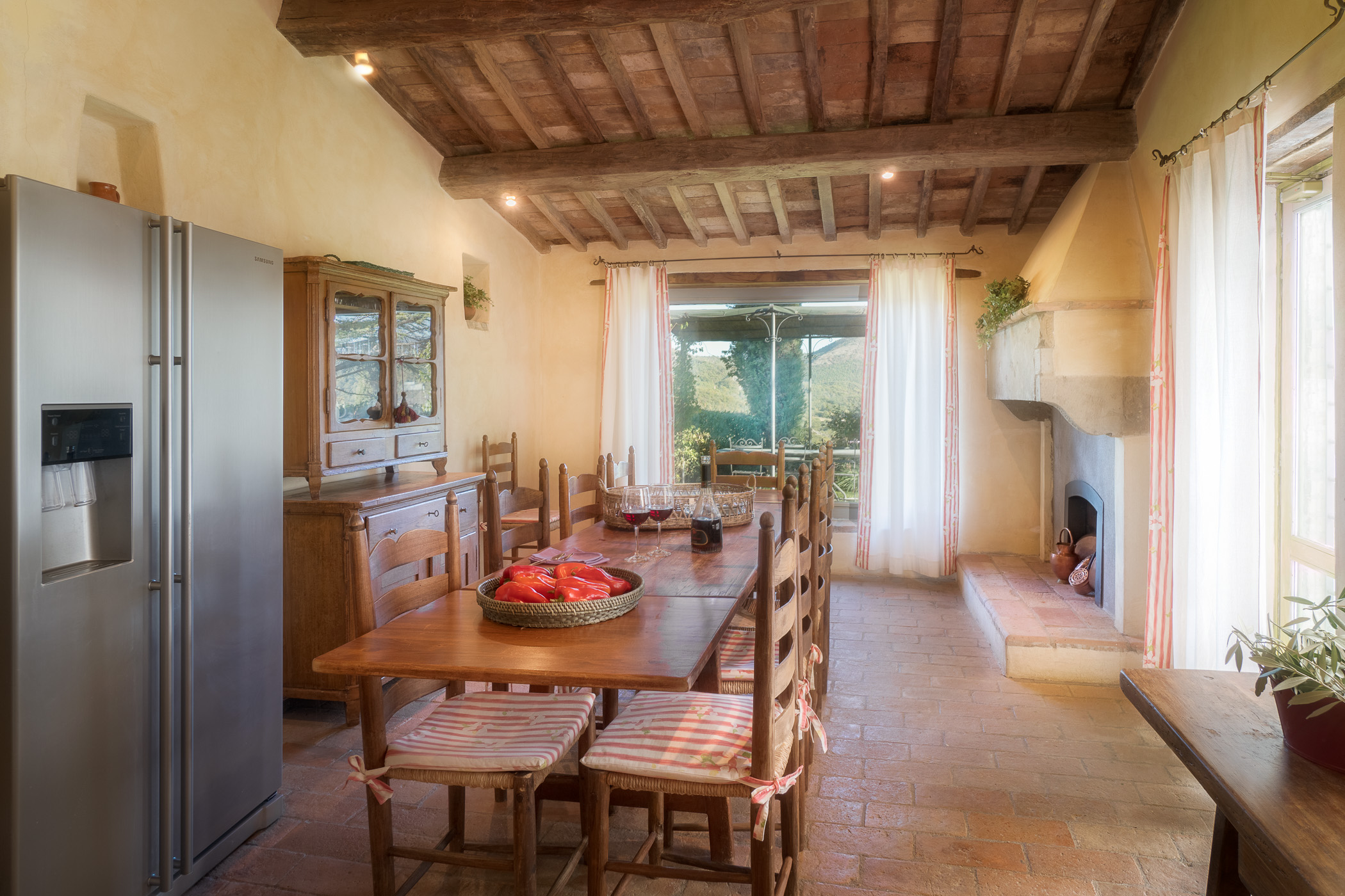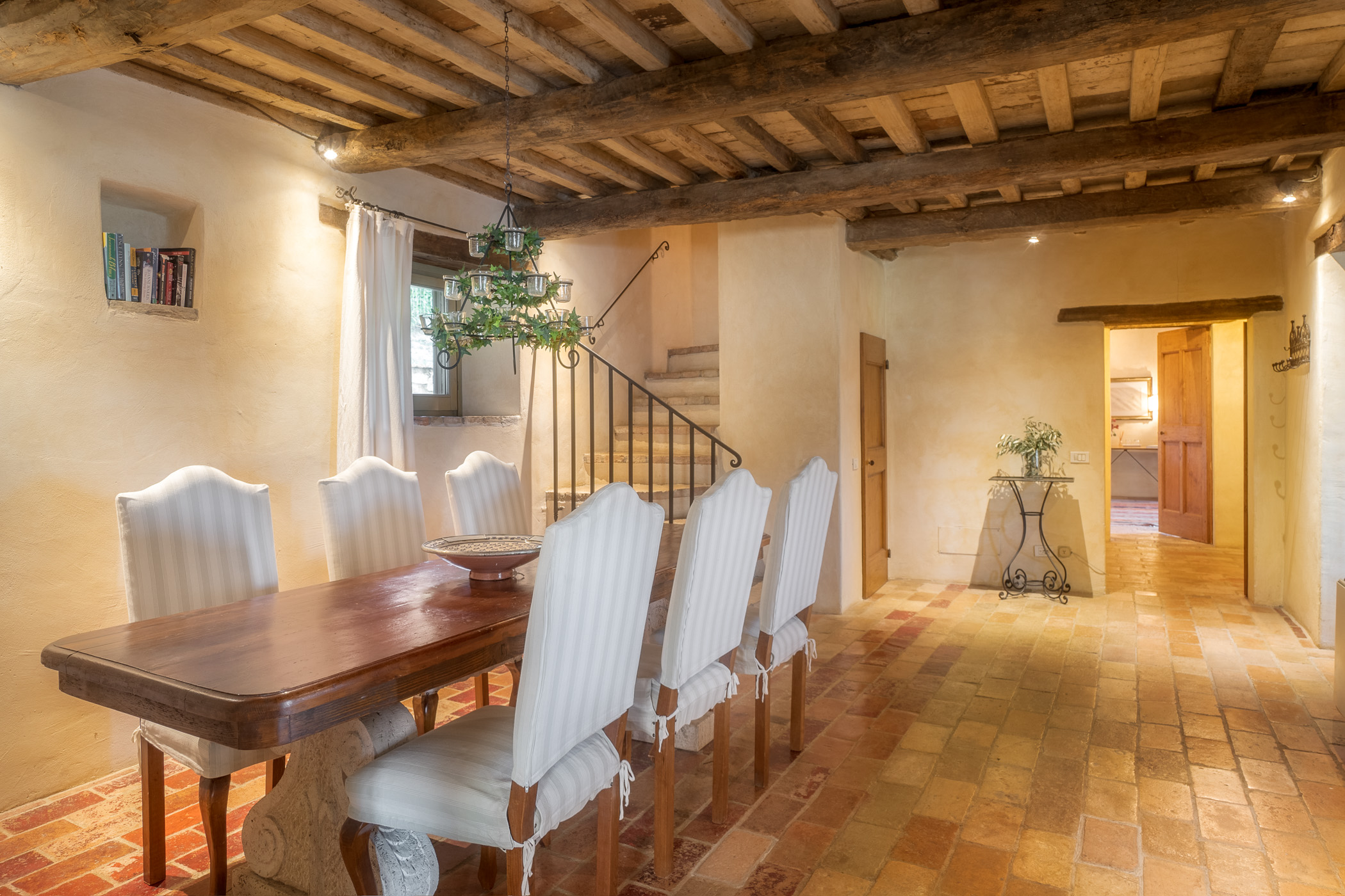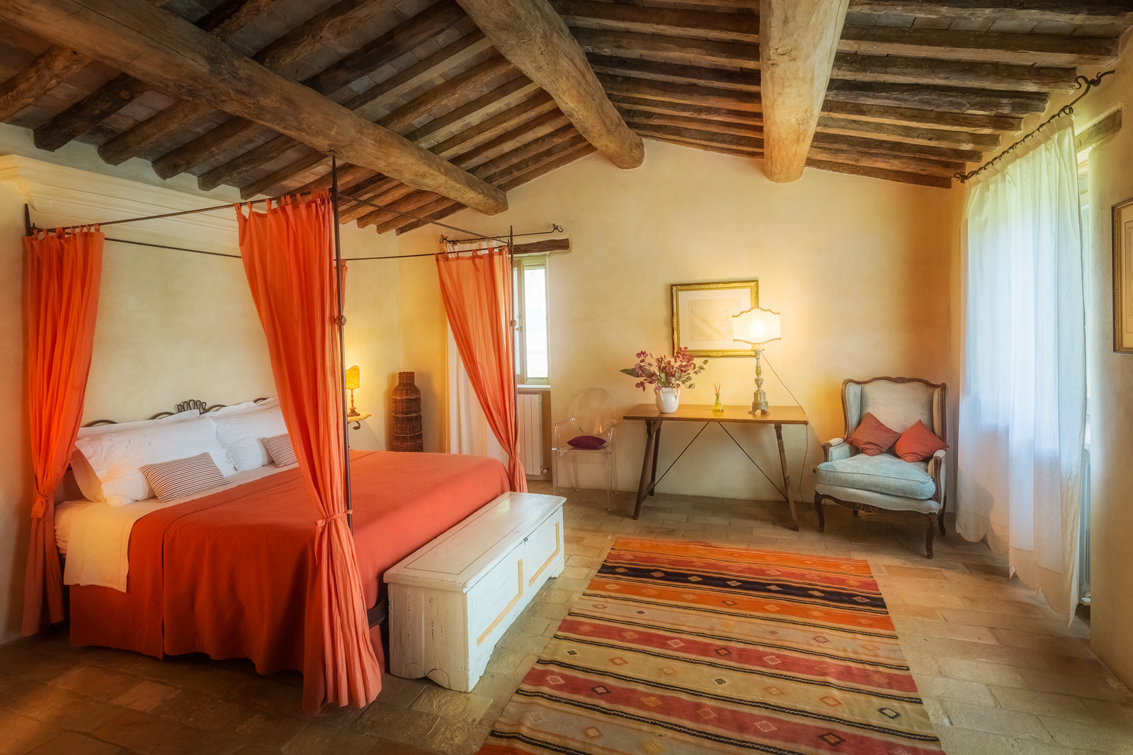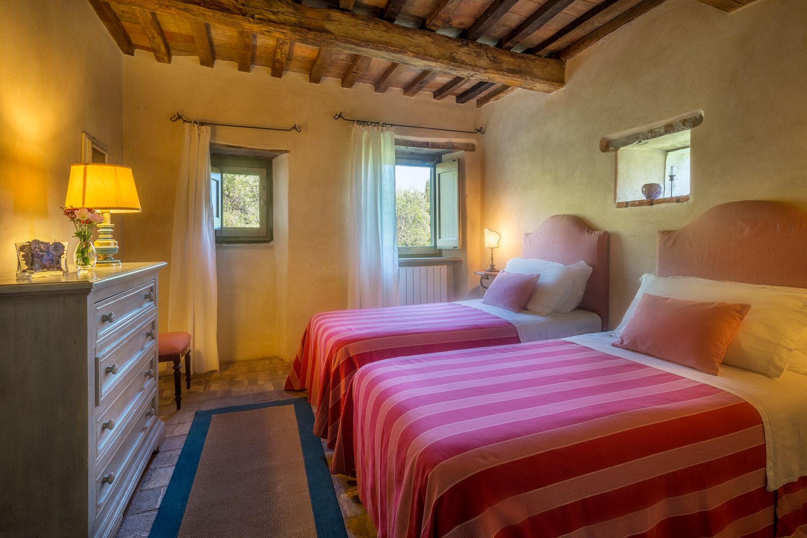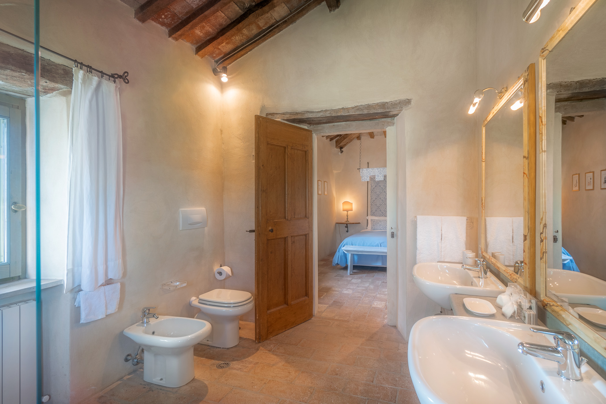 Large picture windows in the living areas of both houses maximize the enjoyment of the rolling Umbrian hills, the owners having taken their inspiration from the spectacular vistas all around, and the regular dramatic sunsets on offer. They have carefully restored both properties to the same high standard, with attractive décor throughout and using prestigious materials: antique doors, 18th Century oak-beamed ceilings, stone fireplaces and old terracotta floors. The property has been tastefully yet comfortably furnished with some beautiful antiques and quality furnishings.