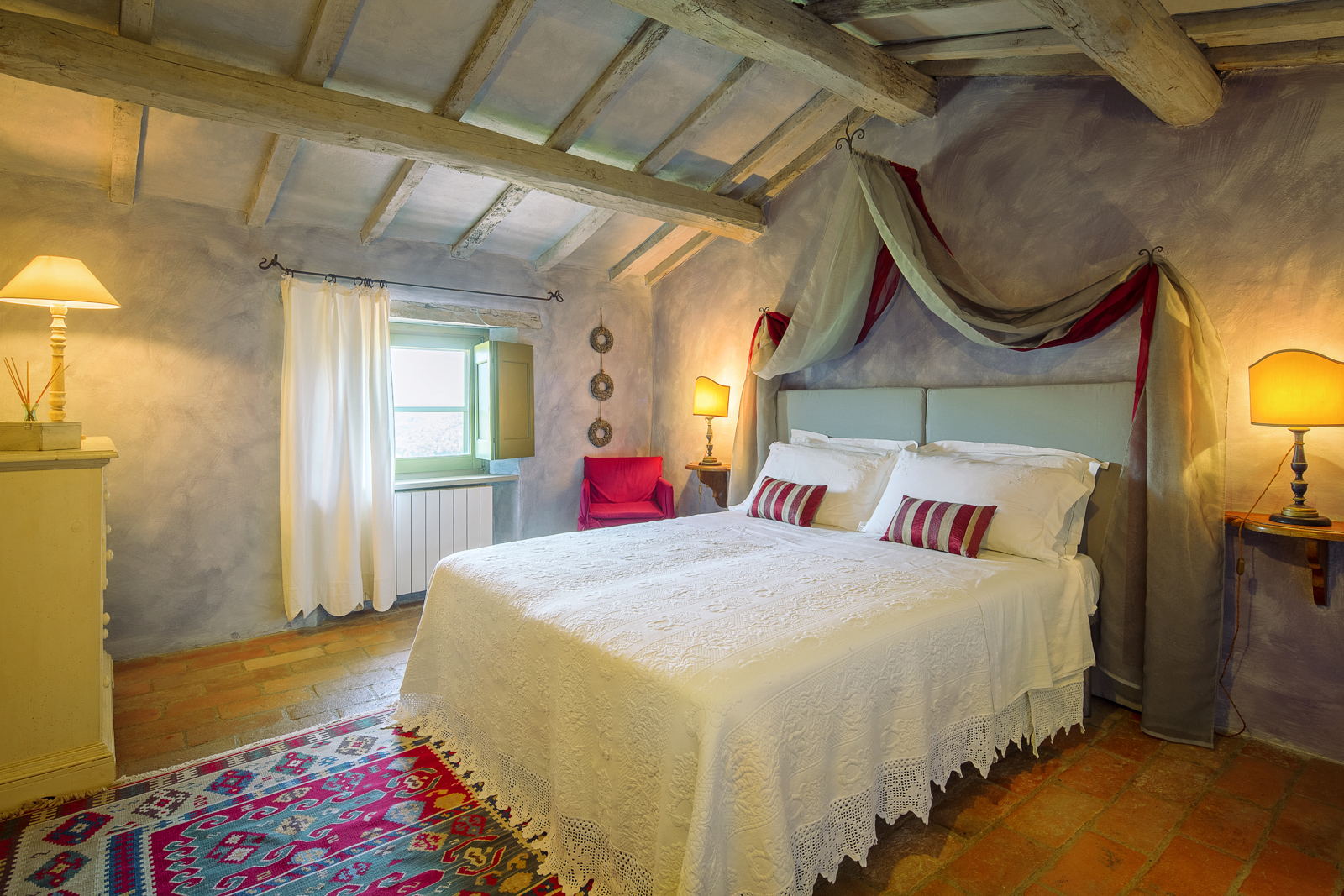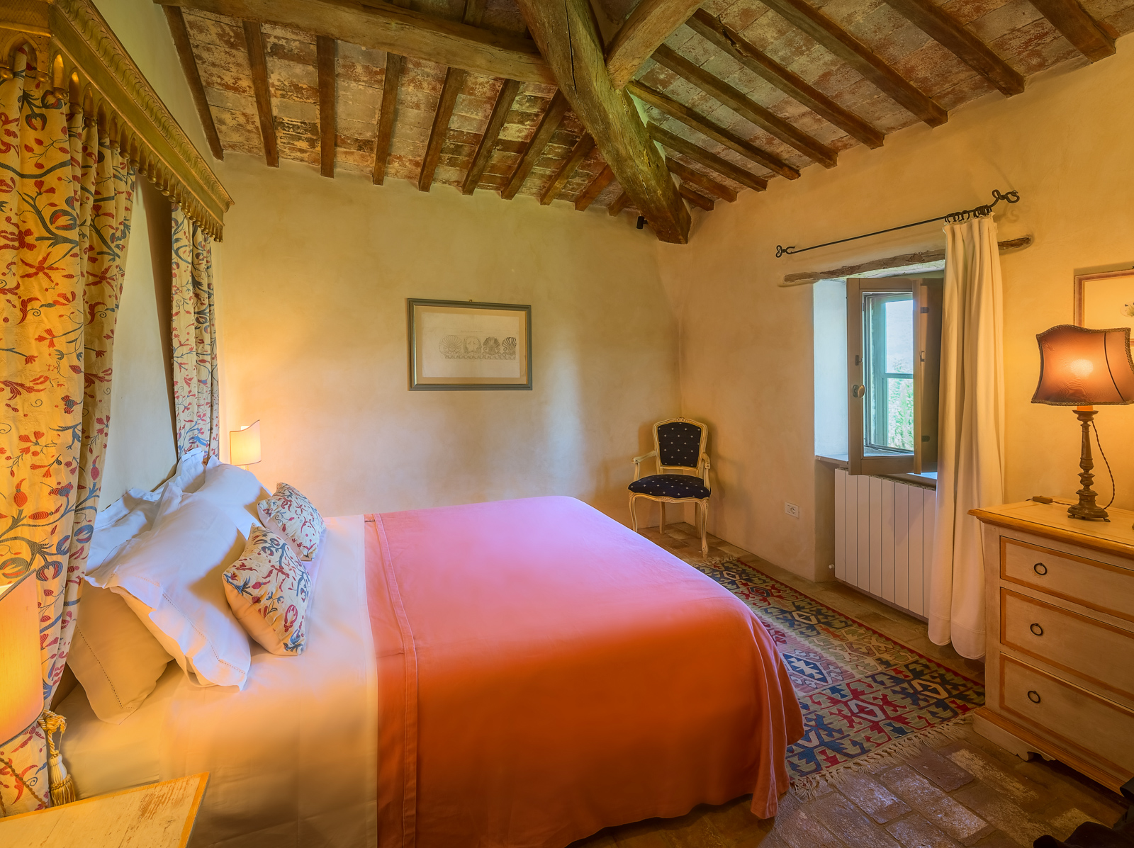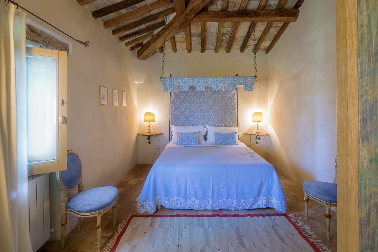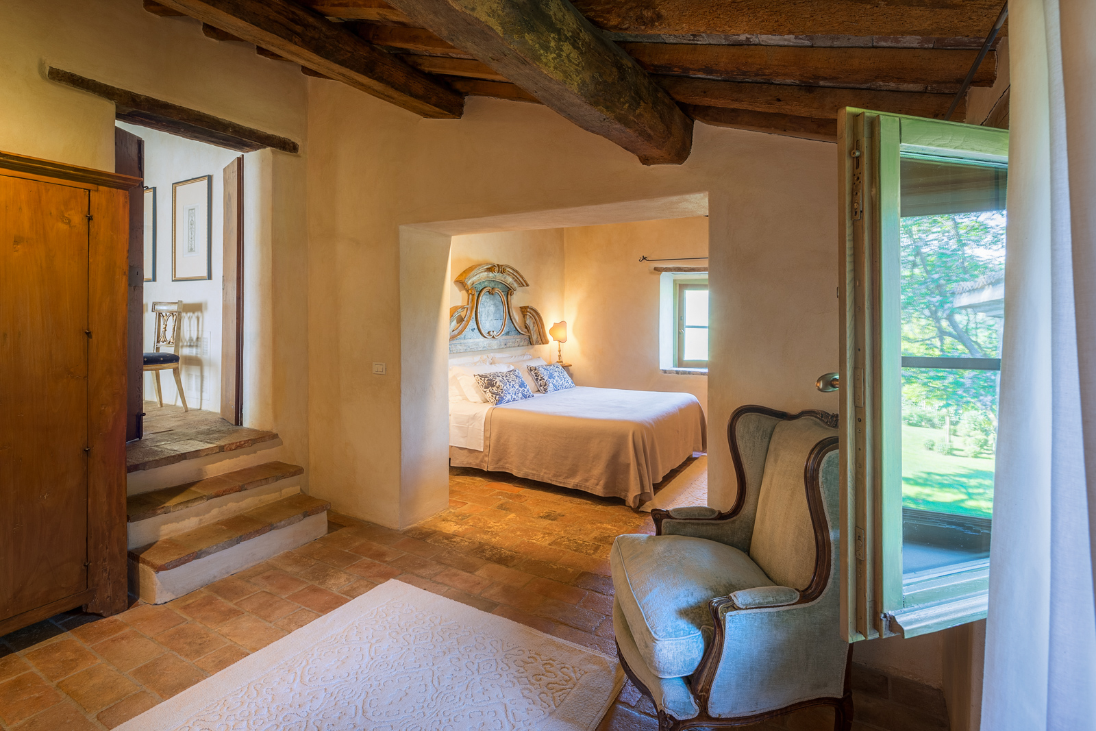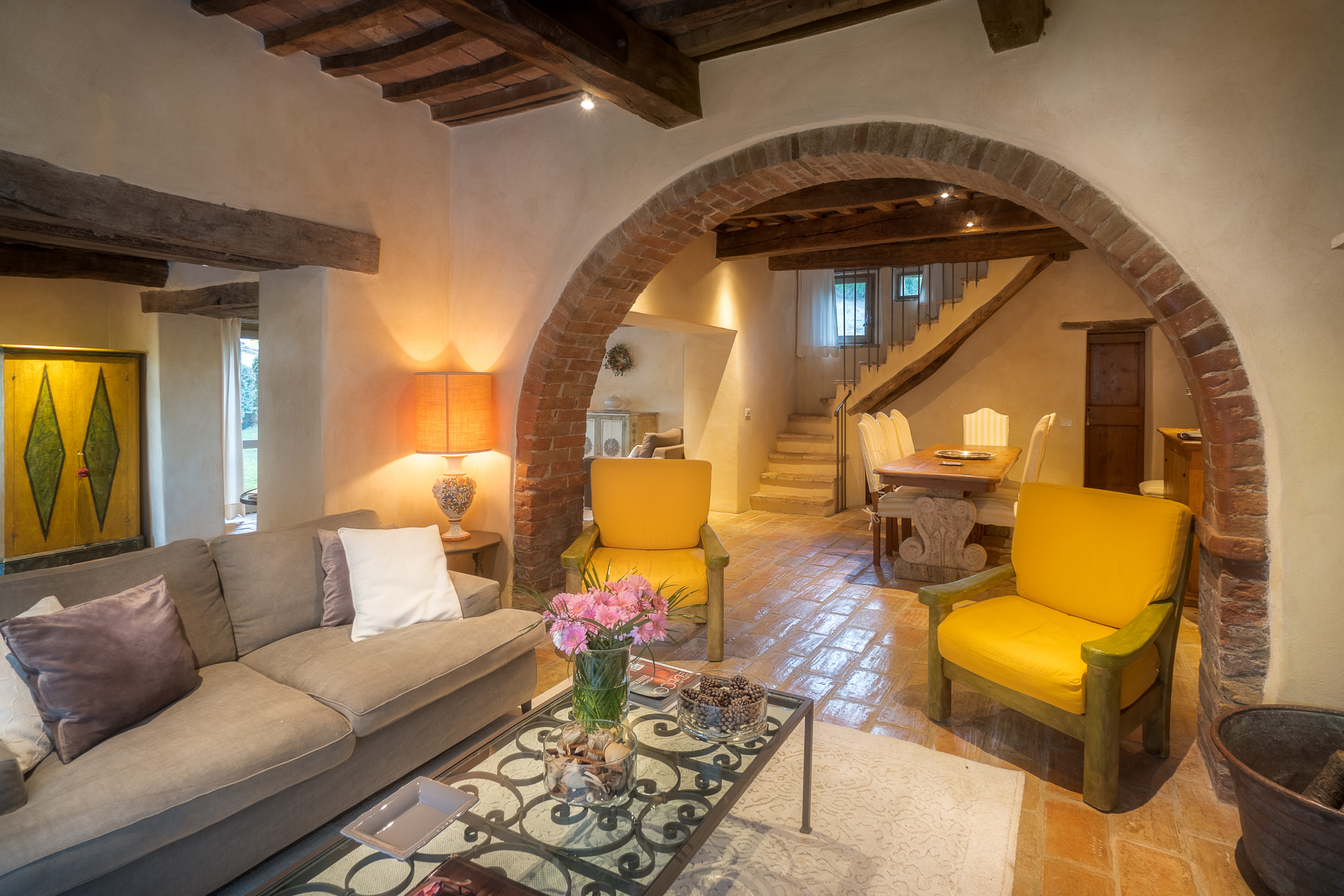 Large picture windows in the living areas of both houses maximize the enjoyment of the rolling Umbrian hills, the owners having taken their inspiration from the spectacular vistas all around, and the regular dramatic sunsets on offer. They have carefully restored both properties to the same high standard, with attractive décor throughout and using prestigious materials: antique doors, 18th Century oak-beamed ceilings, stone fireplaces and old terracotta floors. The property has been tastefully yet comfortably furnished with some beautiful antiques and quality furnishings.