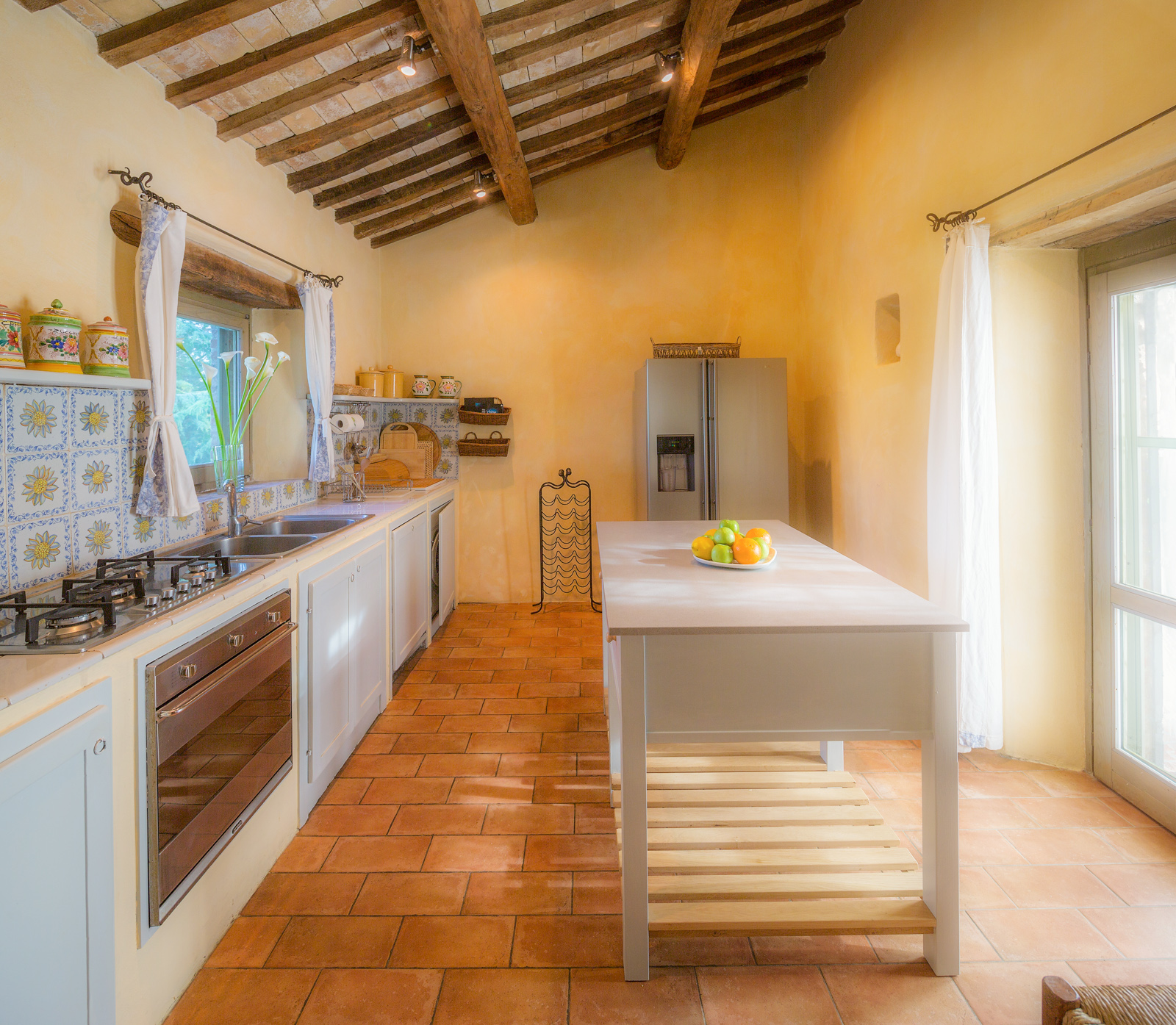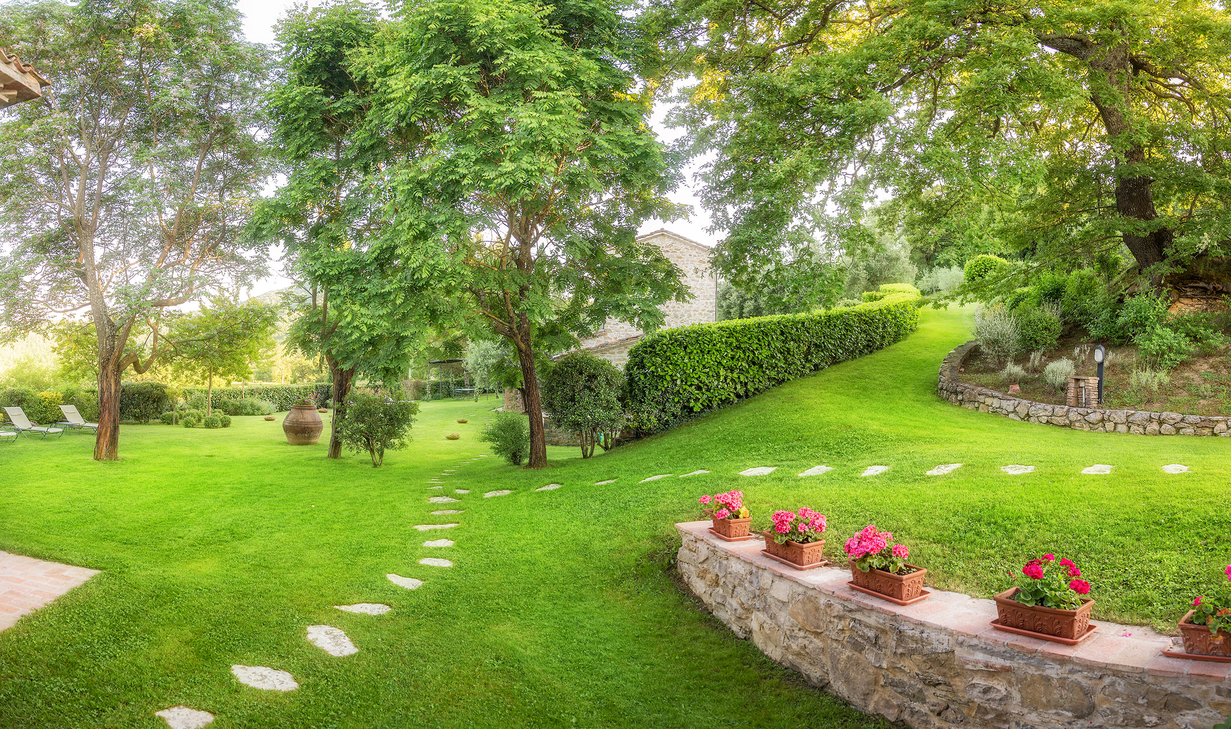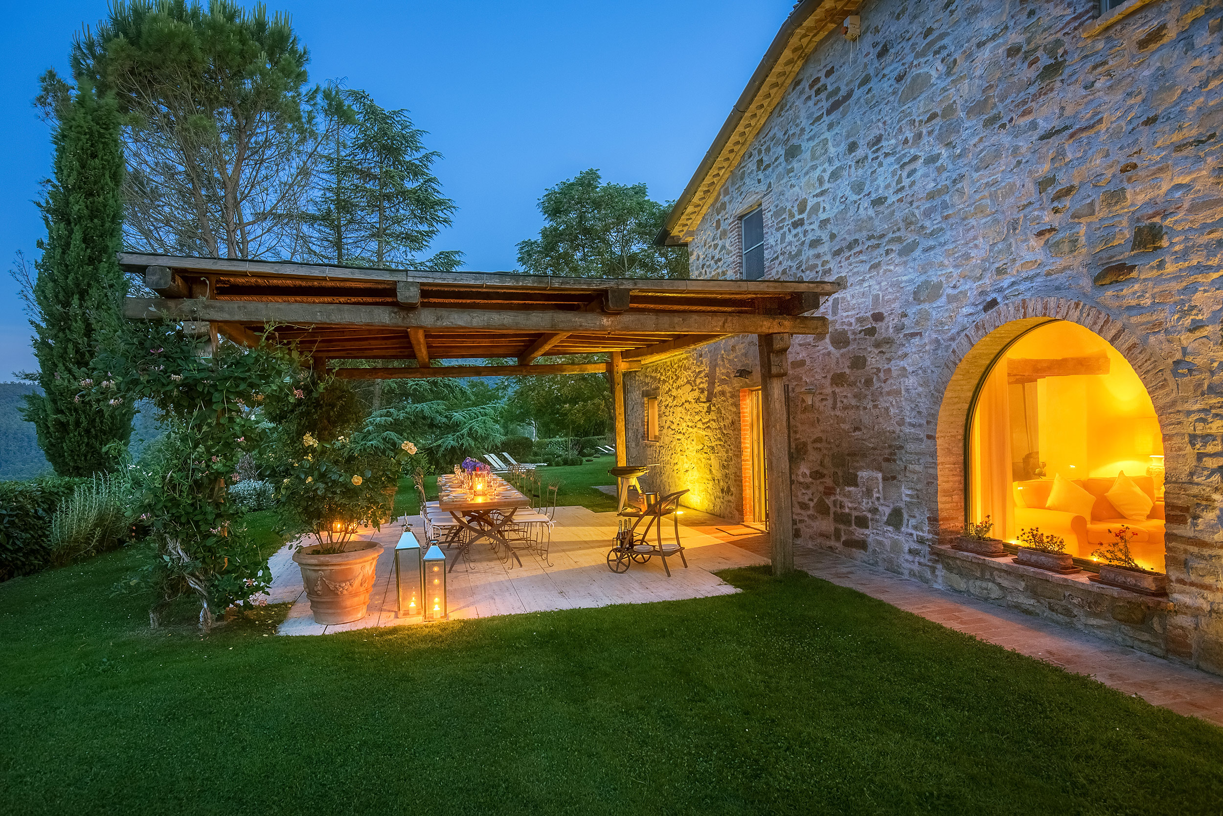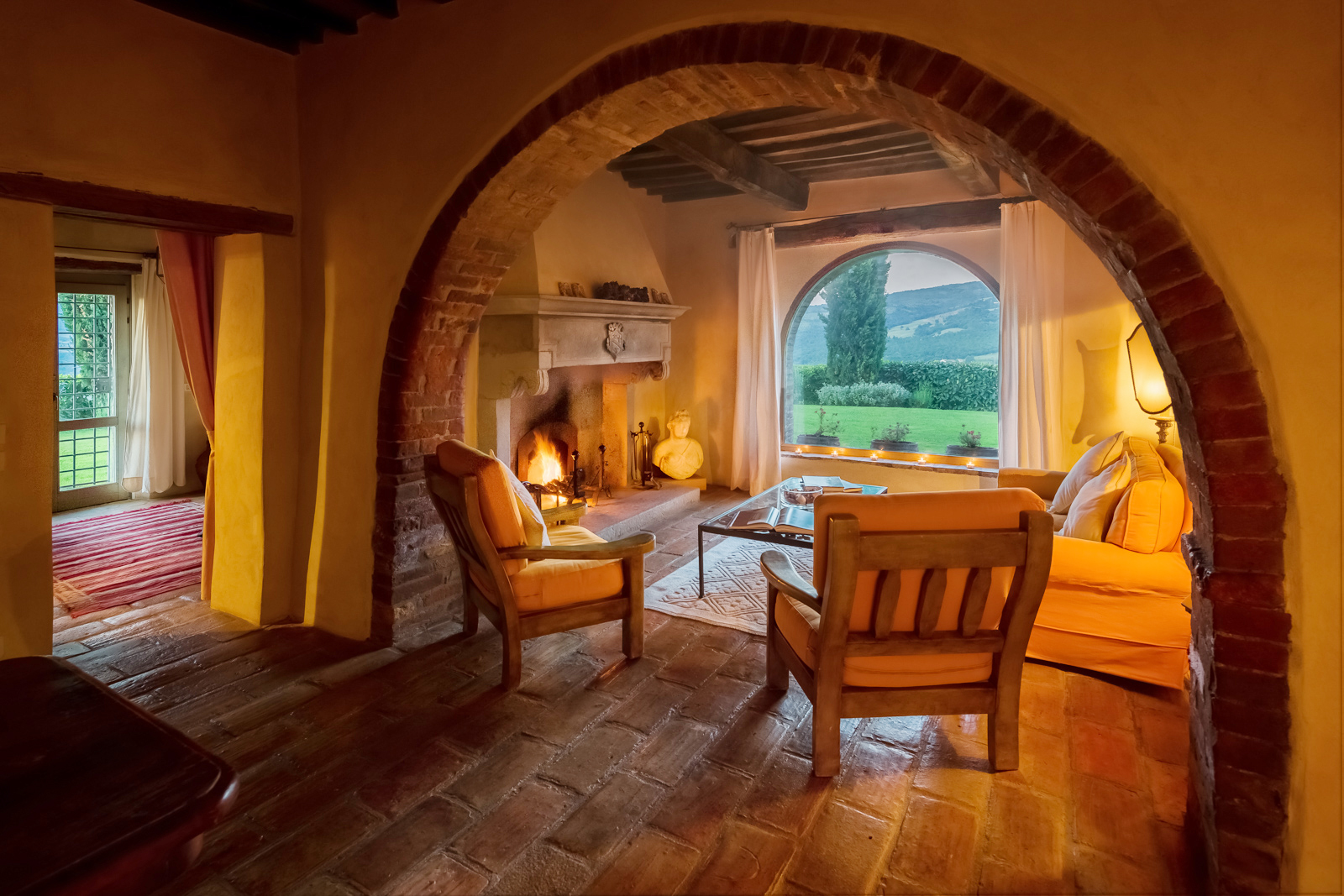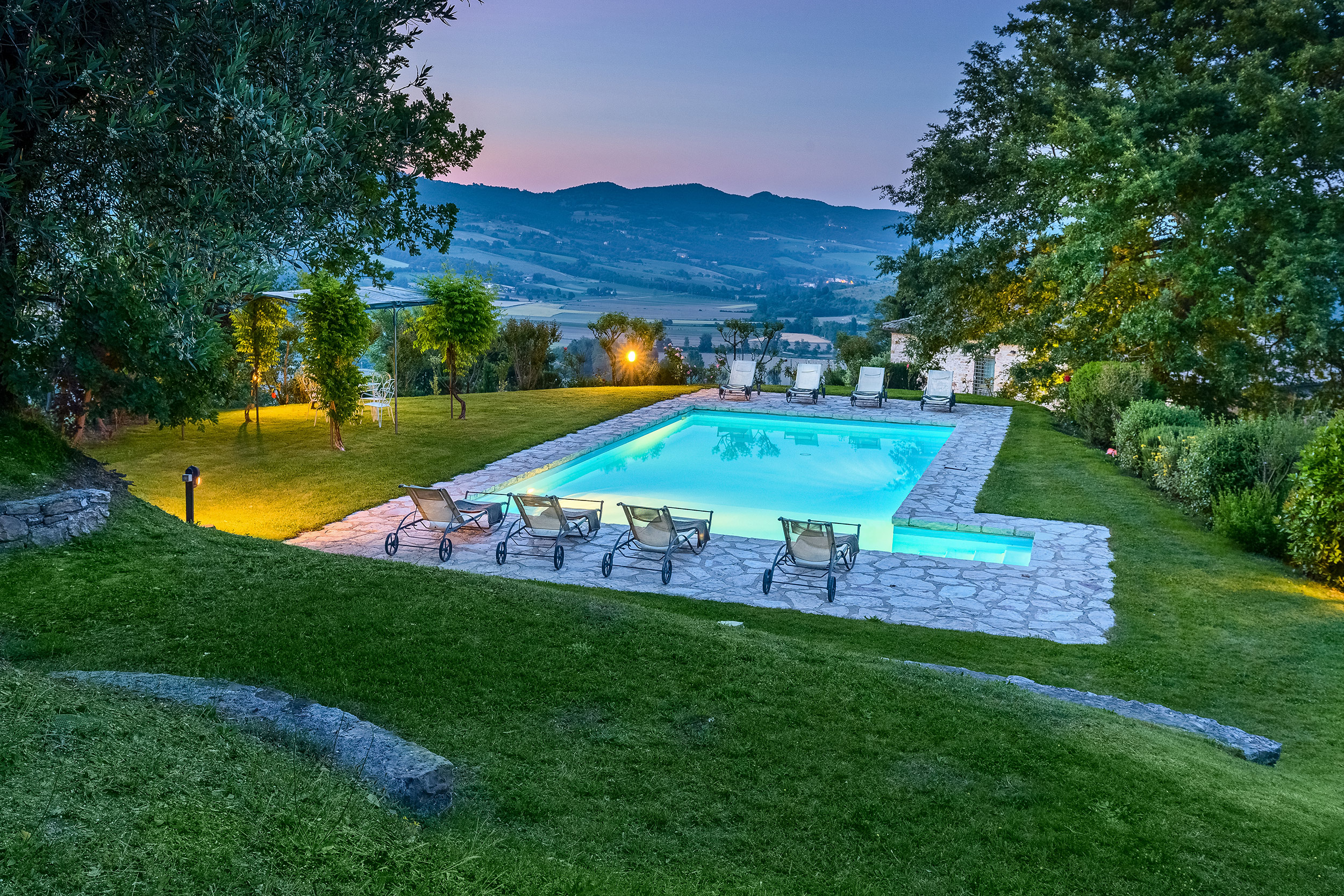 Large picture windows in the living areas of both houses maximize the enjoyment of the rolling Umbrian hills, the owners having taken their inspiration from the spectacular vistas all around, and the regular dramatic sunsets on offer. They have carefully restored both properties to the same high standard, with attractive décor throughout and using prestigious materials: antique doors, 18th Century oak-beamed ceilings, stone fireplaces and old terracotta floors. The property has been tastefully yet comfortably furnished with some beautiful antiques and quality furnishings.