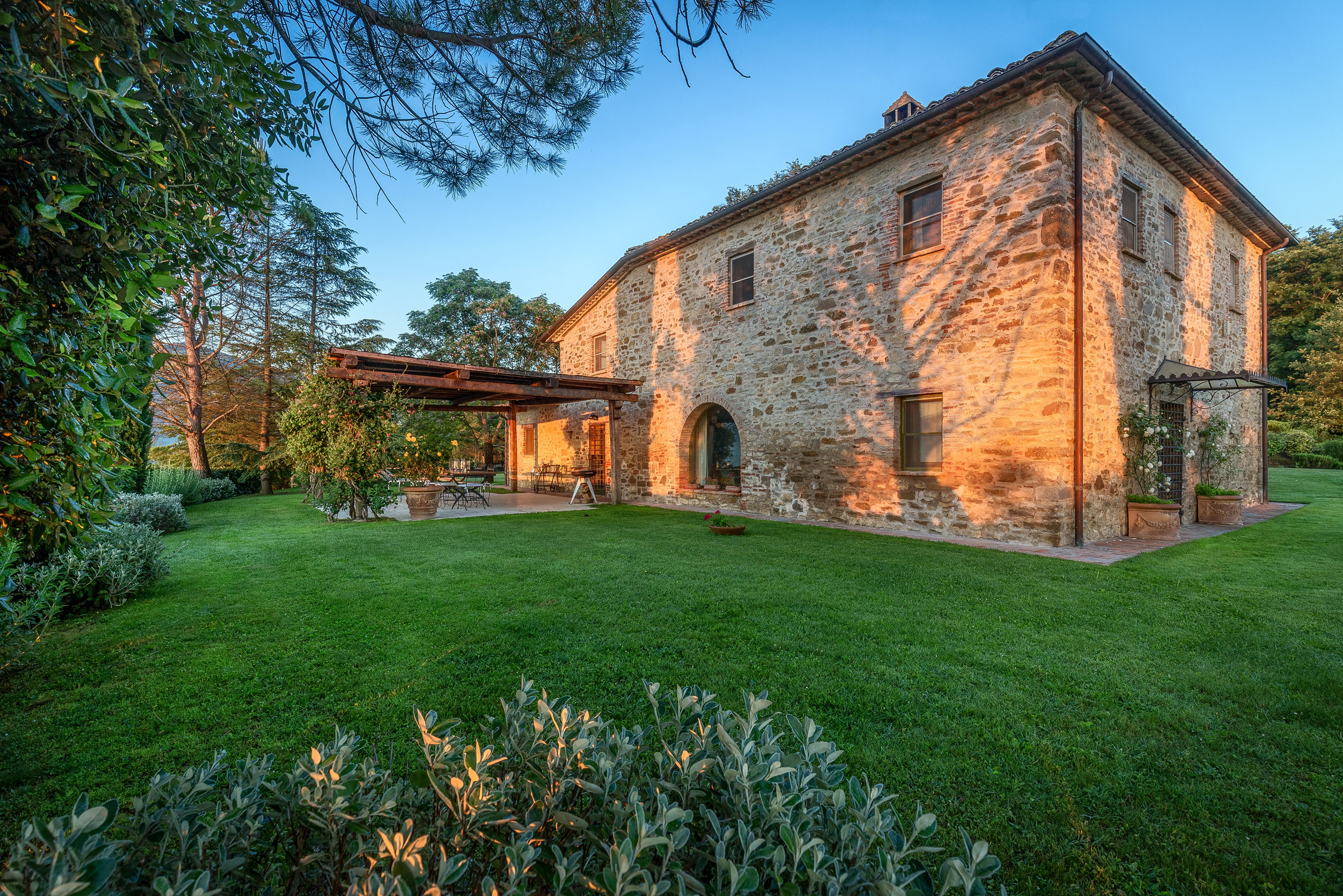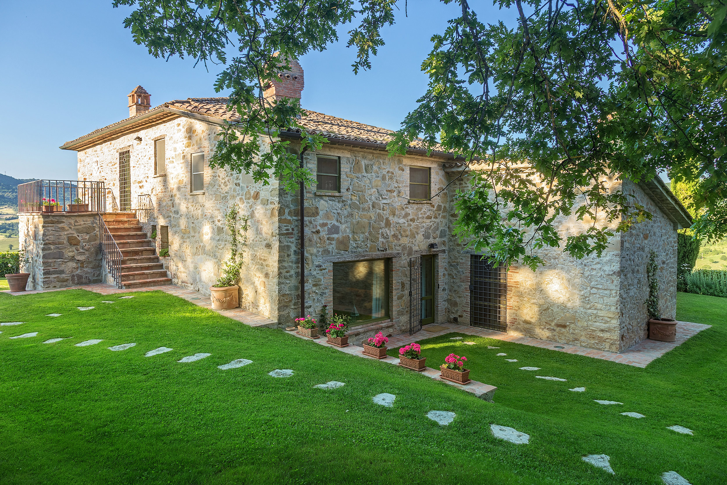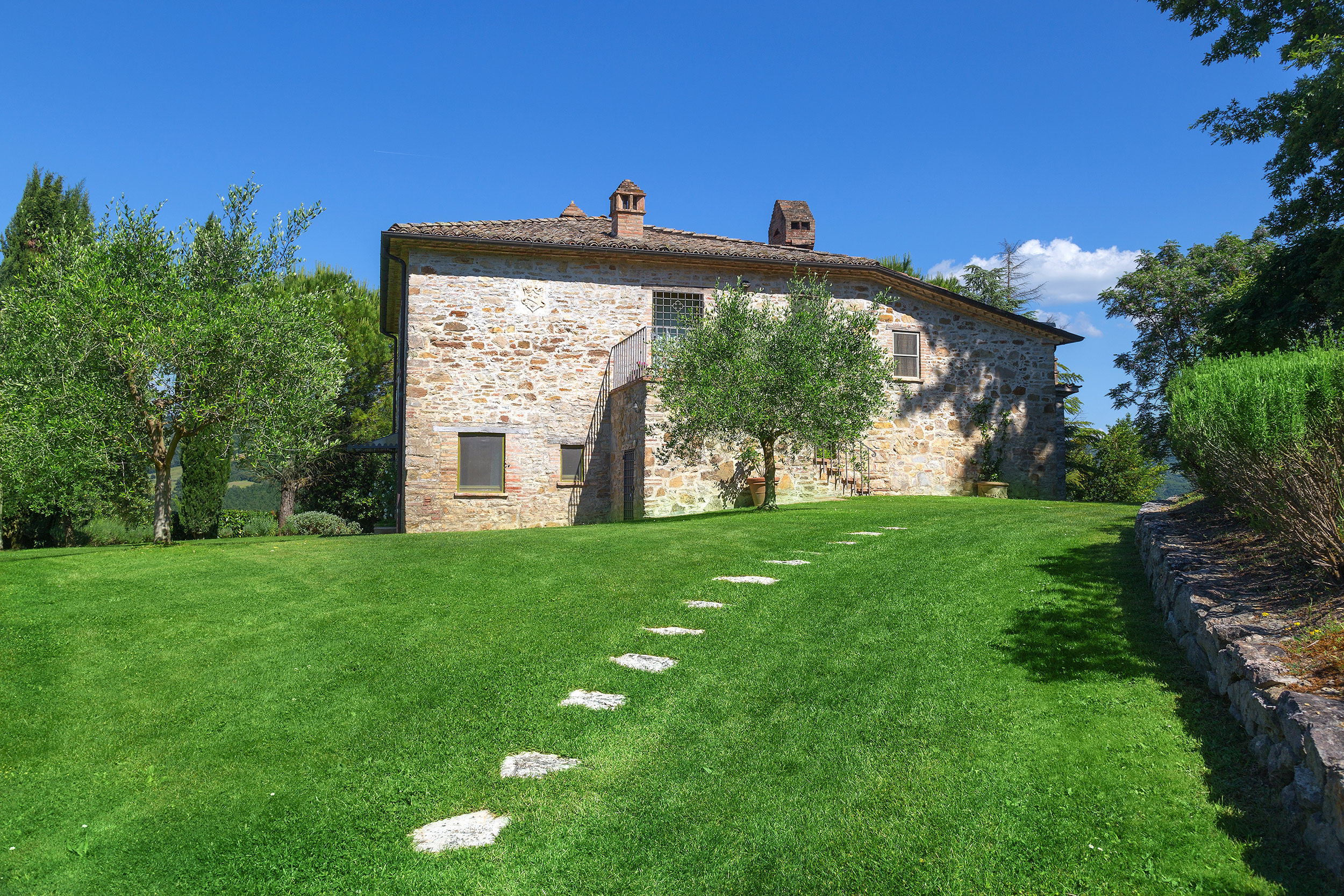 Only a stone's throw from the Tuscan border, it peers down over the famous Tuscan landscape from its perch on the top of a hill, offering luxury in an exceptional setting. It comprises a large stone farmhouse (main villa) and its annex (guest house) just 40 metres/0,02 miles away. Each house has its own driveway and parking area.
