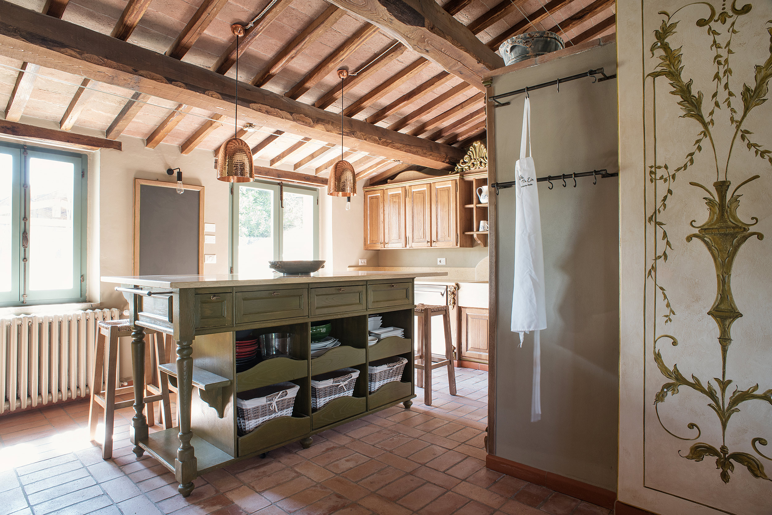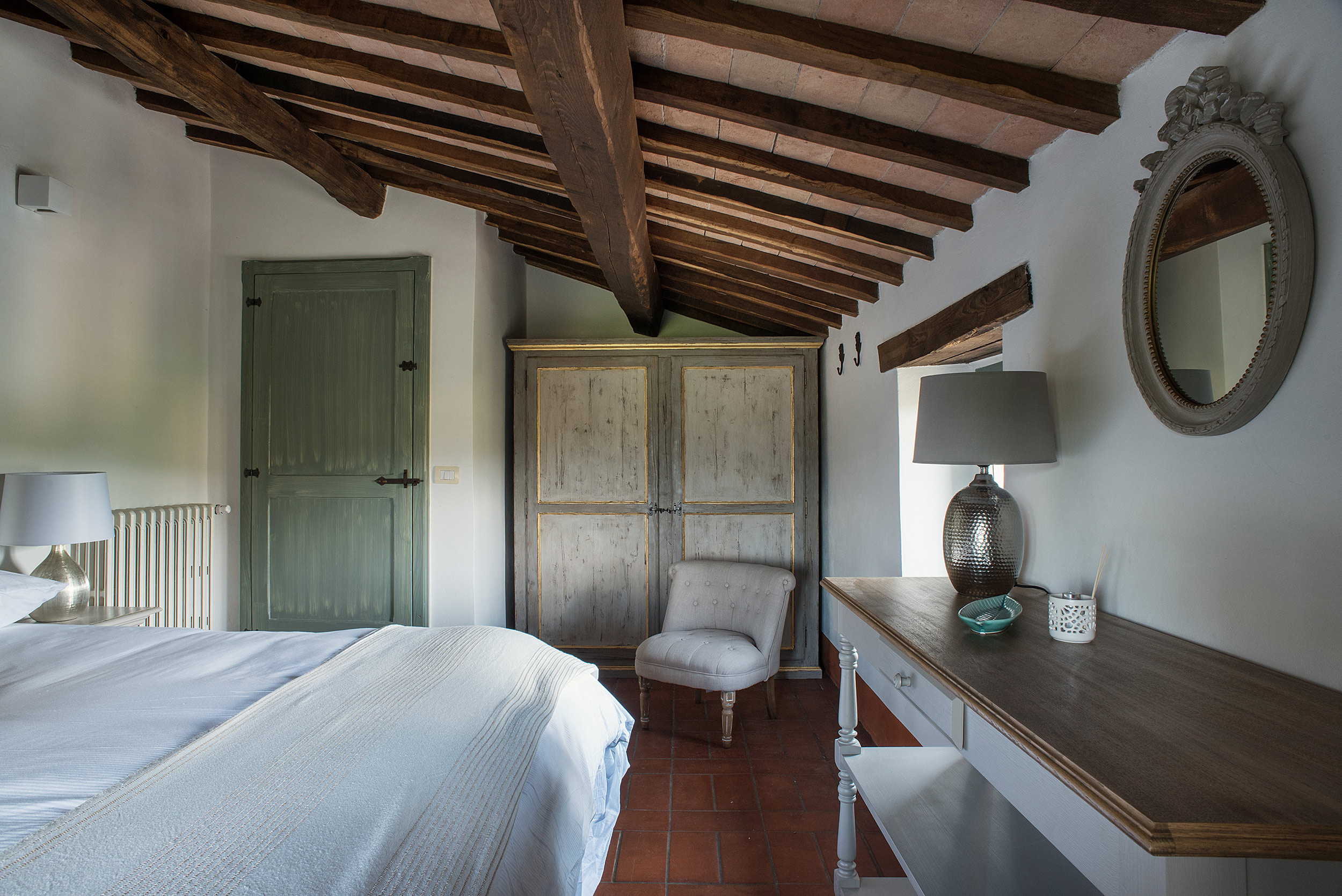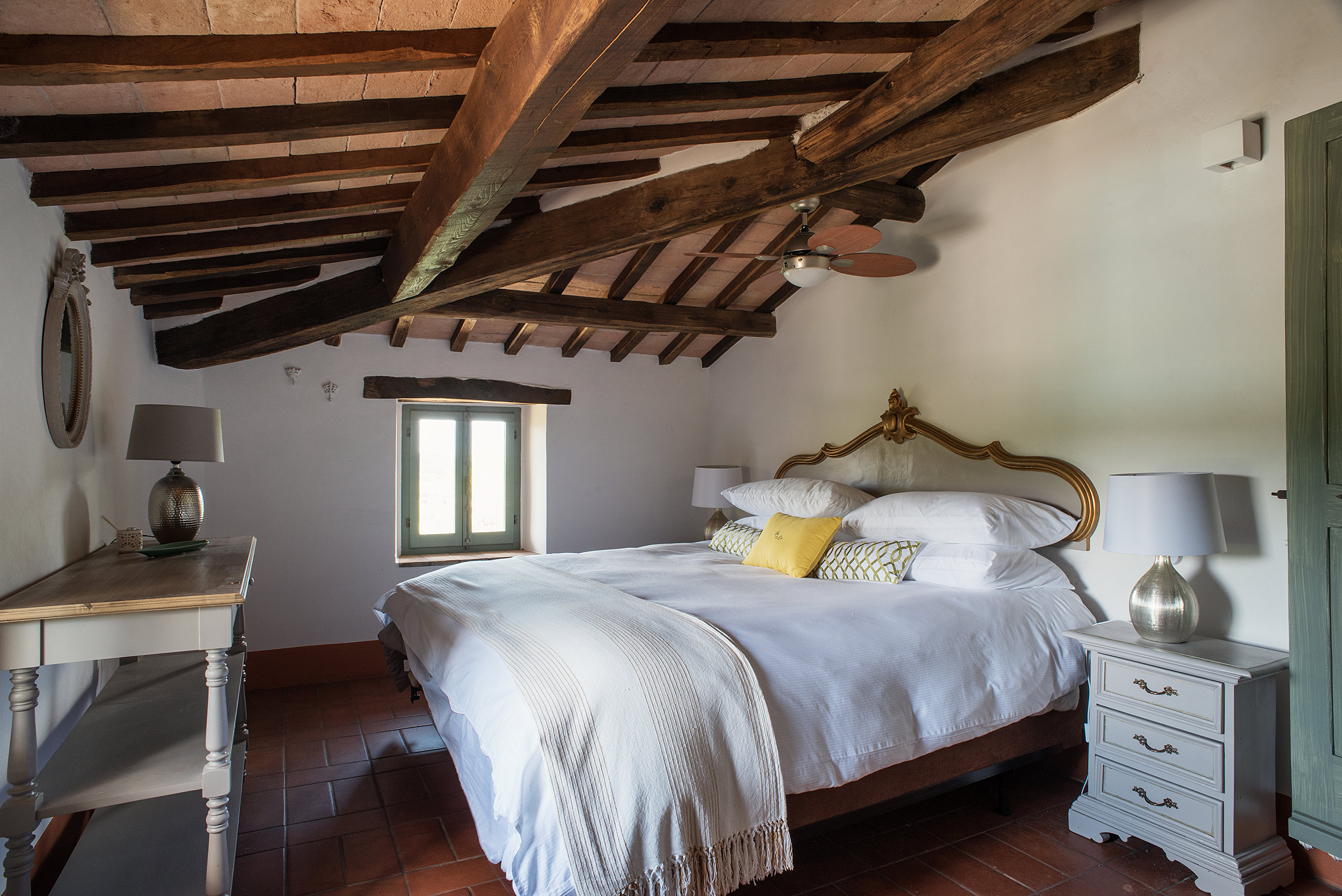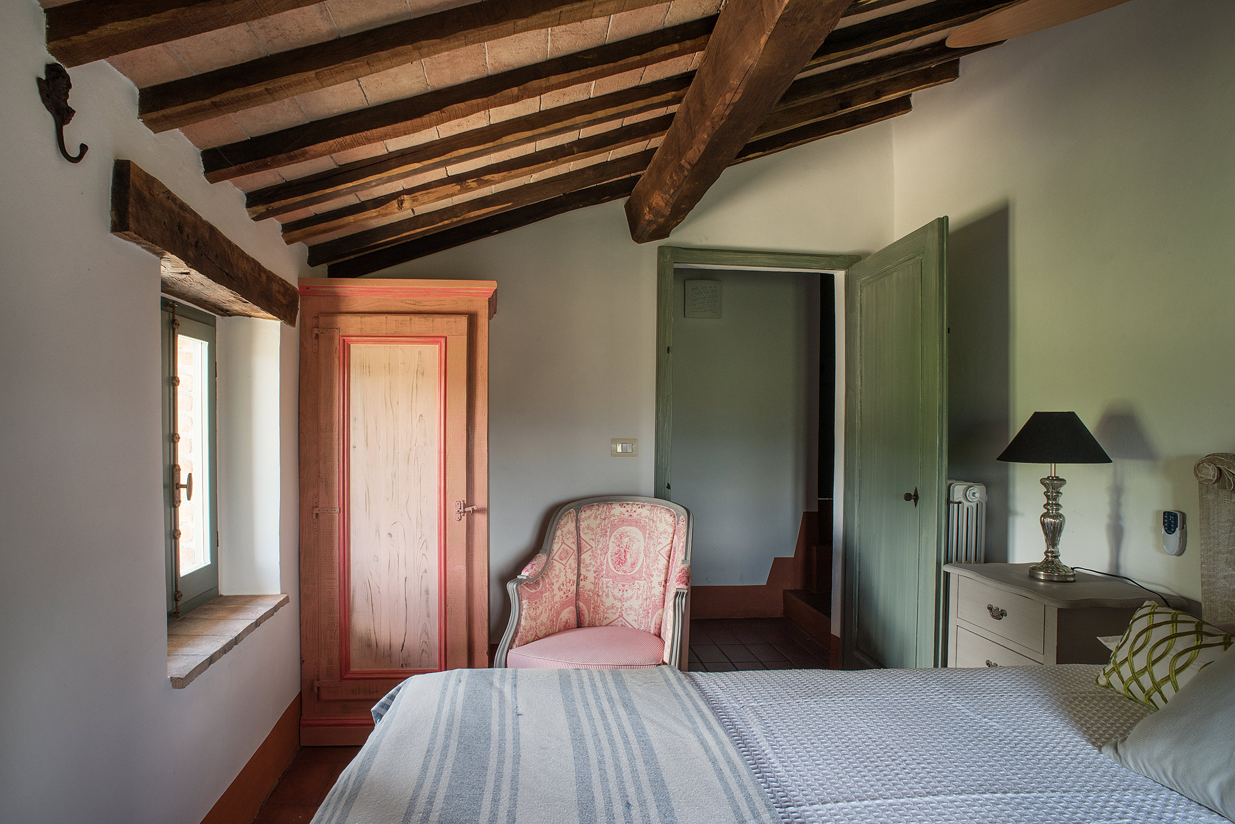 Halfway you find Villa da Eva, an elegant stone built farmhouse recently renovated with six bedrooms, spread over 350 square meters. A private unpaved stone gravel road framed by tall cypress trees awaits you and leads you to the gated entrance of a traditional 19th century Umbrian home resplendent with the elegance of stone, wood and terracotta. In a meticulously restored area, Villa da Eva can easily host eight to twelve guests. The subdivision of the rooms allows you to live independently in the two parts of the villa, each with its own kitchen and living room. It is the ideal space that allows, for example, two families to have private living rooms while sharing the rest of the villa, gathering at the big dining table in the main kitchen, or eating outdoors all together under the pergola.
