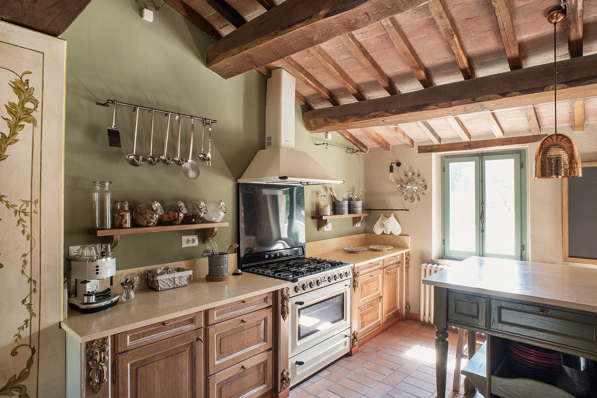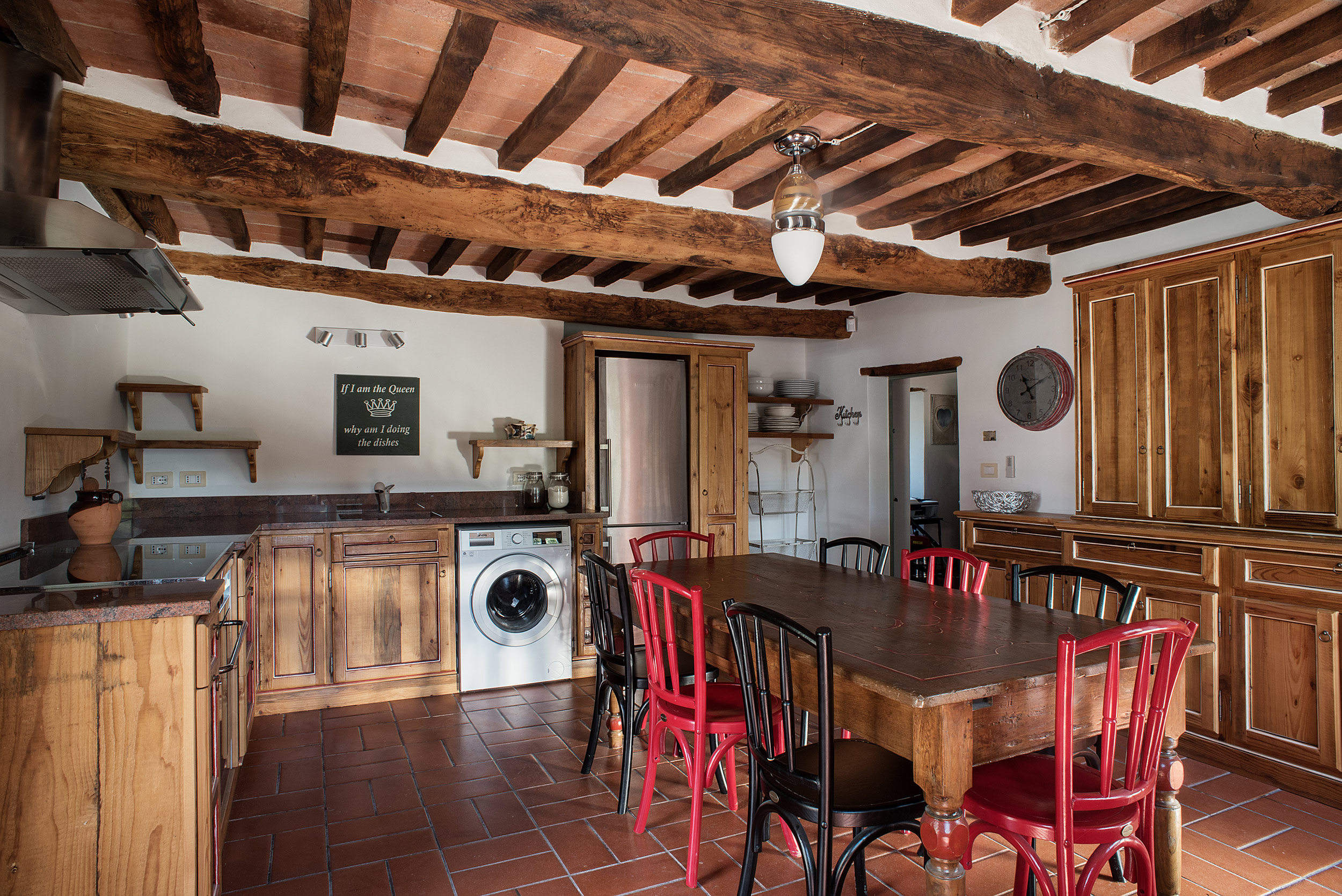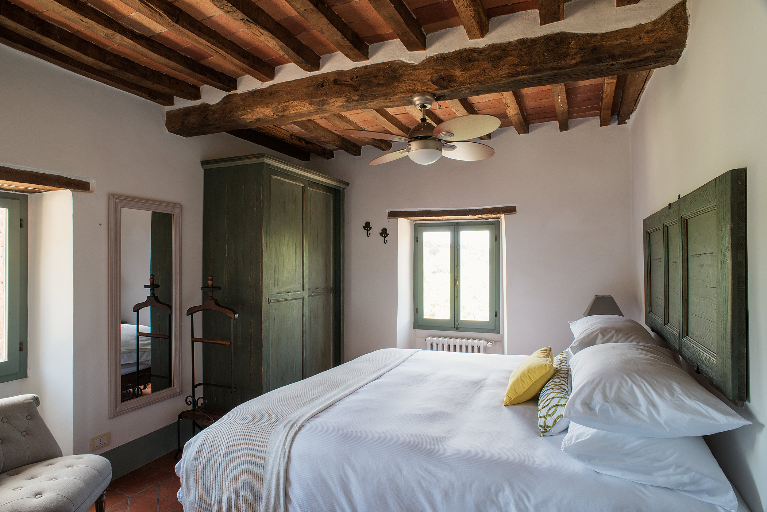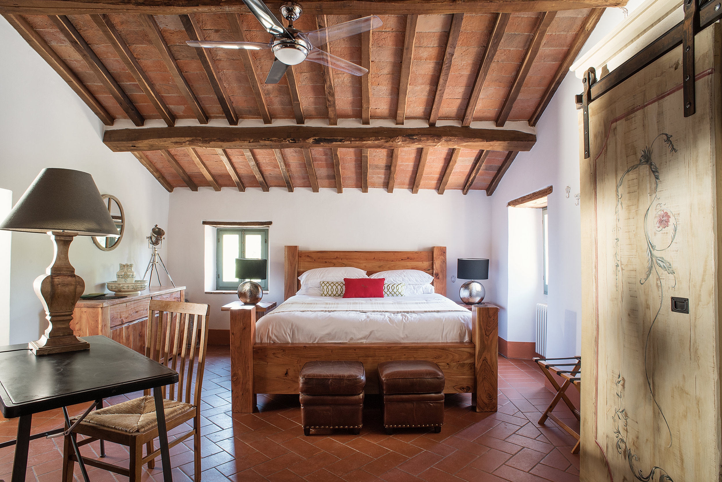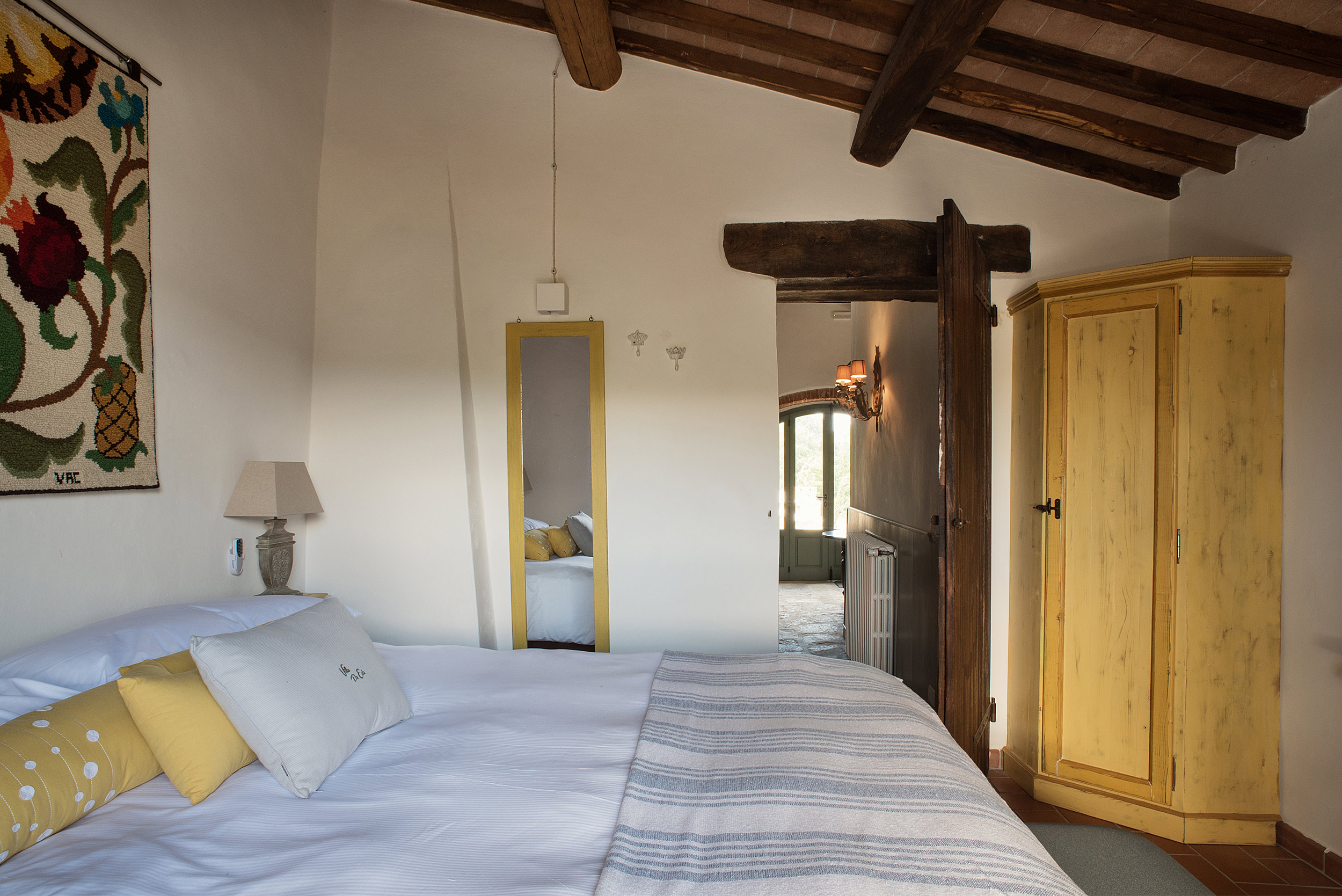 Halfway you find Villa da Eva, an elegant stone built farmhouse recently renovated with six bedrooms, spread over 350 square meters. A private unpaved stone gravel road framed by tall cypress trees awaits you and leads you to the gated entrance of a traditional 19th century Umbrian home resplendent with the elegance of stone, wood and terracotta. In a meticulously restored area, Villa da Eva can easily host eight to twelve guests. The subdivision of the rooms allows you to live independently in the two parts of the villa, each with its own kitchen and living room. It is the ideal space that allows, for example, two families to have private living rooms while sharing the rest of the villa, gathering at the big dining table in the main kitchen, or eating outdoors all together under the pergola.