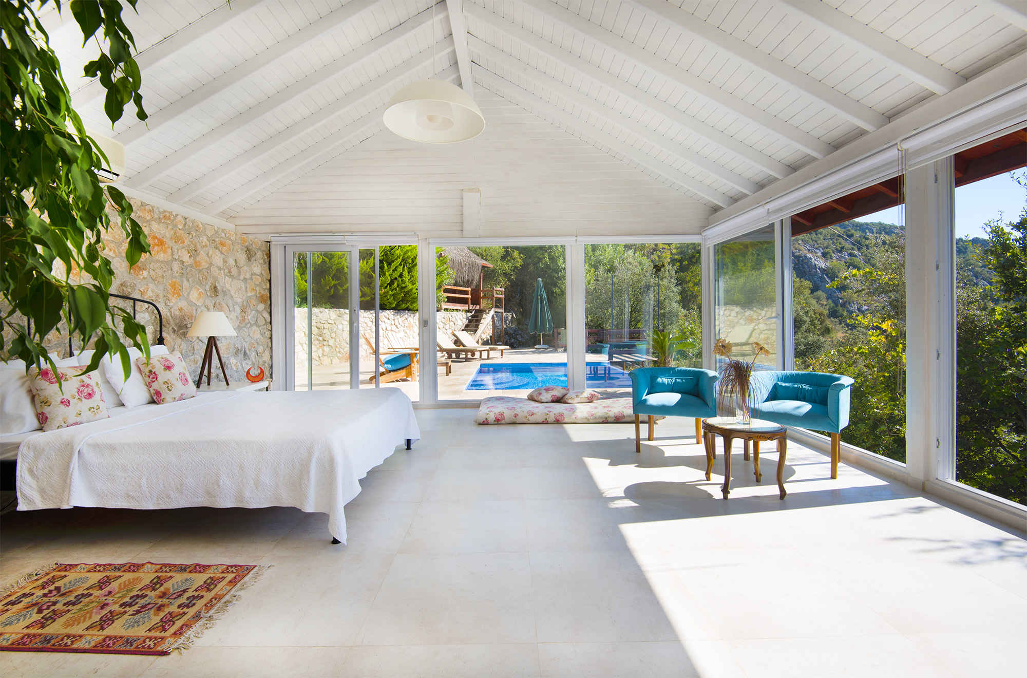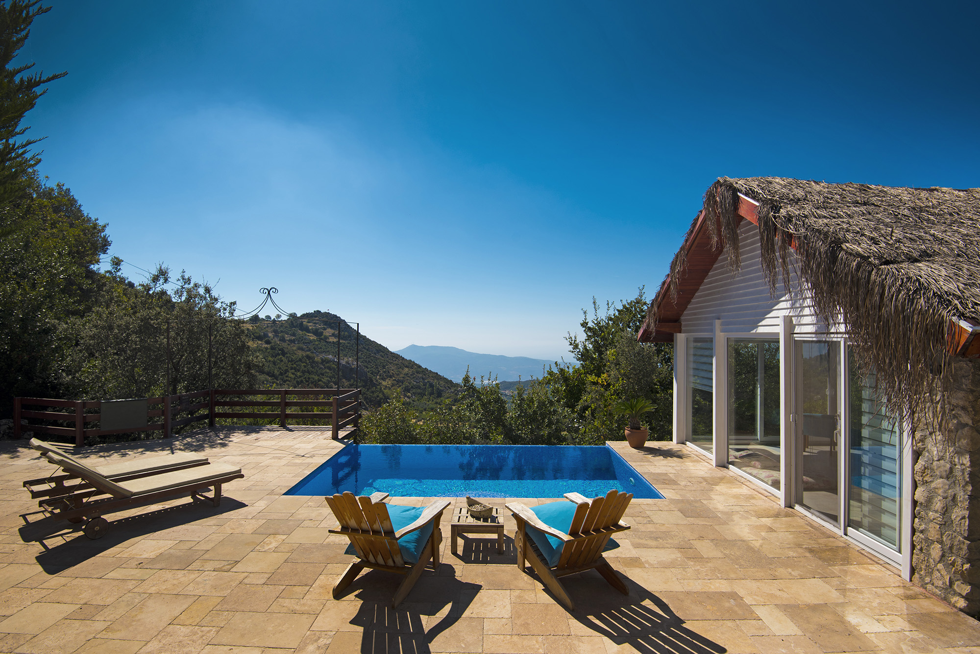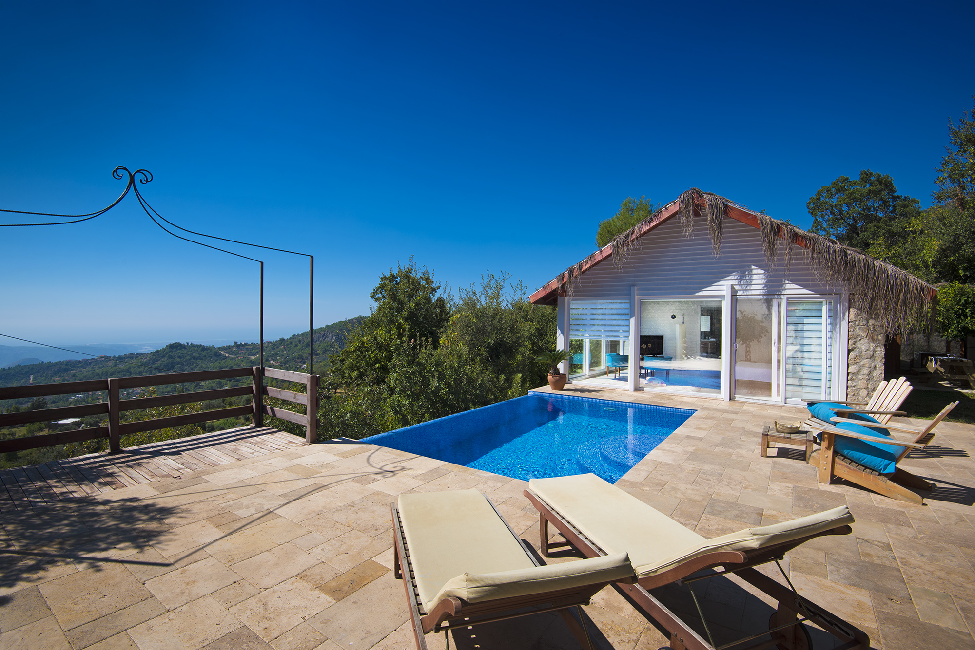 Salkim Evi has been constructed from wood and stone with huge expanses of glass allowing views from the bedroom and bathroom, and most especially from the huge Jacuzzi bath, over the treetops and the valley towards the long strip of beach at Patara. The interior is light and bright, outdoors there’s a spacious terrace around the private infinity pool; to one side are the high craggy rocks of the Taurus Mountain range and then the valley which drops away to the distant Patara beach view.