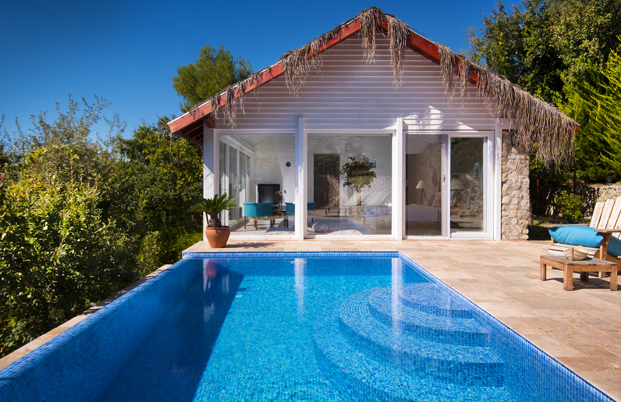The more being that it is stunningly designed, secluded yet within a 10 minute walk of the village of Islamlar and it is only a 20 minute drive to cosmopolitan Kalkan; even romantic trysts can be enhanced by cocktails and a starlit dinner at the sea’s edge!