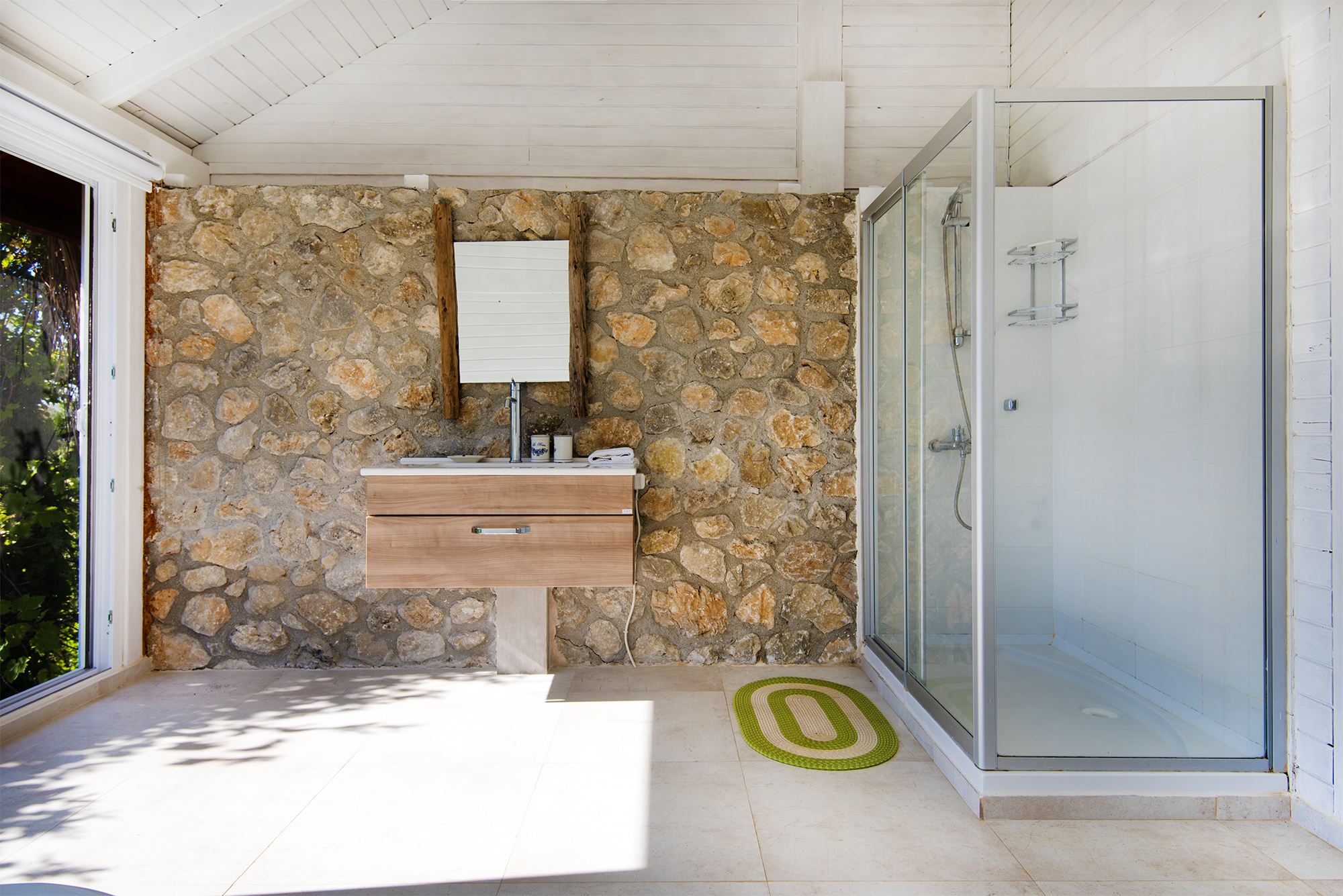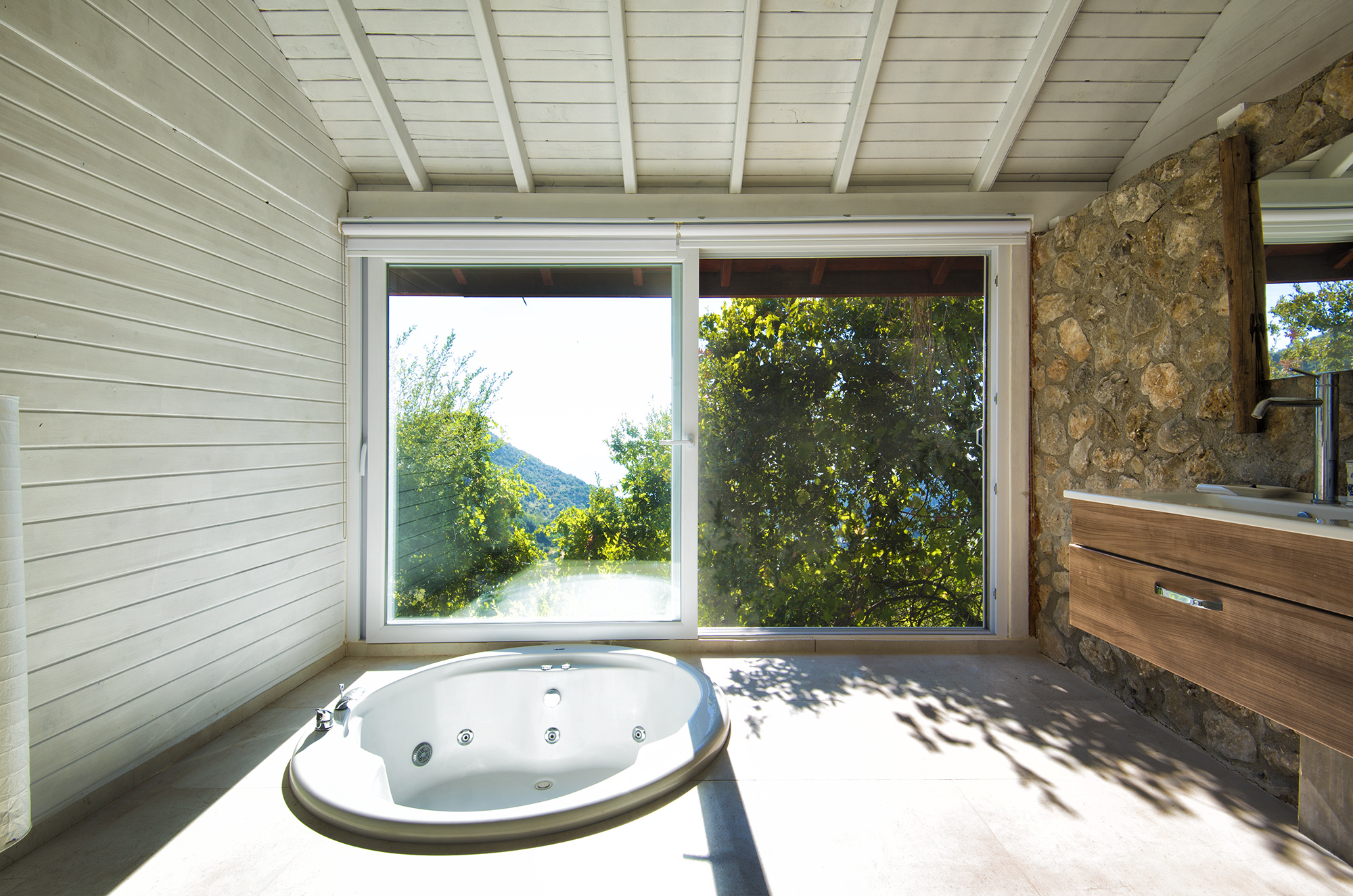 Ground Floor: One room living – massive bedroom with glass walls to two sides, sitting area and through to bathroom with jacuzzi bath set into the floor and with “the view”, shower room/wc. Dressing area. A small summer kitchen is located in a separate building on the terrace with a shady dining area.