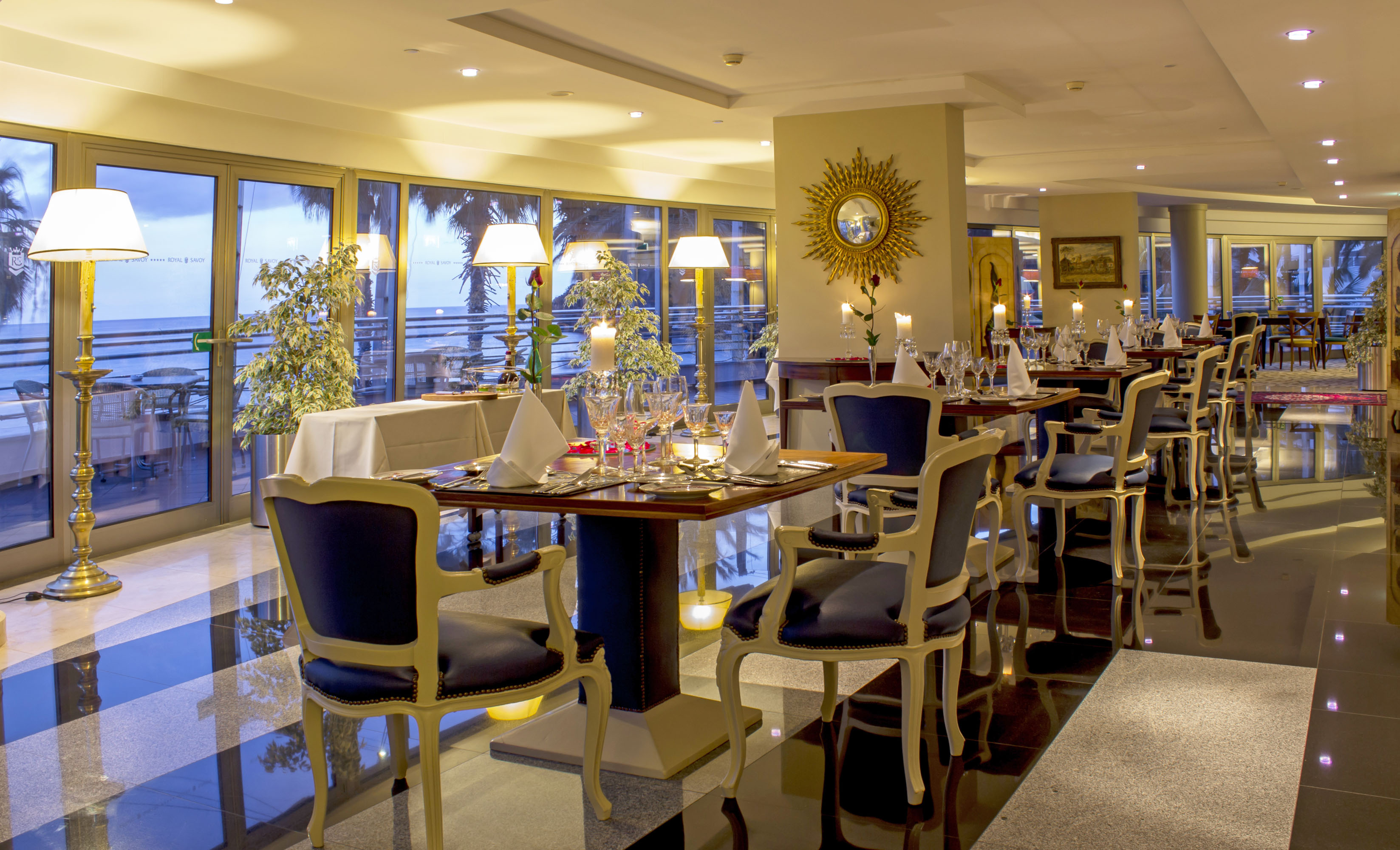 There are a couple of large saltwater pools with a swim-up bar in the centre, a heated indoor pool and there is also a private staircase from the hotel grounds that leads directly into the sea. The buffet restaurant and outdoor terrace also offer a la carte dining in the evening and the Royal Spa offers a full variety of massage and body treatments.