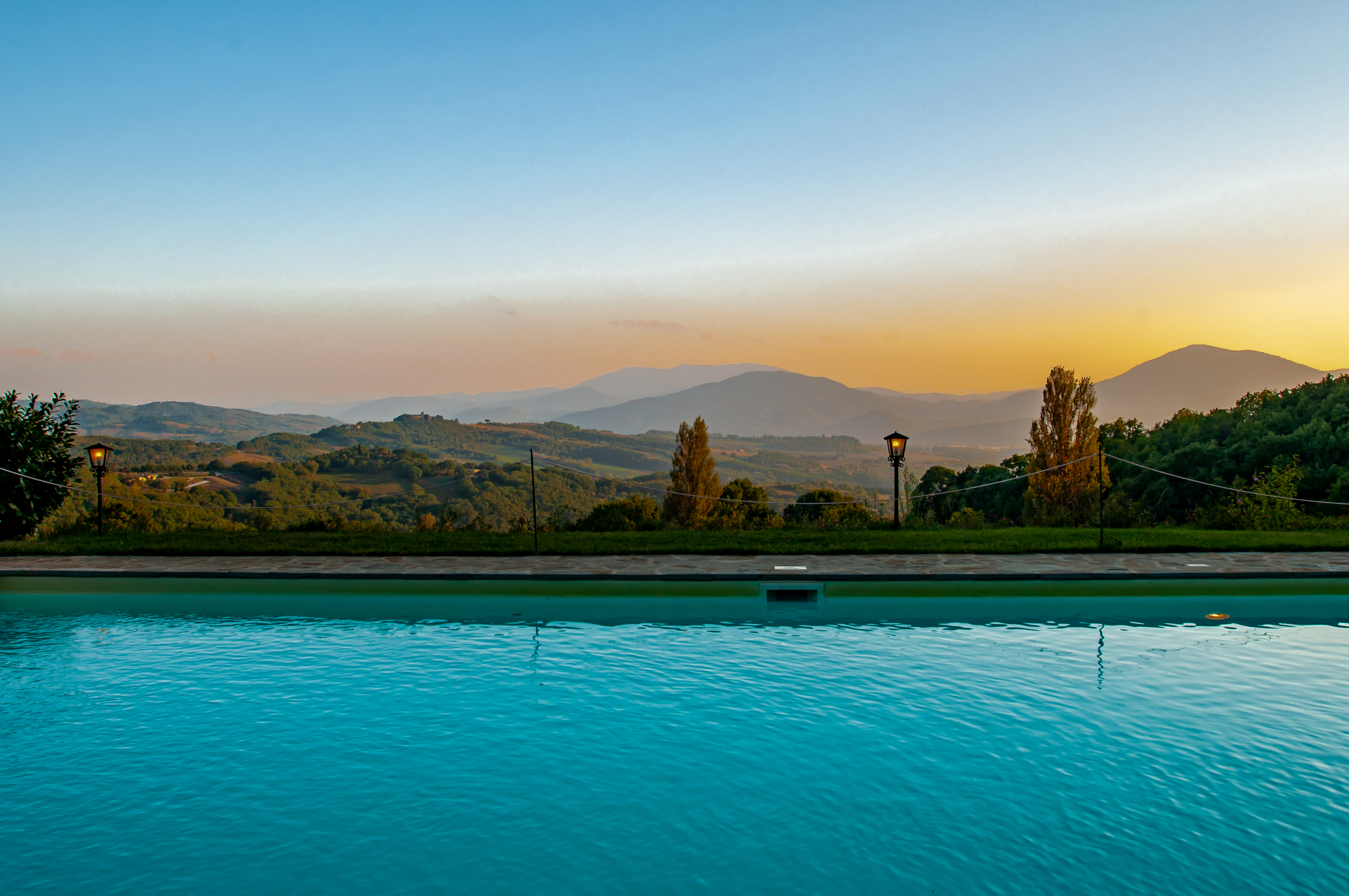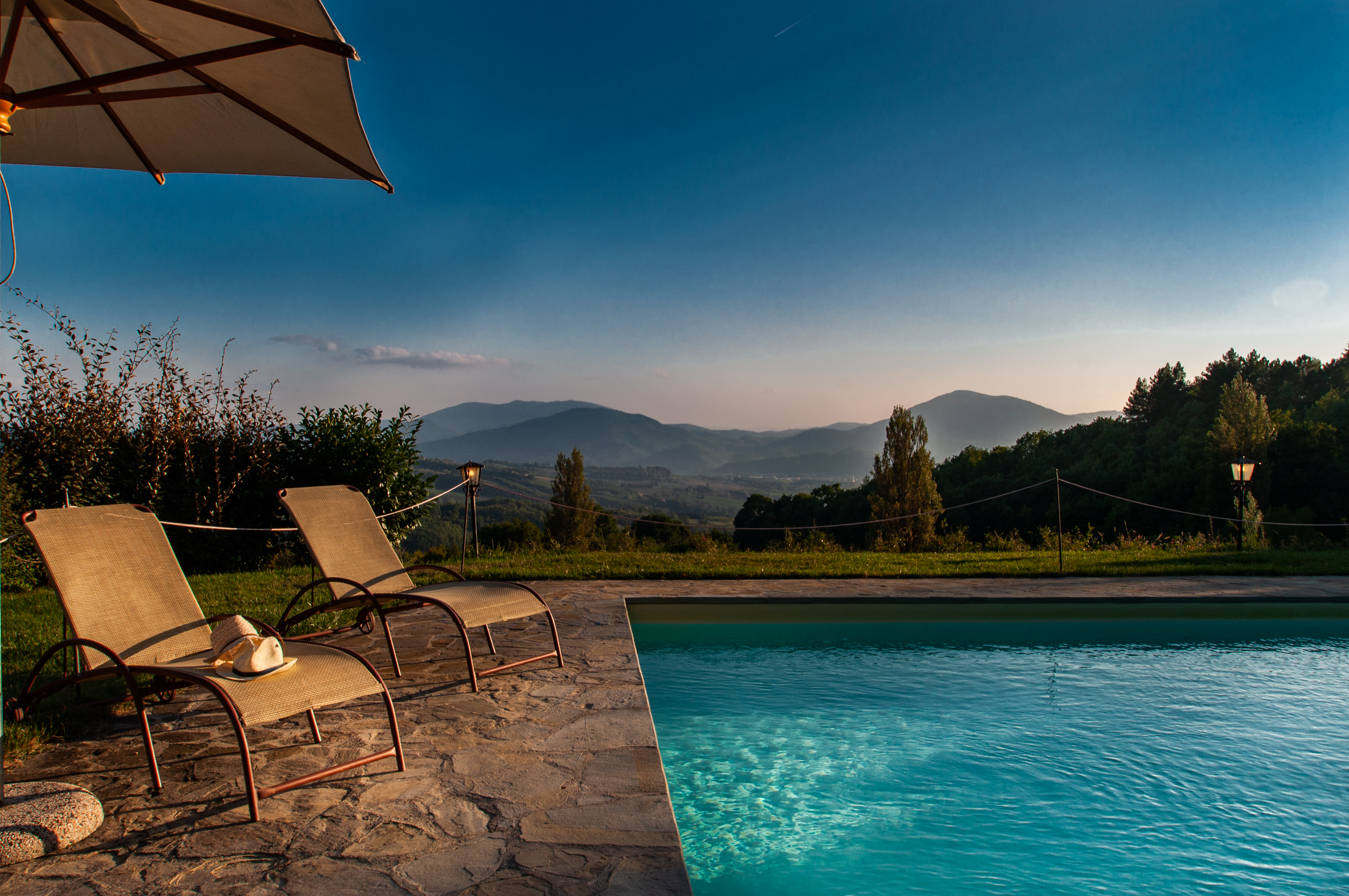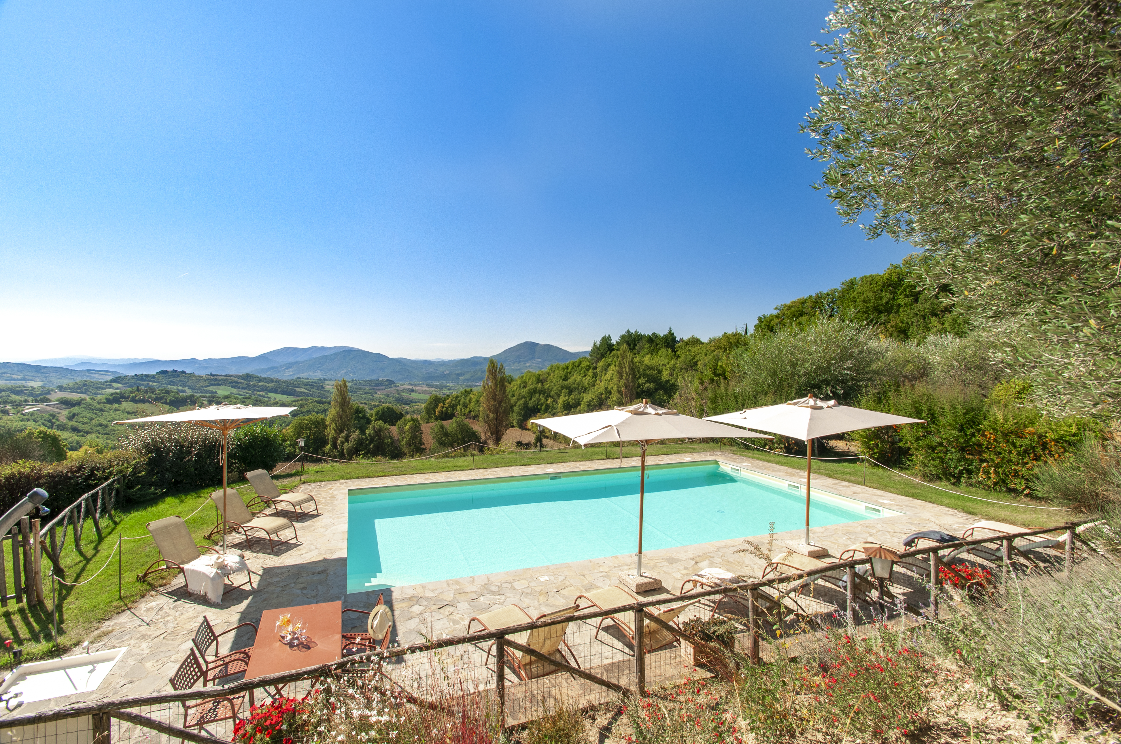 The pool has beautiful views over the green Umbrian hills. It is 12 x 6 meters and between 1.20 and 1.50 meters deep. The pool terrace has sun lounges and umbrellas. The pool terrace is surrounded by lavender and other herbs. The pool area has been completely fenced recently. There is an outside toilet, not far from the pool, where the washing machine is stored.