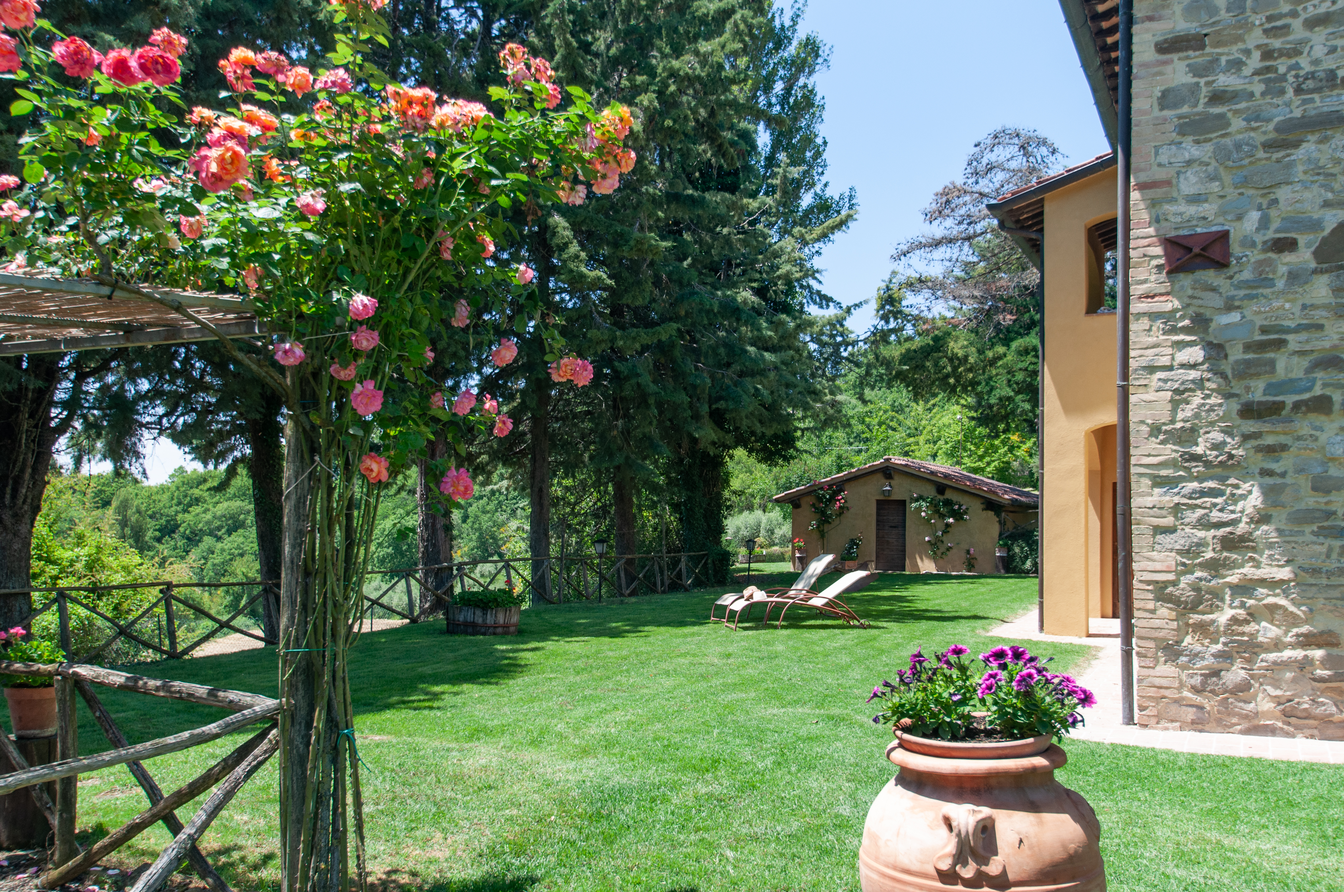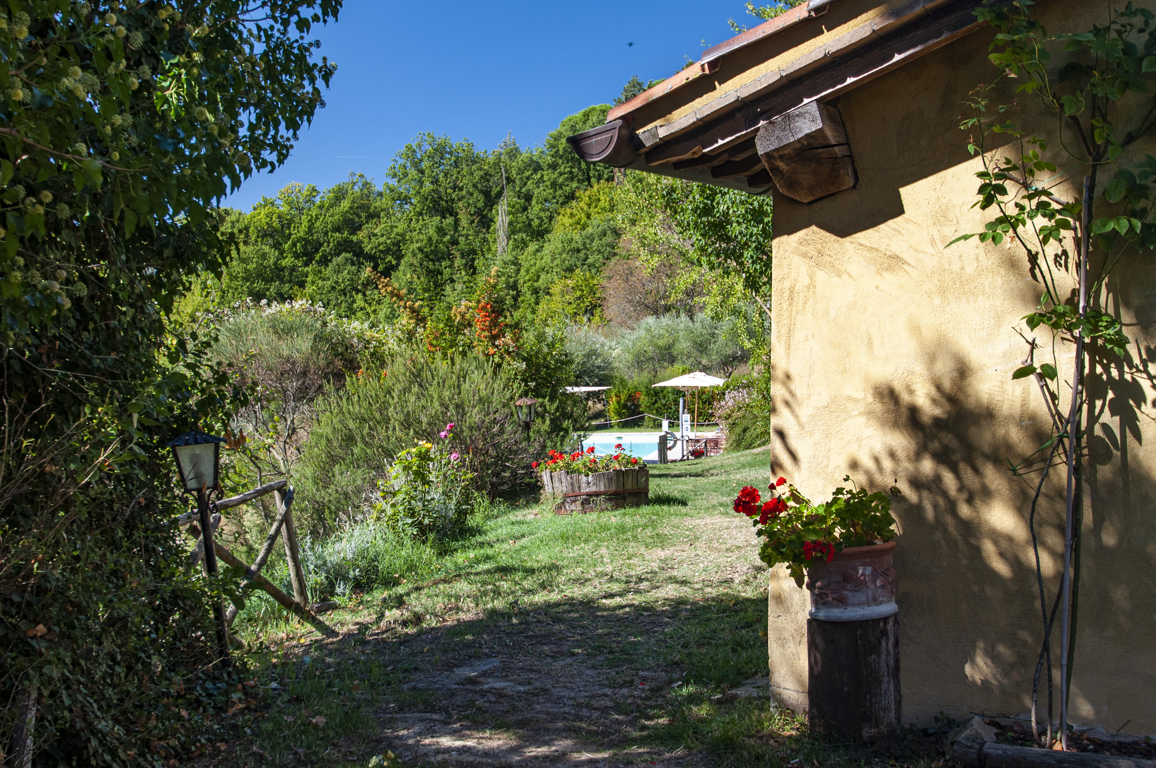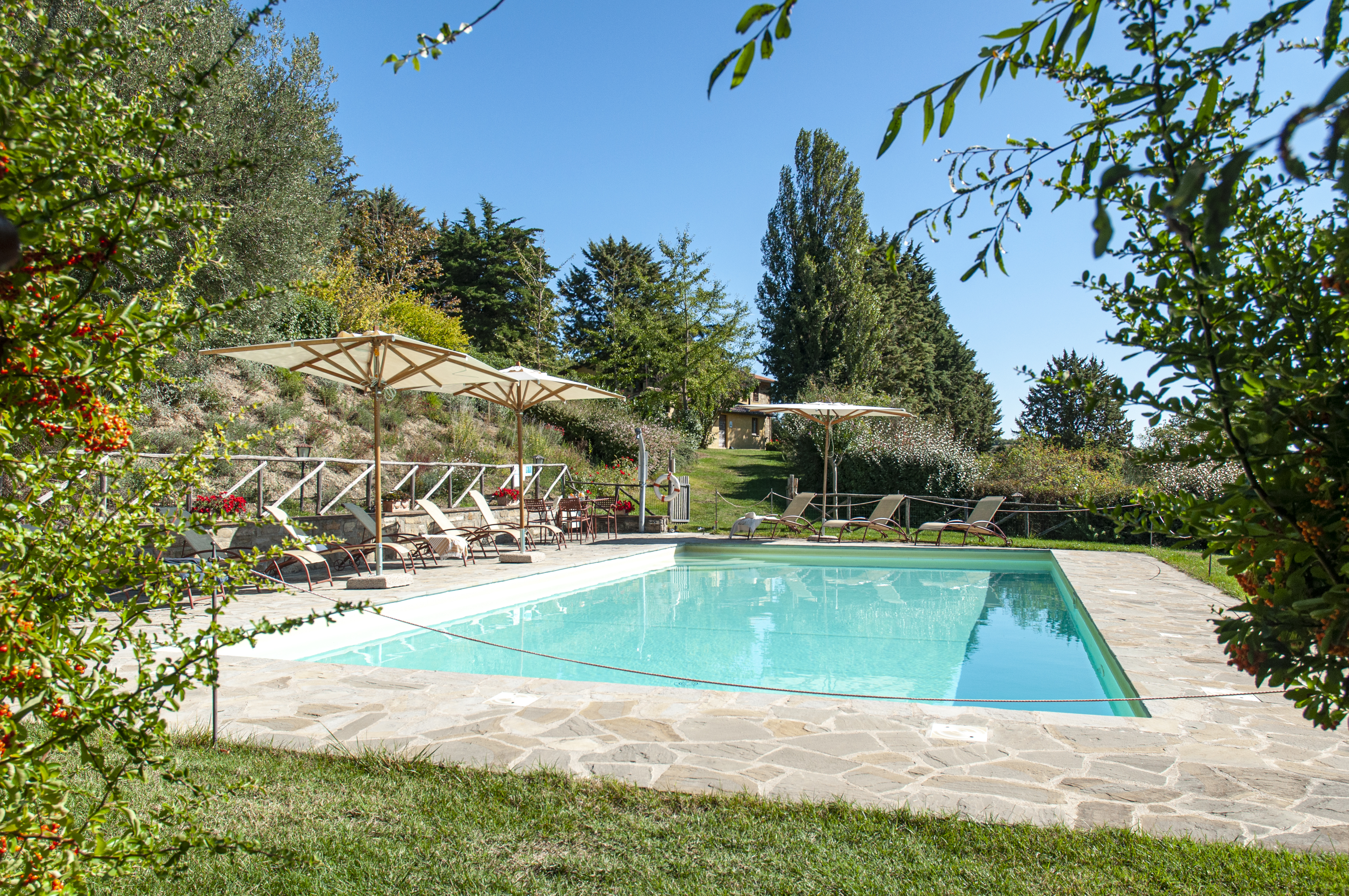The pool has beautiful views over the green Umbrian hills. It is 12 x 6 meters and between 1.20 and 1.50 meters deep. The pool terrace has sun lounges and umbrellas. The pool terrace is surrounded by lavender and other herbs. The pool area has been completely fenced recently. There is an outside toilet, not far from the pool, where the washing machine is stored.