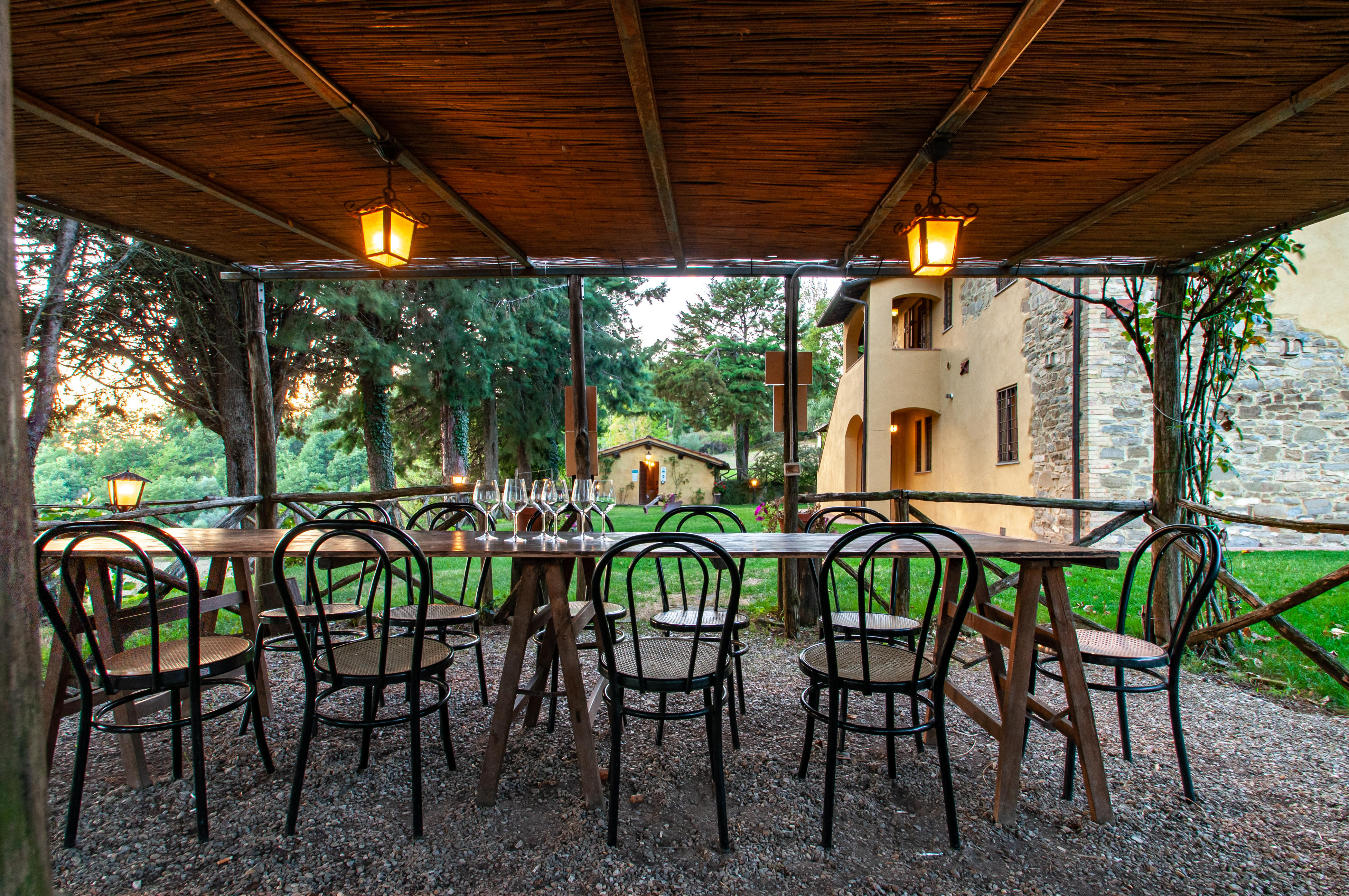 The villa has one covered outside sitting area in front of the house under some old trees. There is a second covered sitting area at the side of the house, on a slightly higher level.