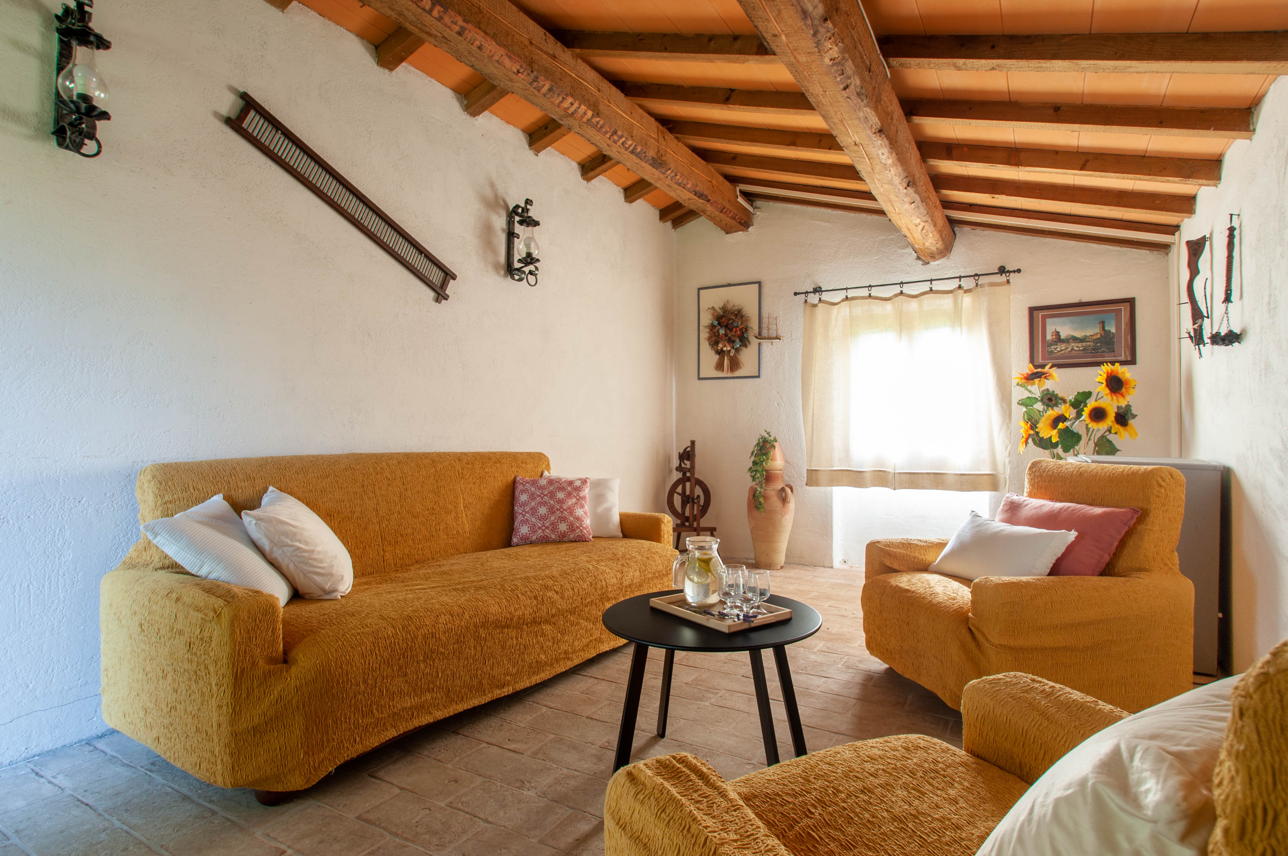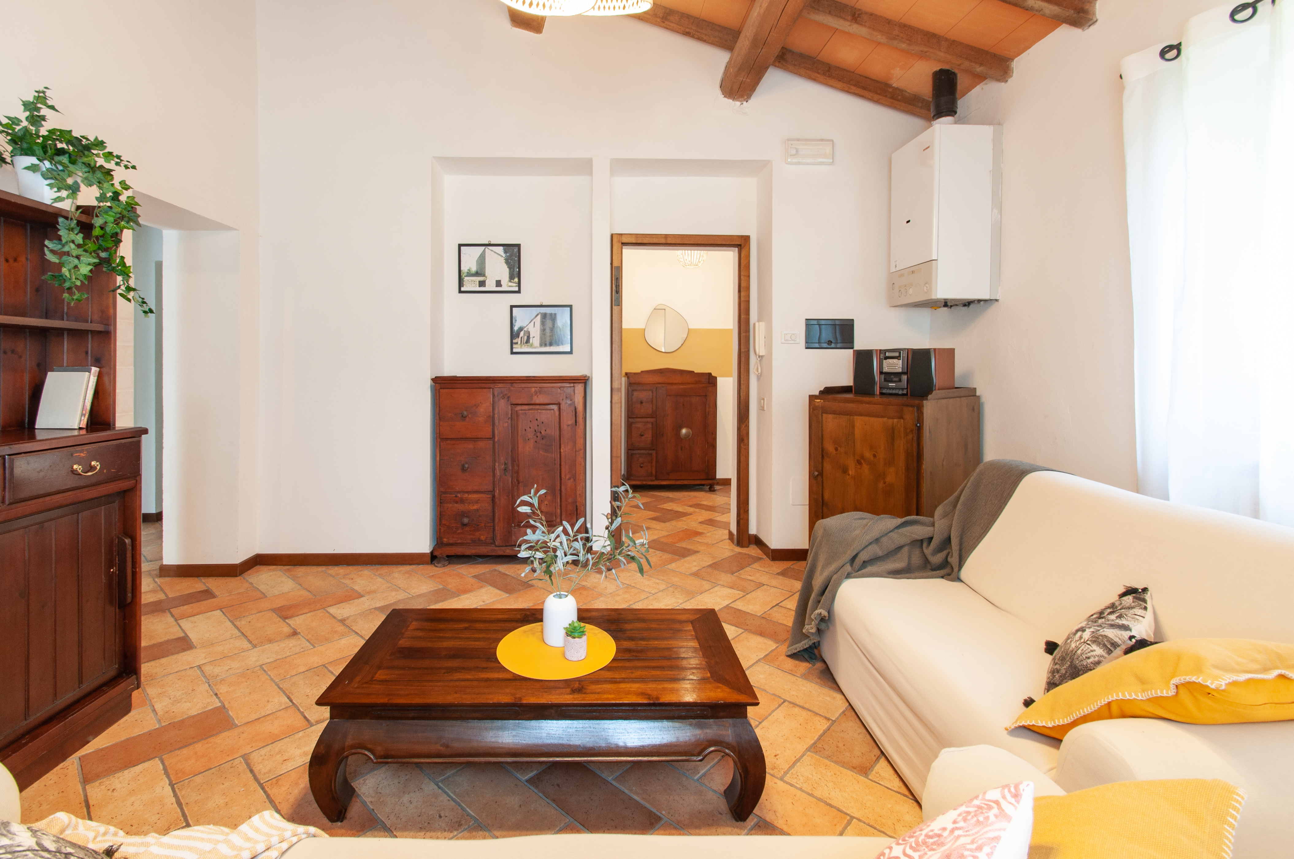 The villa is situated North of Perugia, 6 km from Umbertide. There are 6 bedrooms and 3 bathrooms. Originally the villa was built with three separate apartments. Between the villa and the pool there is a reading room with comfortable sofas.