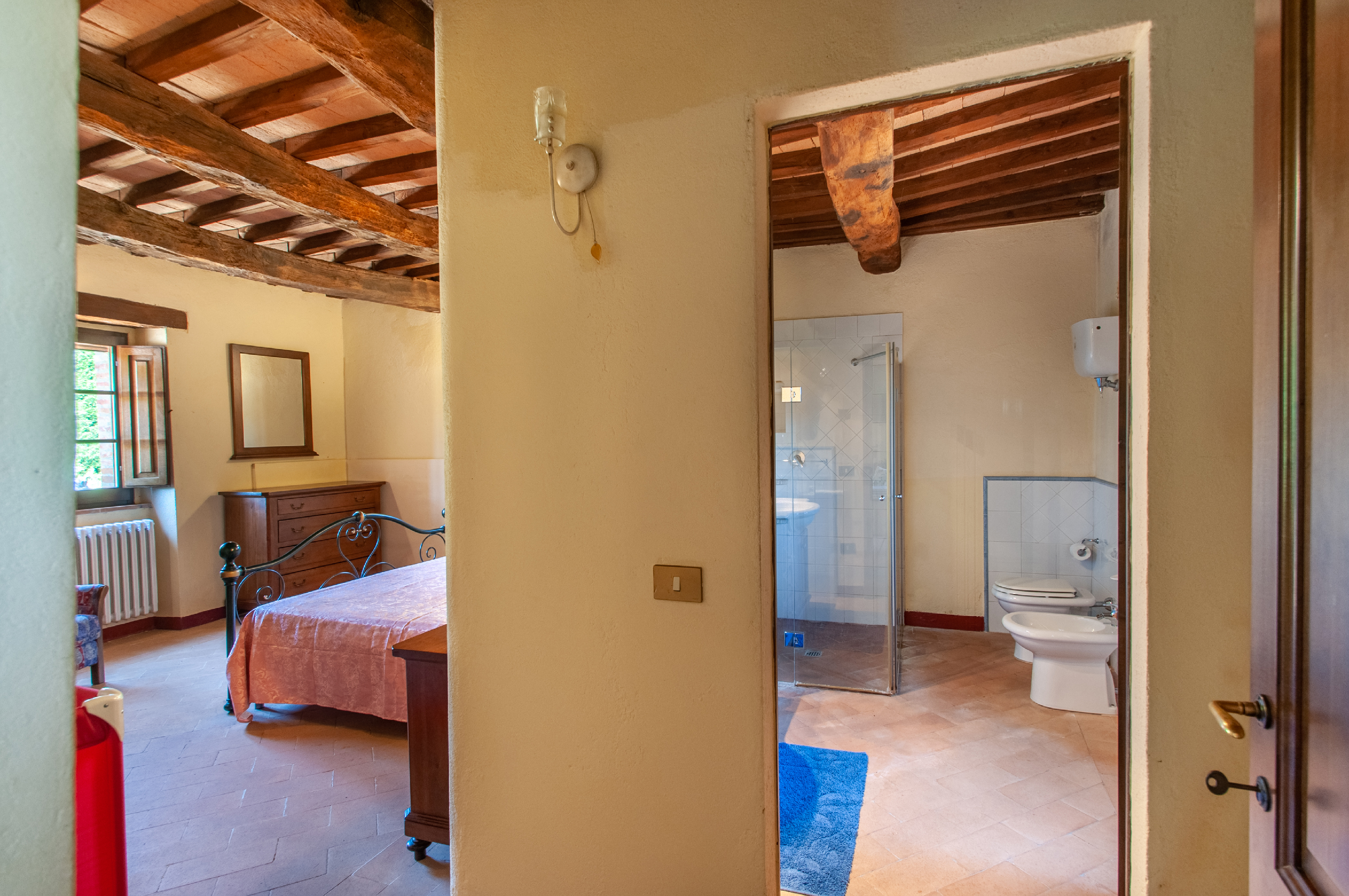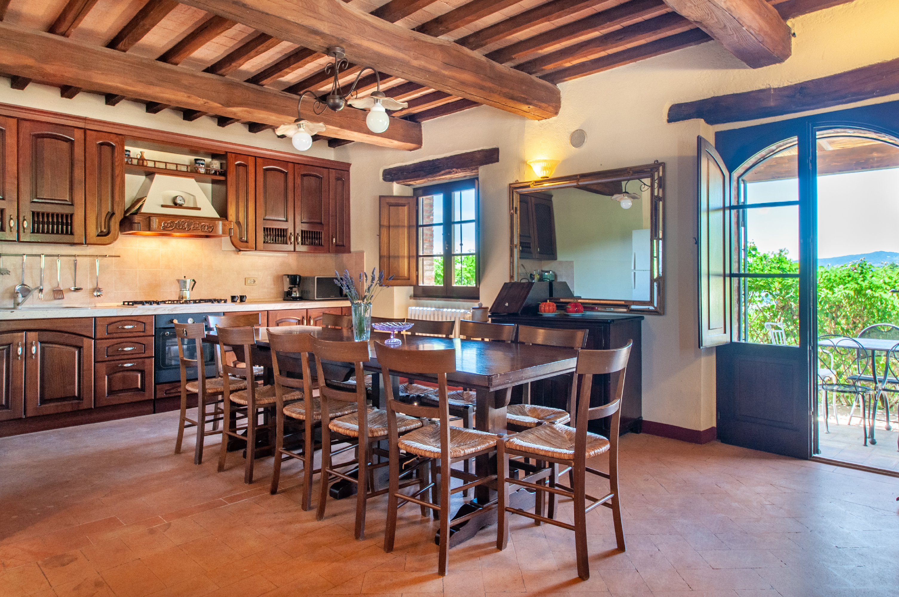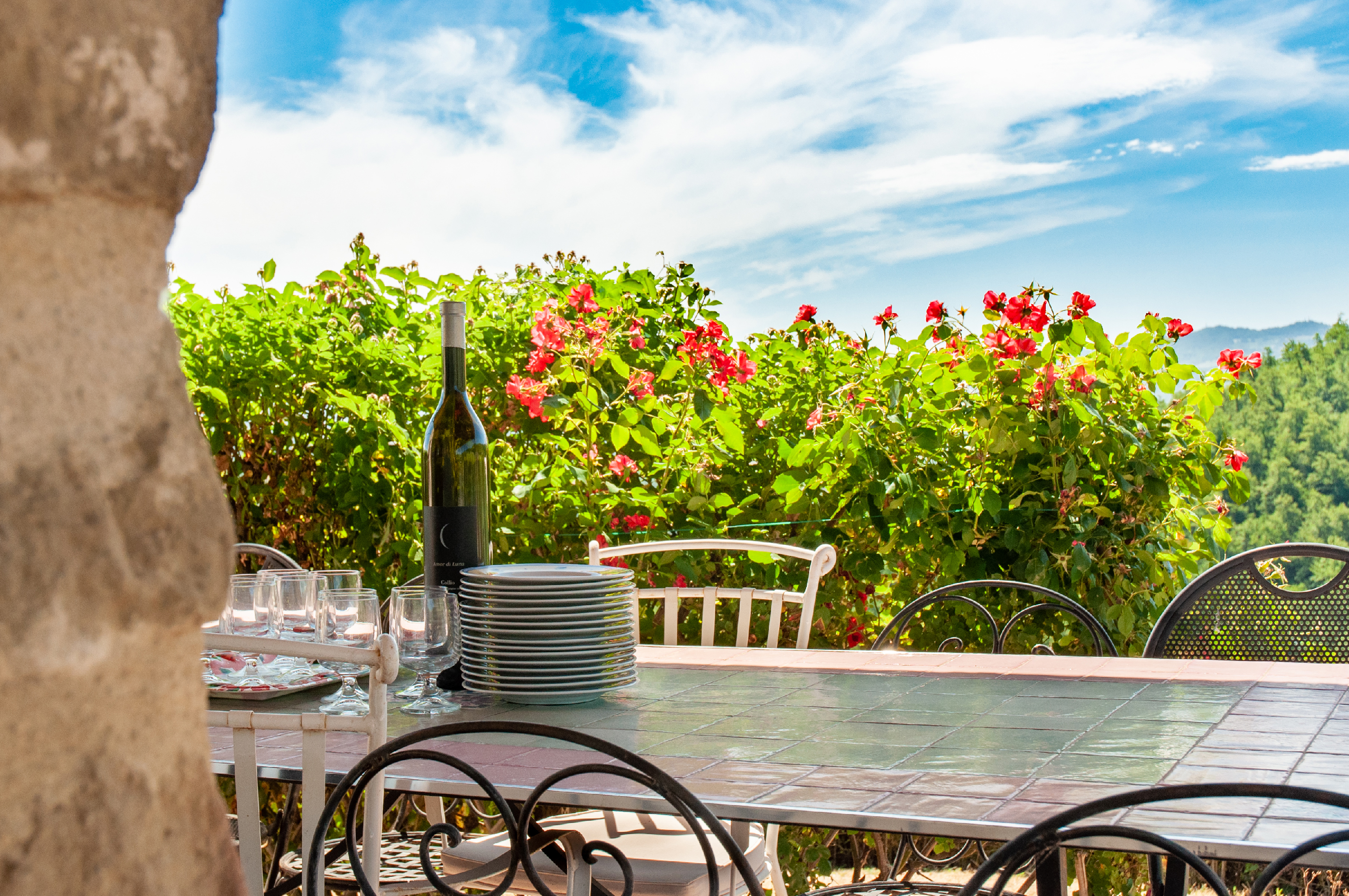 The kitchen has a dishwasher, oven, 6 pit gas hob, large fridge/freezer and washing machine. The long dining table in the kitchen has space for 12 guests and there is space to add an extra table in case the cottage is also rented. There is a covered terrace outside the kitchen with nice views over the valley and outside furniture. There is a service toilet. There is one double bedroom with ensuite bathroom with shower.