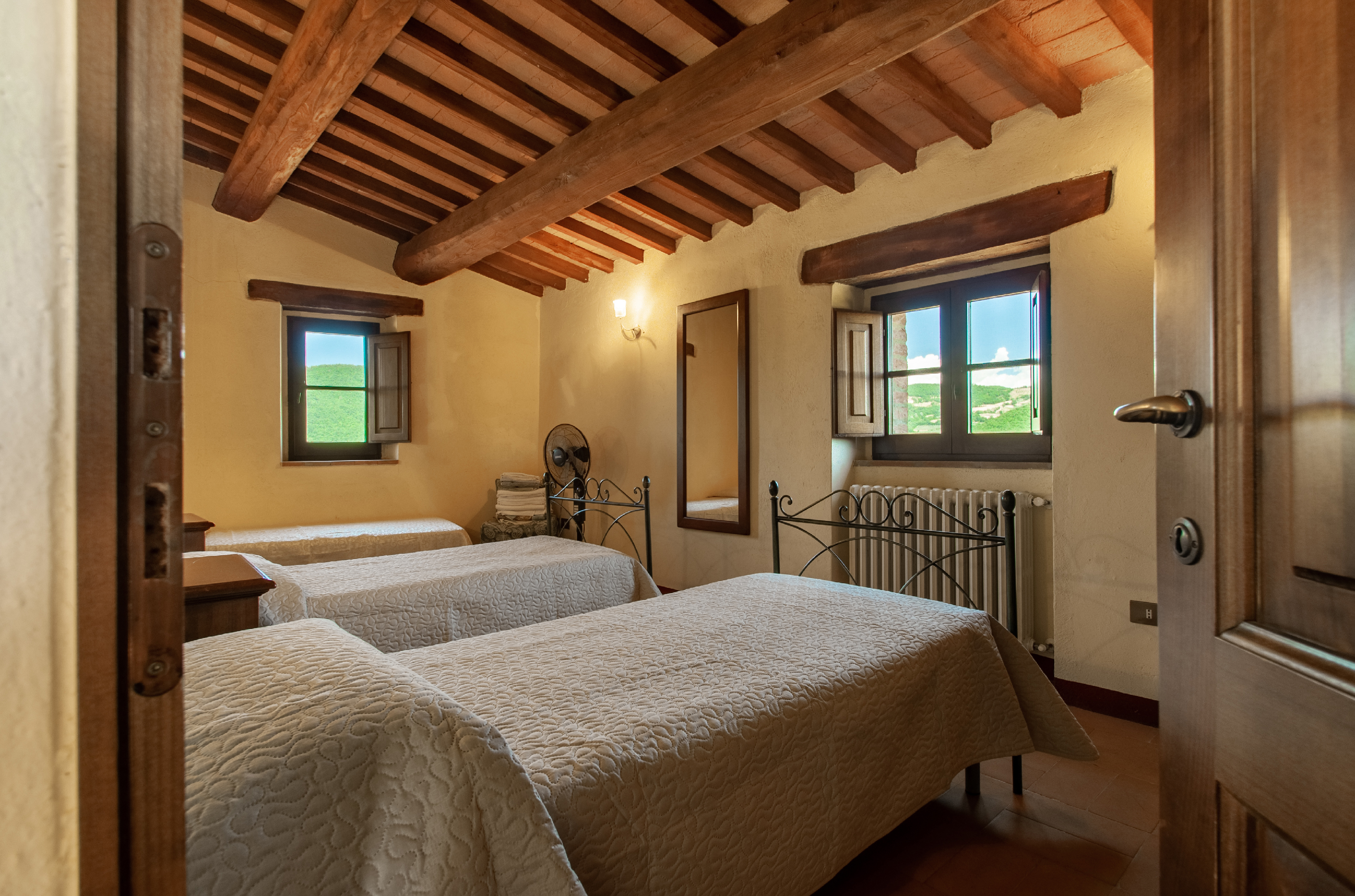 The second floor has two more bedrooms sharing a bathroom (with shower) and a roof terrace from where you can enjoy the wonderful views of the surrounding countryside. One bedroom is a twin (can also be made as a double). The other bedroom has three single beds.