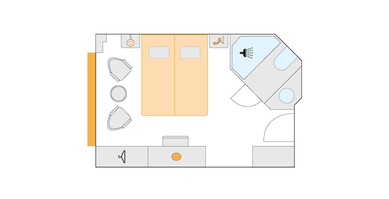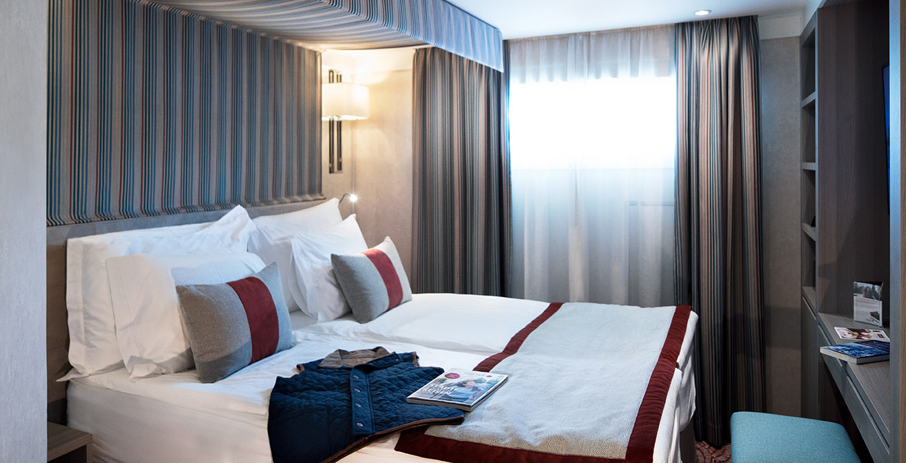 Spacious and comfortable outside cabin with drop-down panorama window. Elegant design and first-class materials ensure an atmosphere of well-being. Cabin facilities: safe, air-conditioning, TV, hair dryer, bathroom with shower and toilet, sauna towel, wool blanket, telephone, bathrobe.