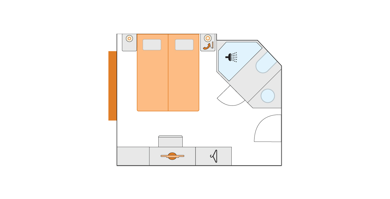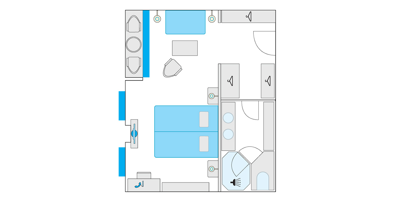 Spacious and comfortable outside cabin. Elegant design and first-class materials ensure an atmosphere of well-being. Cabin facilities: safe, air-conditioning, TV, hair dryer, bathroom with shower and toilet, sauna towel, wool blanket, telephone, bathrobe.