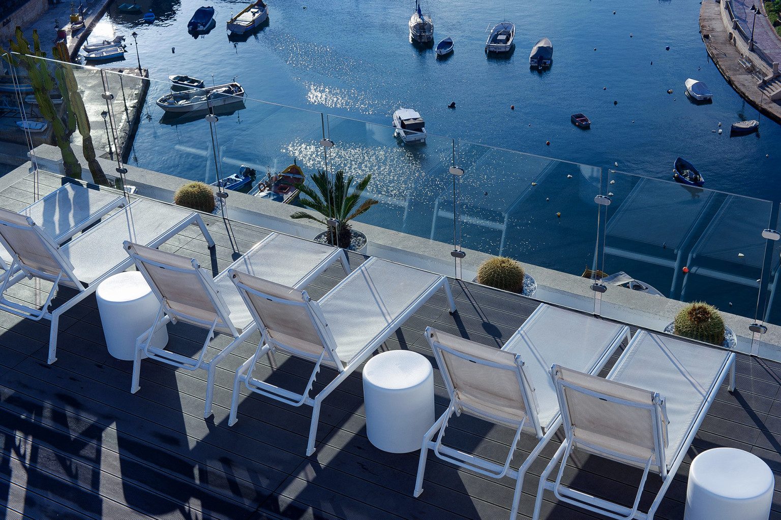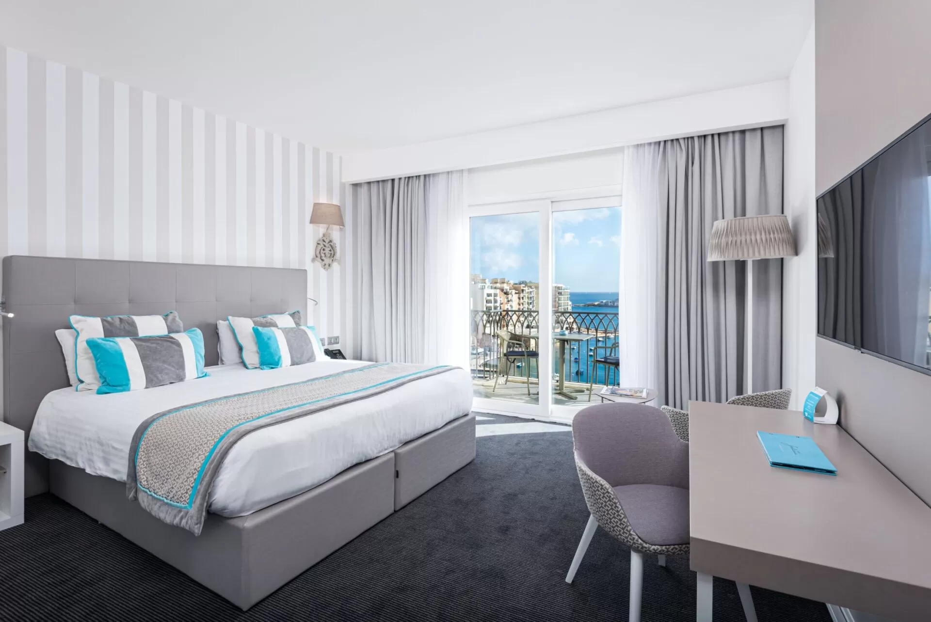 Rooms are decorated in refreshingly chocolate brown, greys, crisp blues and white. Each is elegantly decorated and furnished with contemporary pieces and has all the required amenities. Deluxe sea view rooms are slightly larger and offer the stunning sea views out over St Julians Bay.