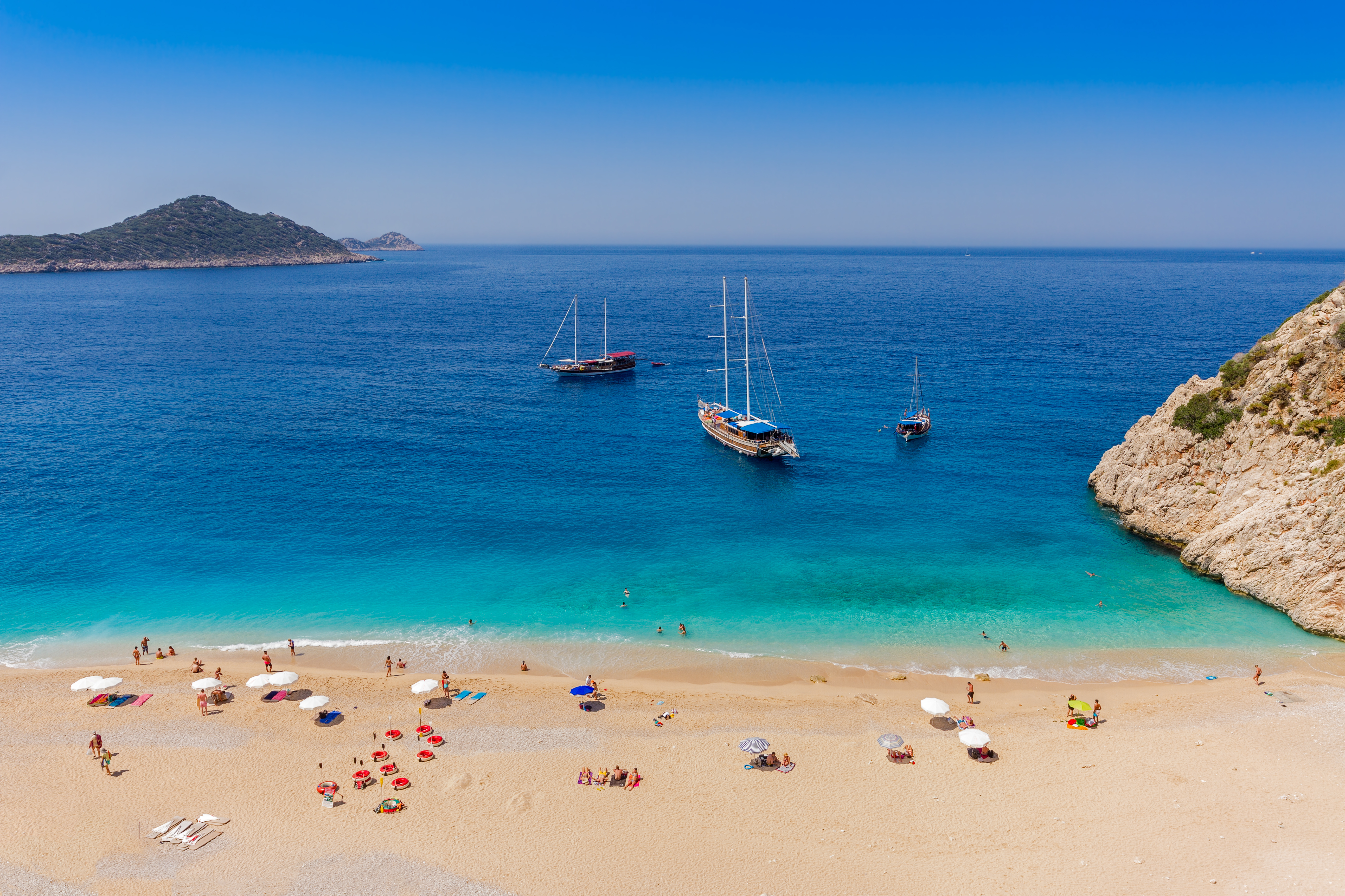 Beaches near Kalkan include the 18km long Patara Beach, a breeding ground to the endangered loggerhead turtle. The beach is closed after sunset from May to October to allow the turtles to lay their eggs. At Patara Beach you have the option of lazing in the sun on the beautiful and wide sandy beach or walking over the vast dunes. Located 15 minutes from the beach are some ancient archaeological ruins, which have yielded pottery, dating from the 7th century BC. Then you have the option of Kaputaş beach located 7km east of Kalkan. Steps wind down from the road to the beautiful little sandy cove where the sea is a stunning azure blue. Throughout the summer months a dolmuş runs from Kalkan to Kaputaş beach.