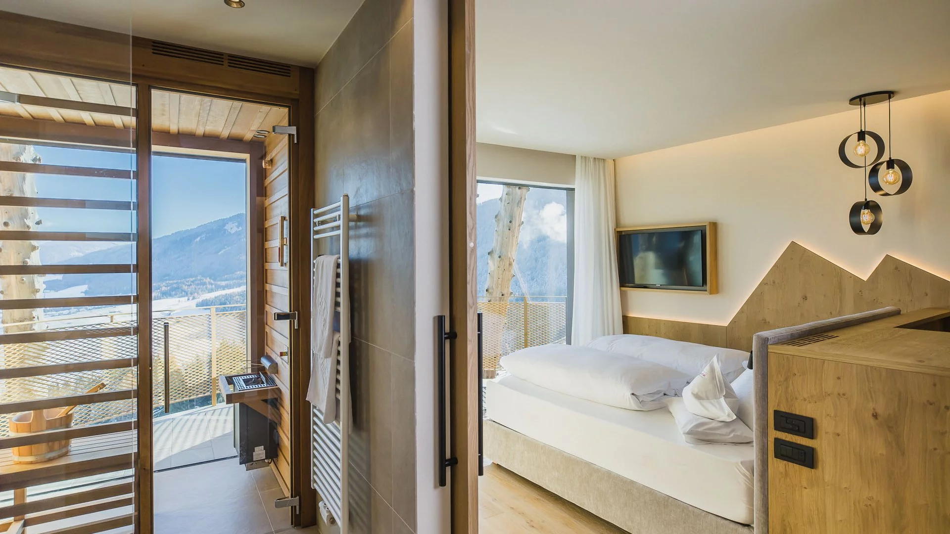 The 64 rooms and 10 suites here all have superb mountain views. Each is furnished with sleek lined wooden furniture and has a private balcony. Higher category rooms offer the bonus of a private sauna or jacuzzi. All guests have the following services included: