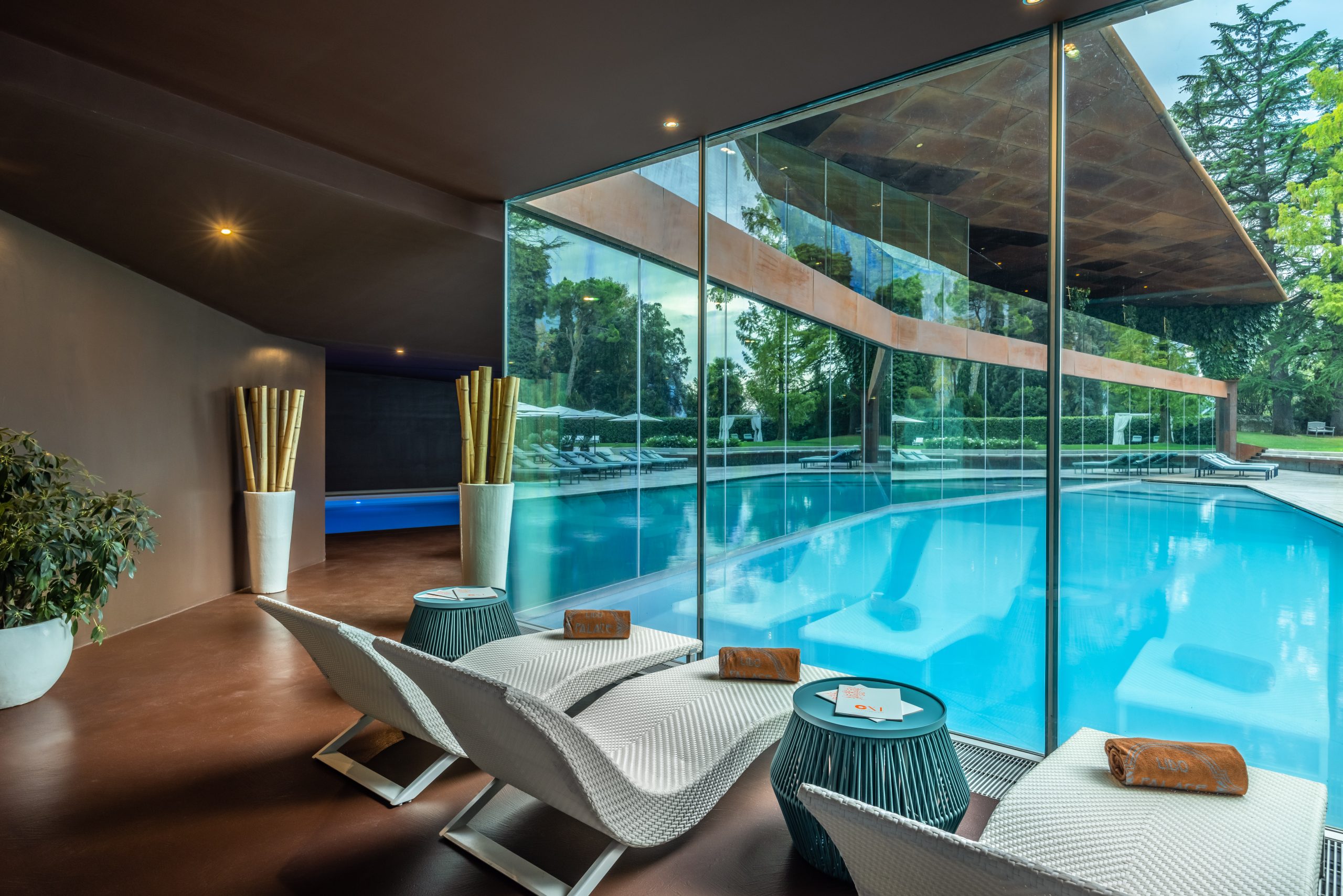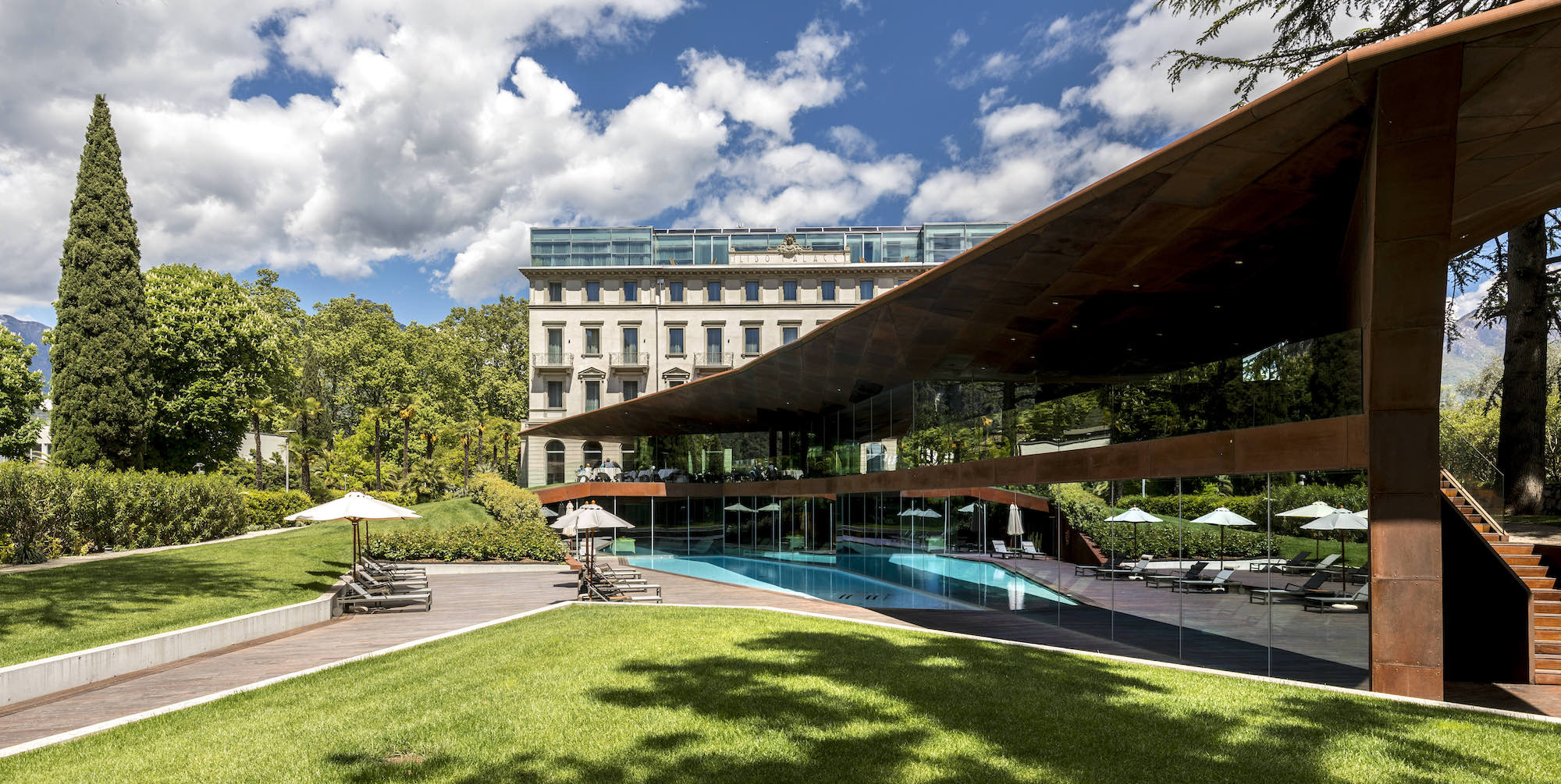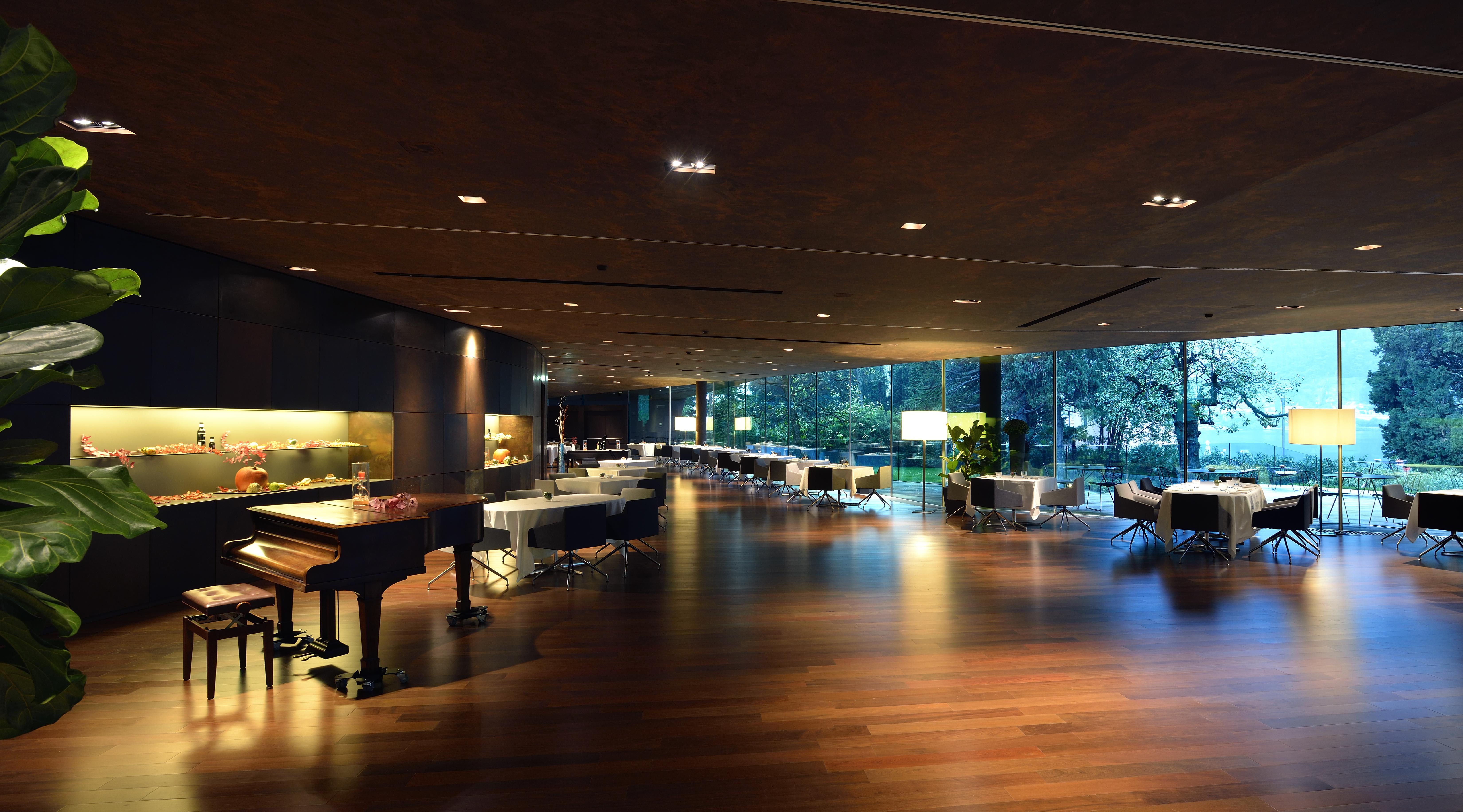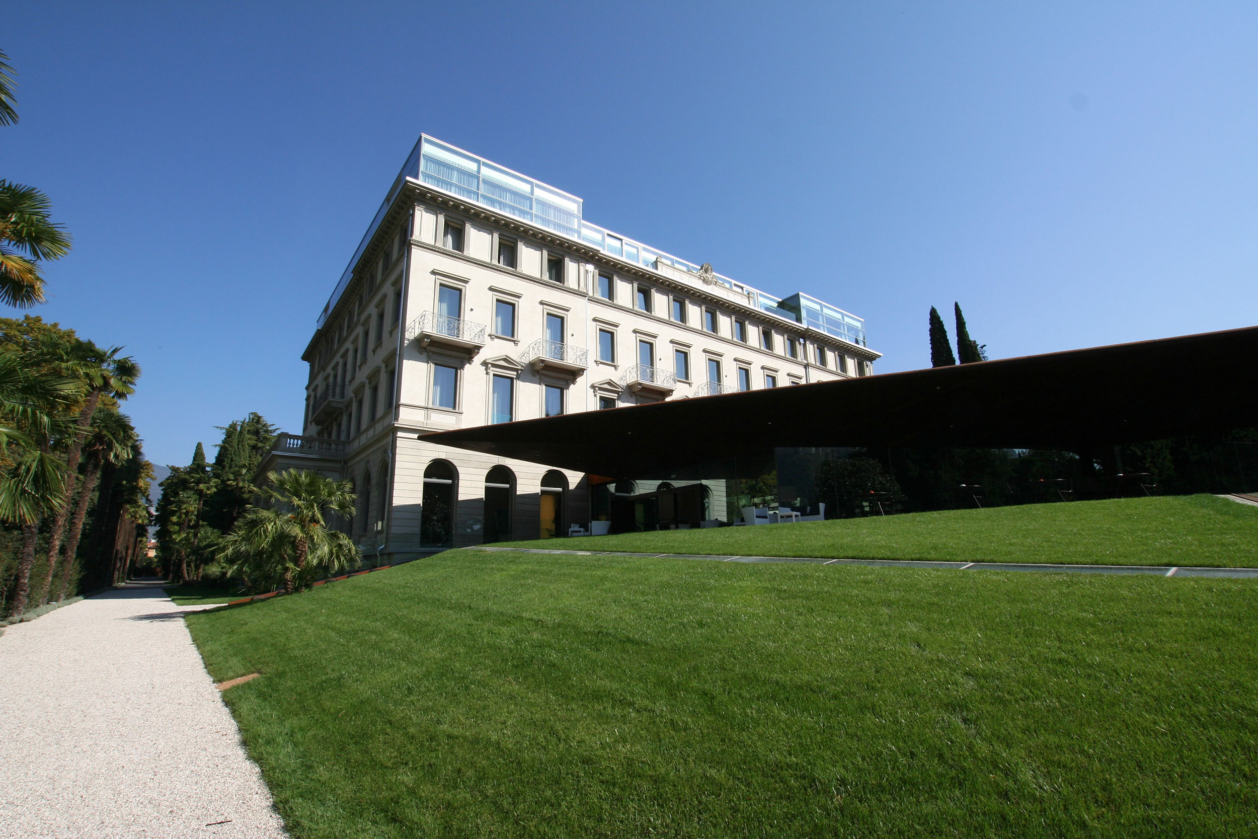 Always palatial in its architecture, the hotel was radically transformed by the avant-garde genius of Alberto Cecchetto and the lobby area now juts out from the main building as a museum-like extension with glass ceilings and swanky seating. The glass and metal dining extension is in a similar vein and stretches almost to the lakeshore. A glass walkway runs over the gardens – the restaurants and bar give the illusion of floating above the lake. Within the historic main building, marble columns and high ceilings are juxtaposed with modern art and vivid furnishing. Floor to ceiling windows offer stunning vistas over the gardens and the surrounding lake scenery giving a true inside-outside vibe.