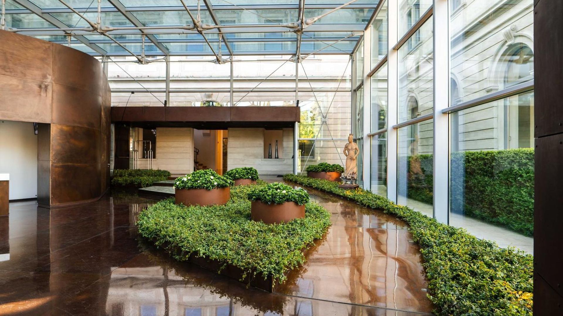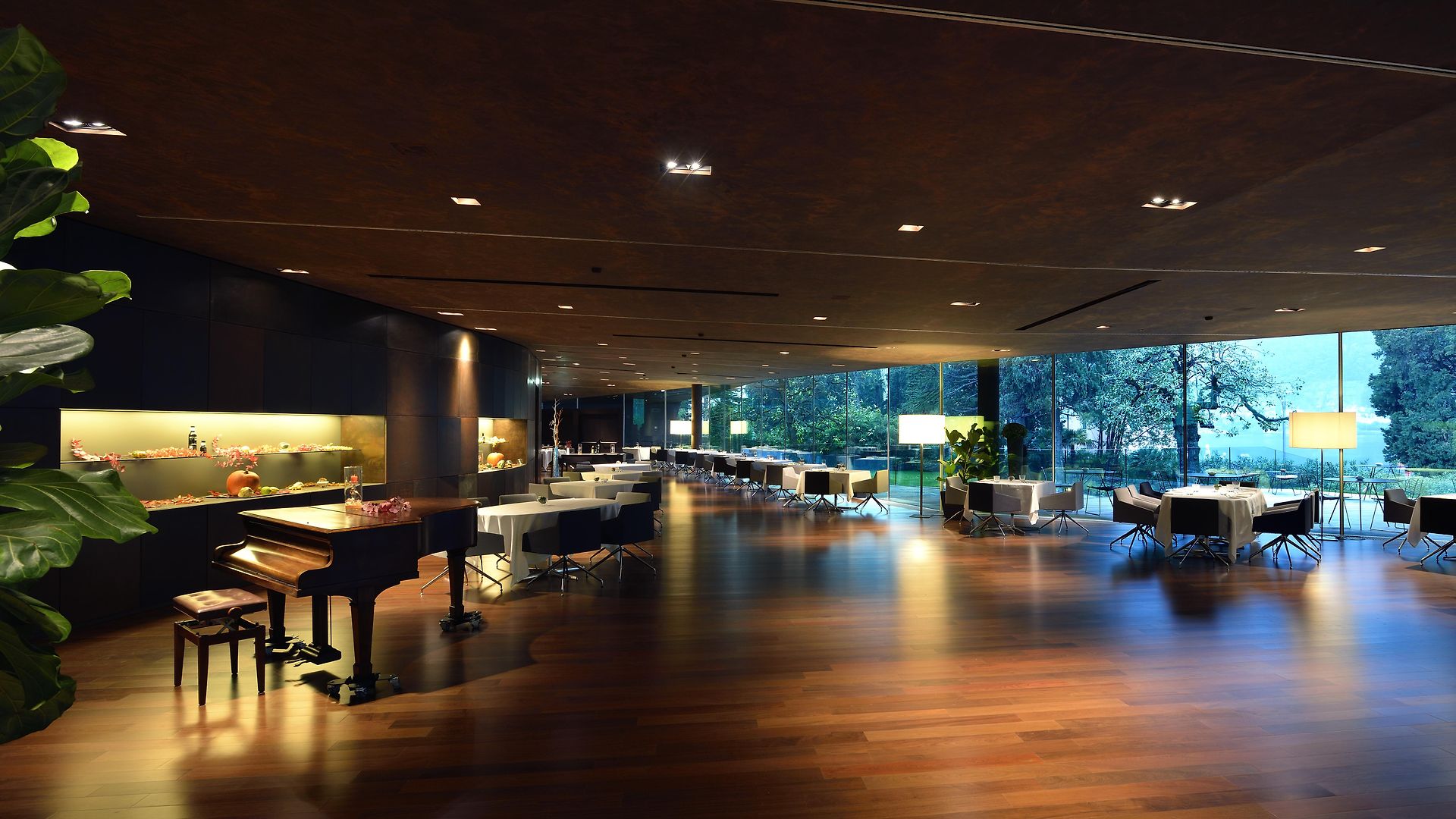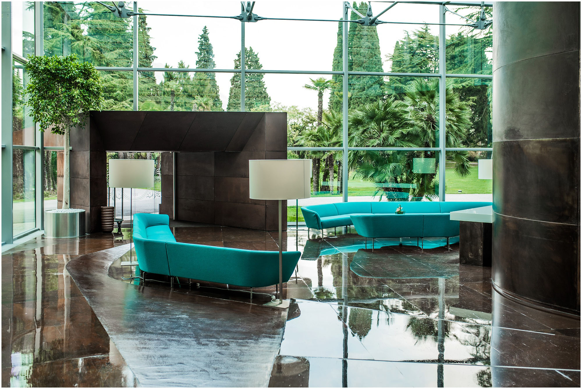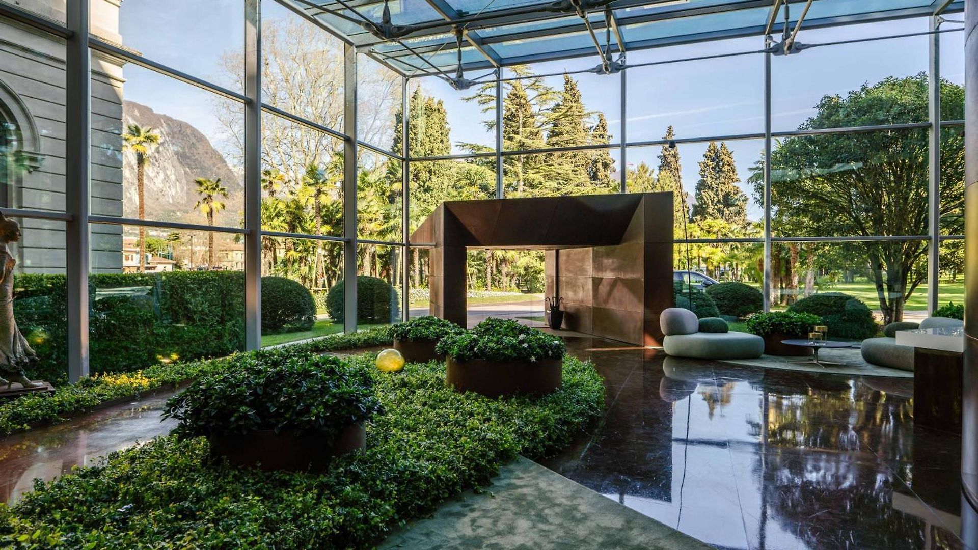 Always palatial in its architecture, the hotel was radically transformed by the avant-garde genius of Alberto Cecchetto and the lobby area now juts out from the main building as a museum-like extension with glass ceilings and swanky seating. The glass and metal dining extension is in a similar vein and stretches almost to the lakeshore. A glass walkway runs over the gardens – the restaurants and bar give the illusion of floating above the lake. Within the historic main building, marble columns and high ceilings are juxtaposed with modern art and vivid furnishing. Floor to ceiling windows offer stunning vistas over the gardens and the surrounding lake scenery giving a true inside-outside vibe.
