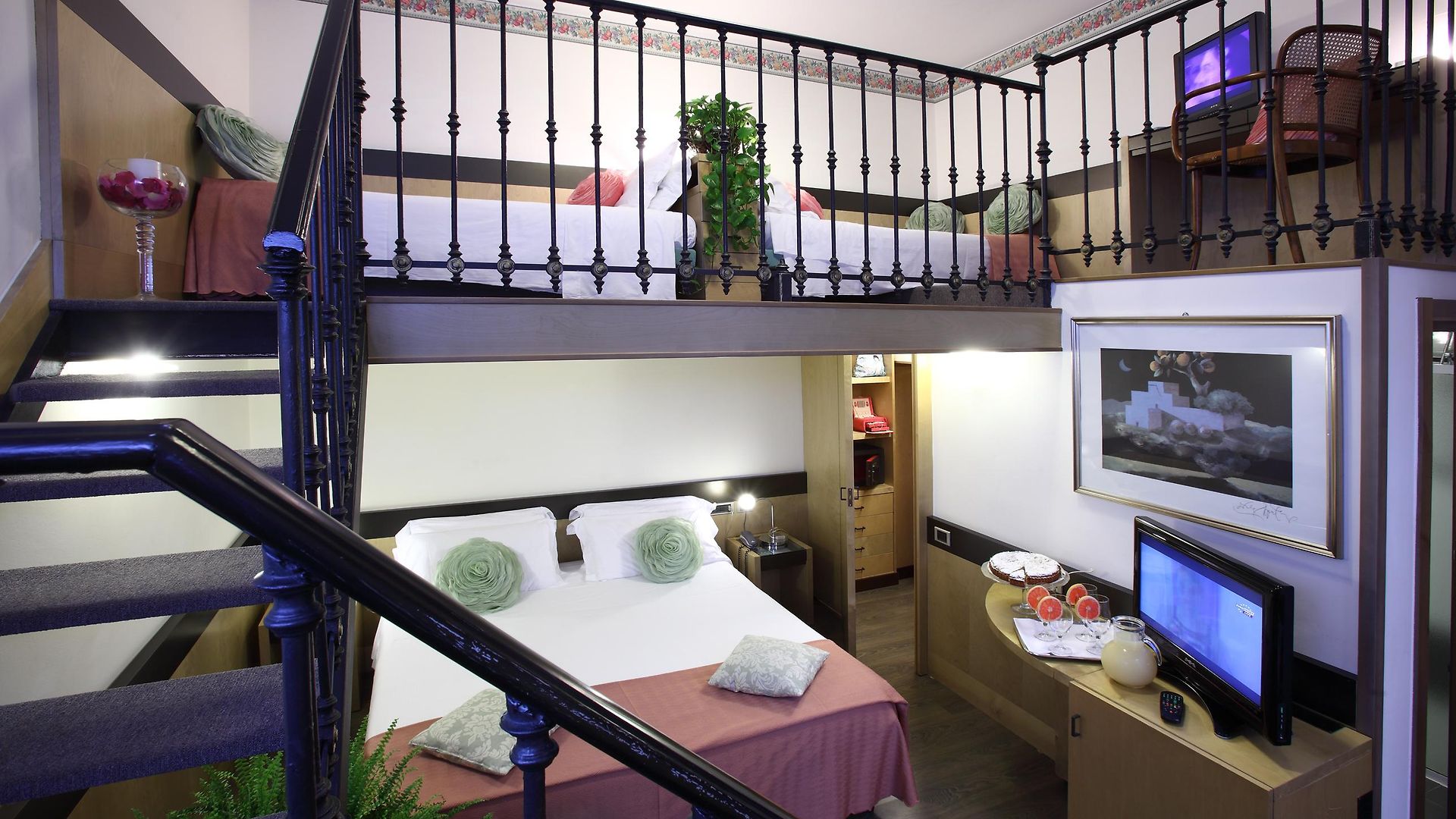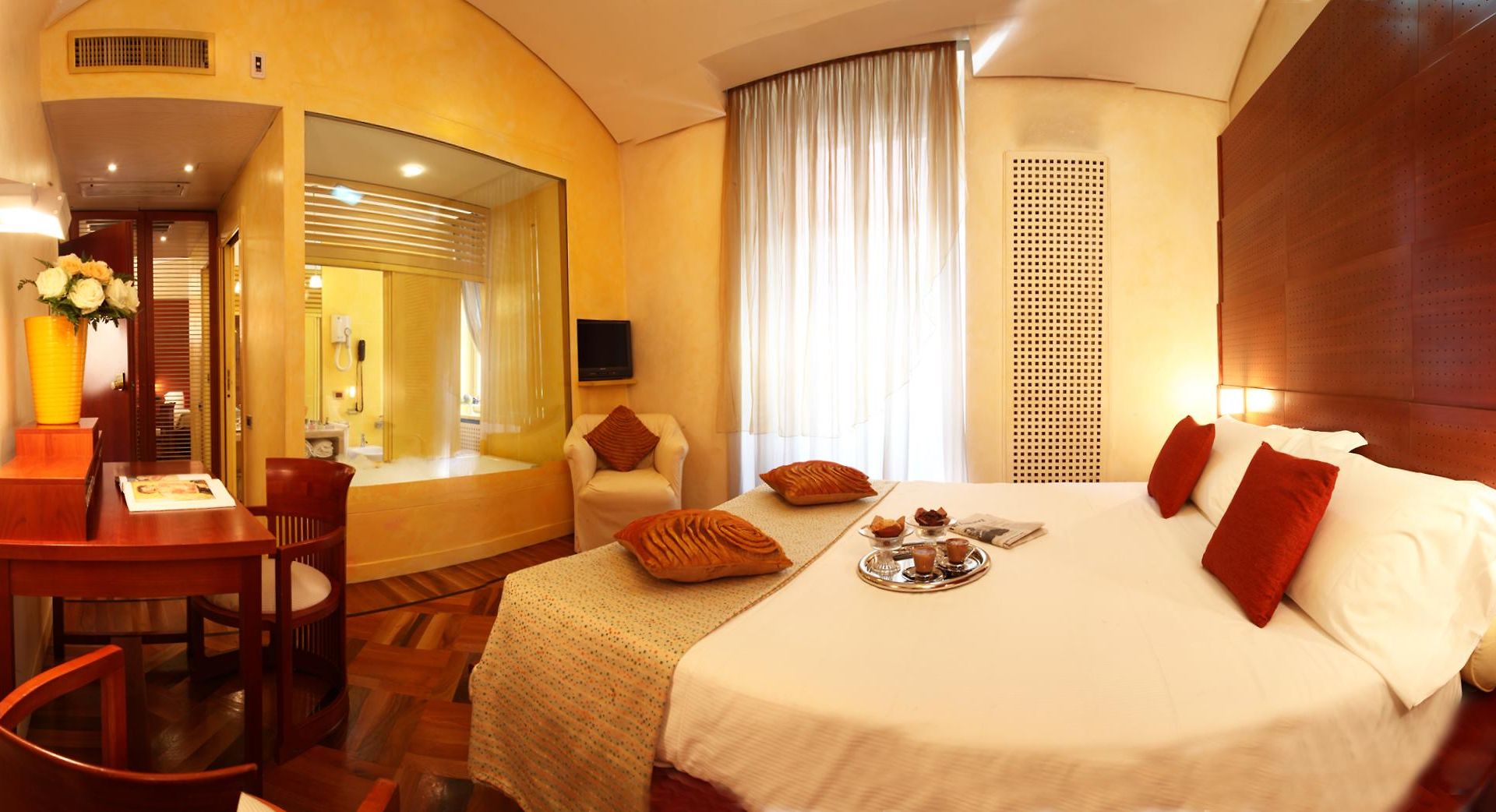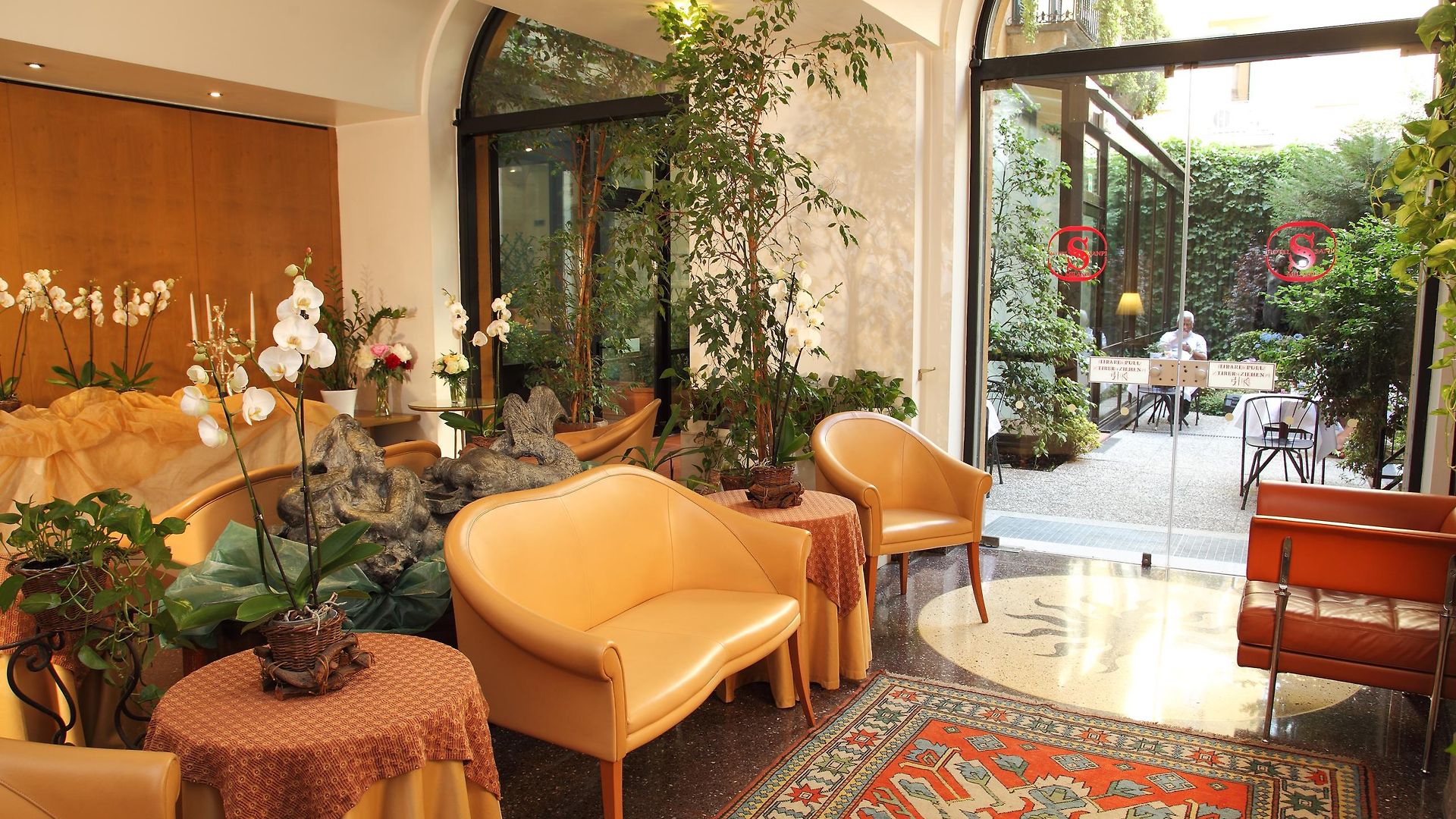 Italian style is easily recognisable throughout the public spaces of the property and the 79 guest rooms which are all defined by warm colours and elegant furnishings. To keep within the property’s philosophy of environmental sustainability, all walls are painted with eco-friendly water-based paint. Rooms have windows either out over the street or the internal courtyard garden from the windows. Triple rooms and the Sanpi junios suties have an additional bed making them suitable for up to 3 guests.