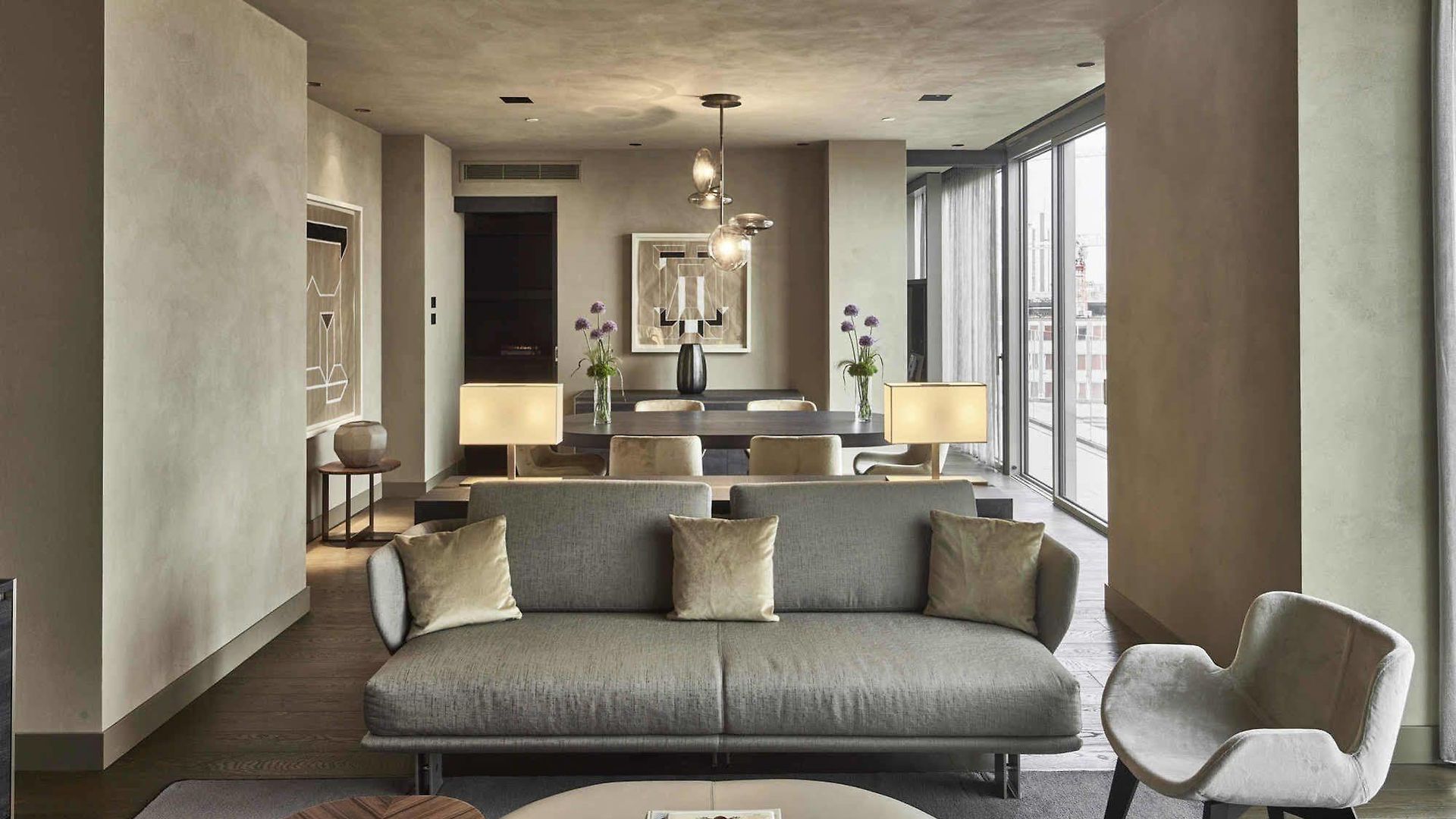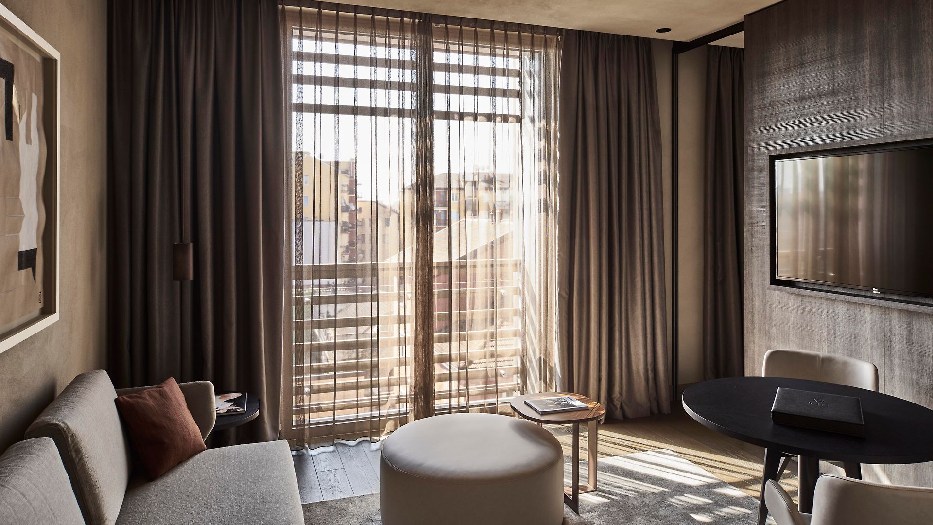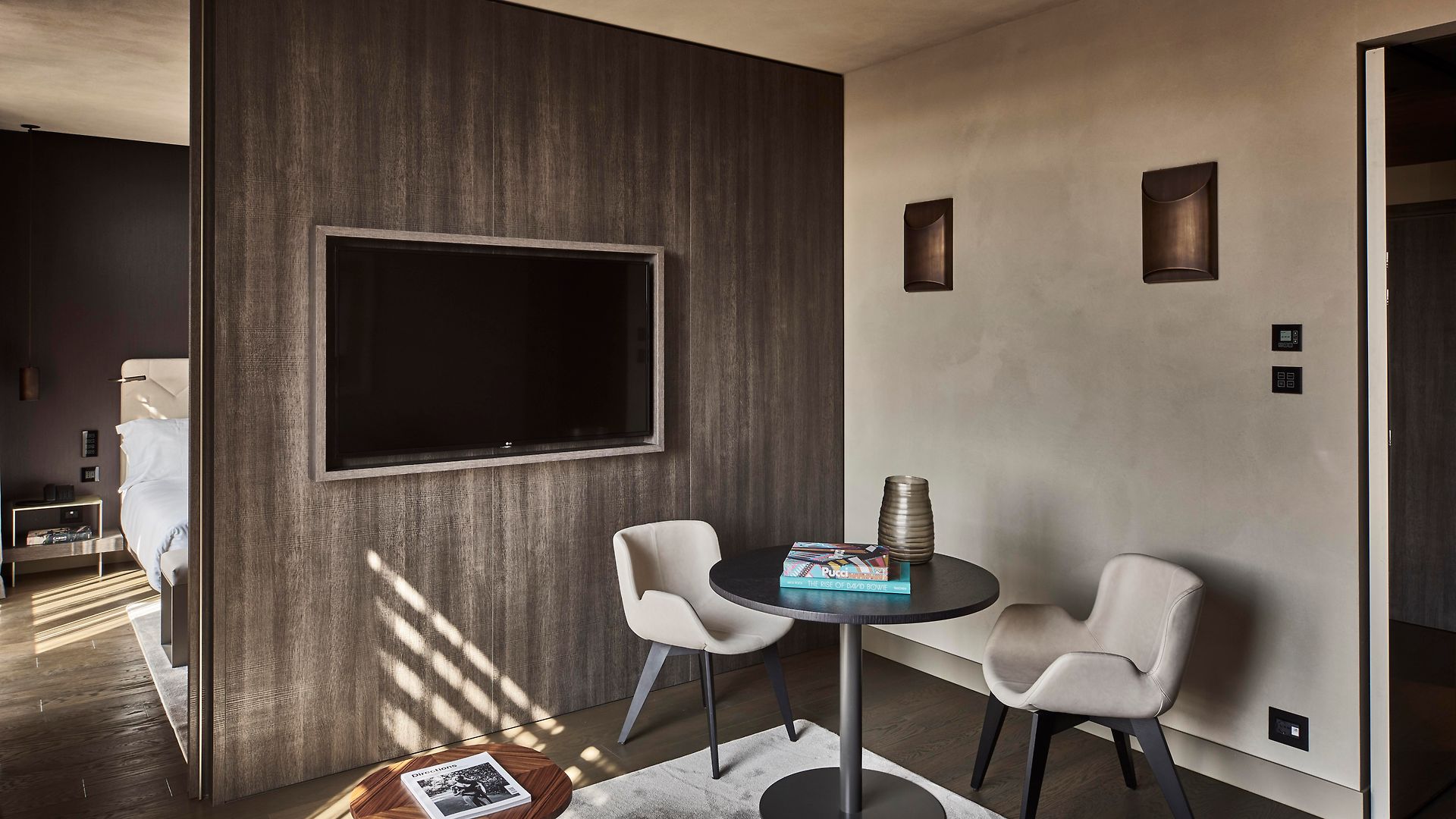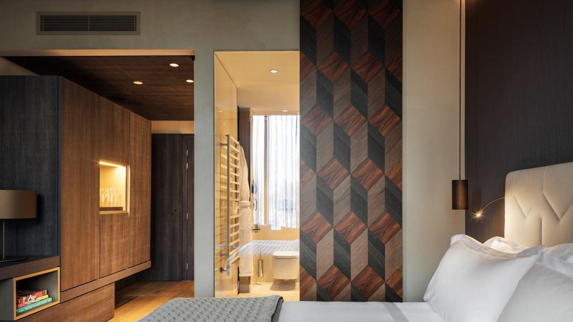 The interiors are both surprising yet soothing as a result of the contrasts between the parquet floors and light coloured fabrics and furniture by Molteni. Many of the bathrooms feature sliding walls of various woods creating a tapestry pattern of natural tones – especially when lit by the natural light that pours in through each window. The bedrooms themselves are all done out in shades of natural beige, chocolate brown and slate grey to give a modernist retro aesthetic.
