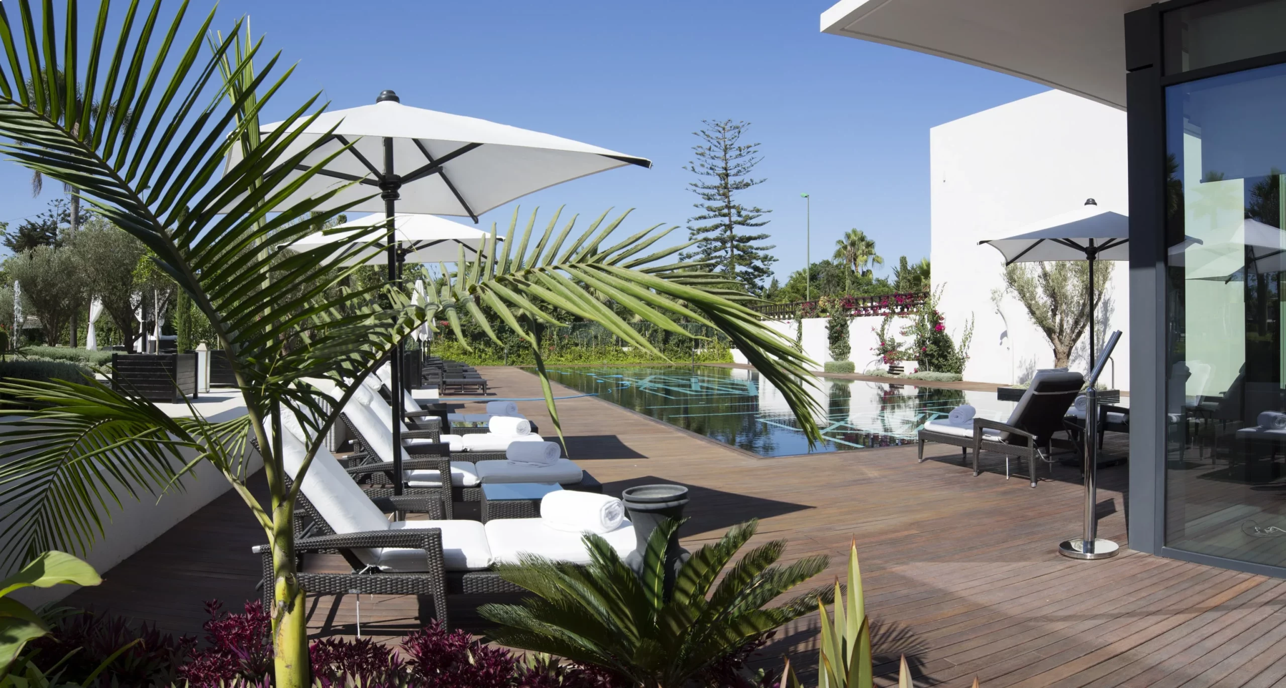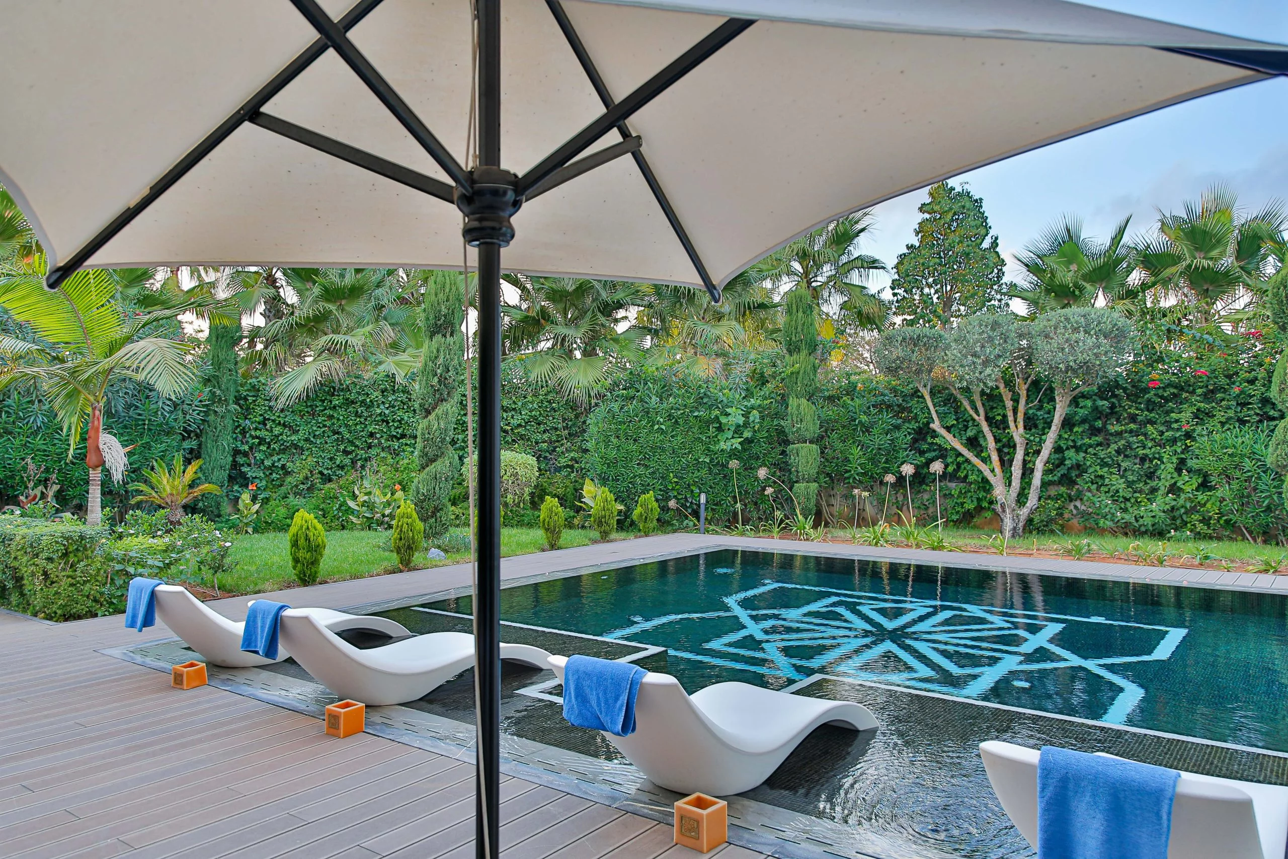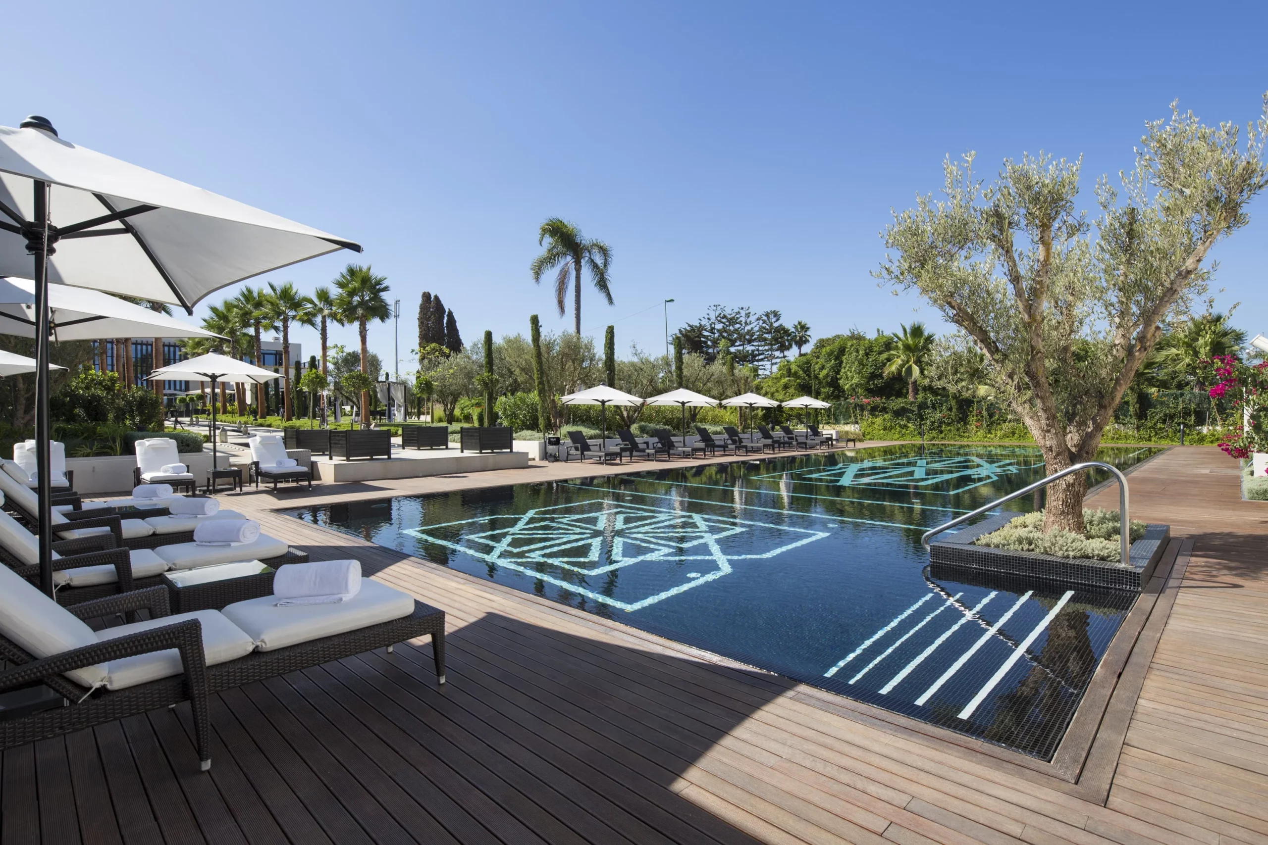 Located in front of the pool, the Spa offers a selection of experiences, including the traditional Moroccan hammam and massages. The spa has two individual treatment rooms, each with a treatment bed and hot tub. The Moroccan room features a traditional hammam, while the contemporary room has a sauna and steam shower room. For those who like to keep active while travelling, head to The Fitness Room which is equipped with a selection of the latest Technogym® equipment including Elliptical trainers, treadmills and training bikes as well as a multi-function body building bench, free weights and aerobic equipment. Overlooking the outside pool and the gardens offers an unprecedented eye catching experience. Surrounded by the beauty of the luscious gardens, the 25m outdoor swimming pool and its decoration it is definitely one of the pearls of the hotel. The wooden deck, patterned tiling and contemporary furniture make it the perfect spot to soak up the sun and relax.