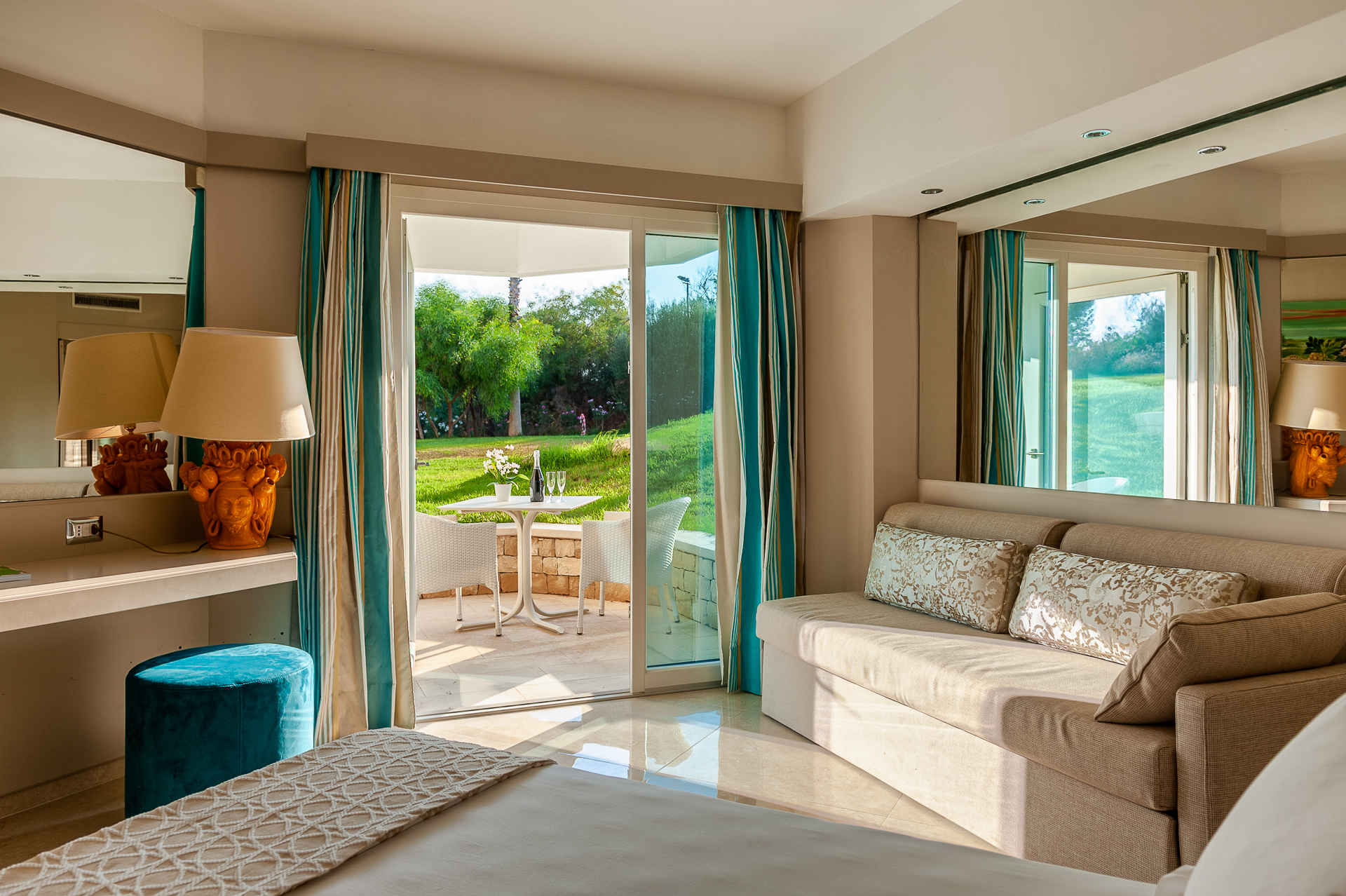 The 60 rooms here continue the elegant furnishings and décor and are well equipped. All offer side or lateral sea views.