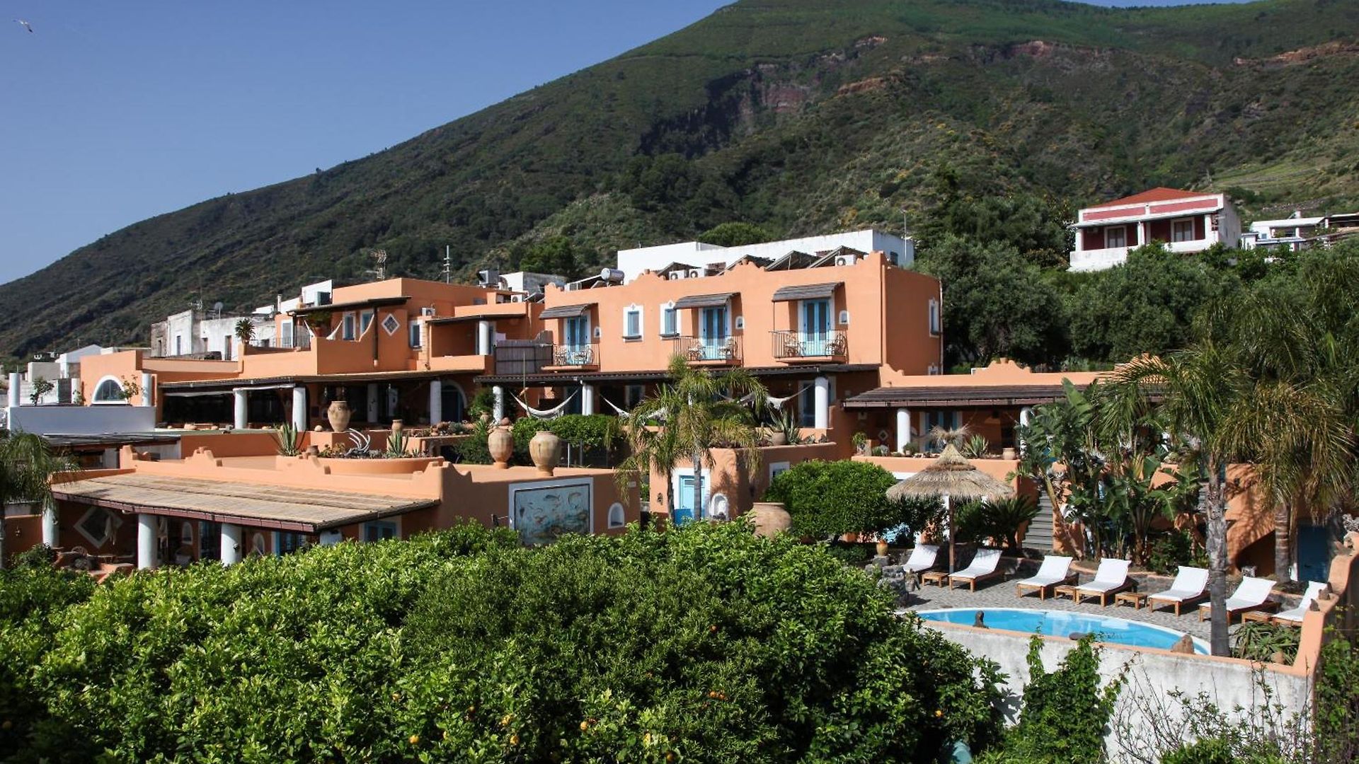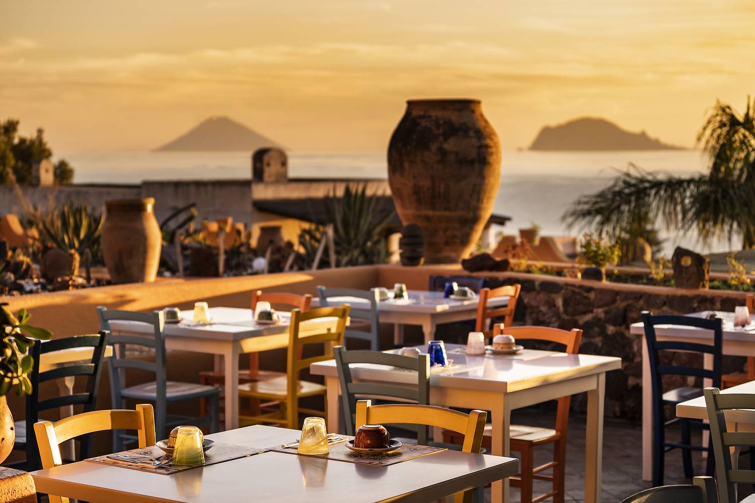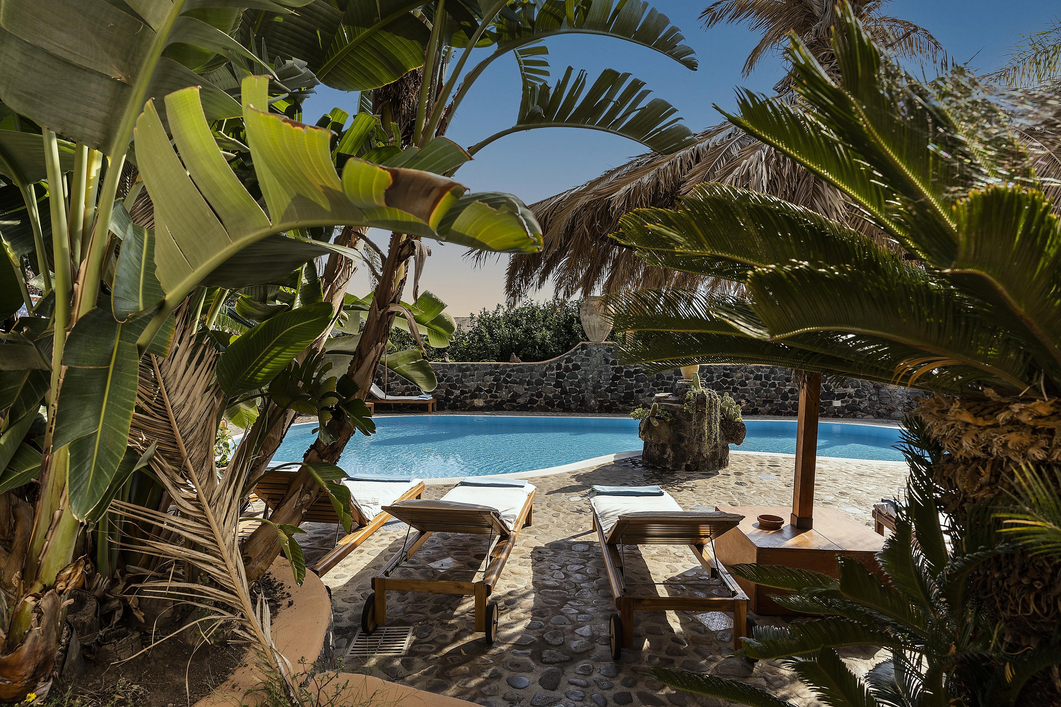 Hotel Mamma Santina is located in the centre of Santa Marina Salina with the village being accessible via the alleys typical of the island. Upon entering the property, the view opens up to wide terraces and luscious gardens that typical of the Riad of North Africa. The property throughout respects the typical Aeolian style and the natural environment in which is located. The stone walls, the changing patterns of arches and straight lines, the potbellied terrace columns “pulera” with niches to host candles and lanterns, the “Bisuoli” and the terraces “Bagghiu” tiled with old coloured tiles, are details that preserve the atmosphere and the simplicity of the aeolian style.