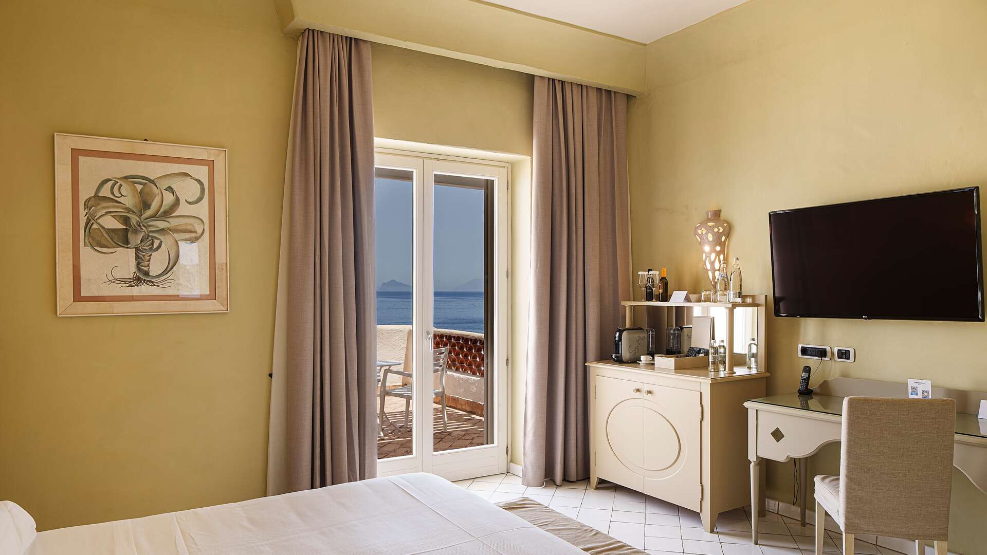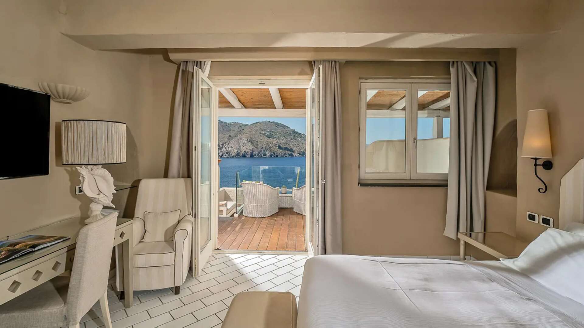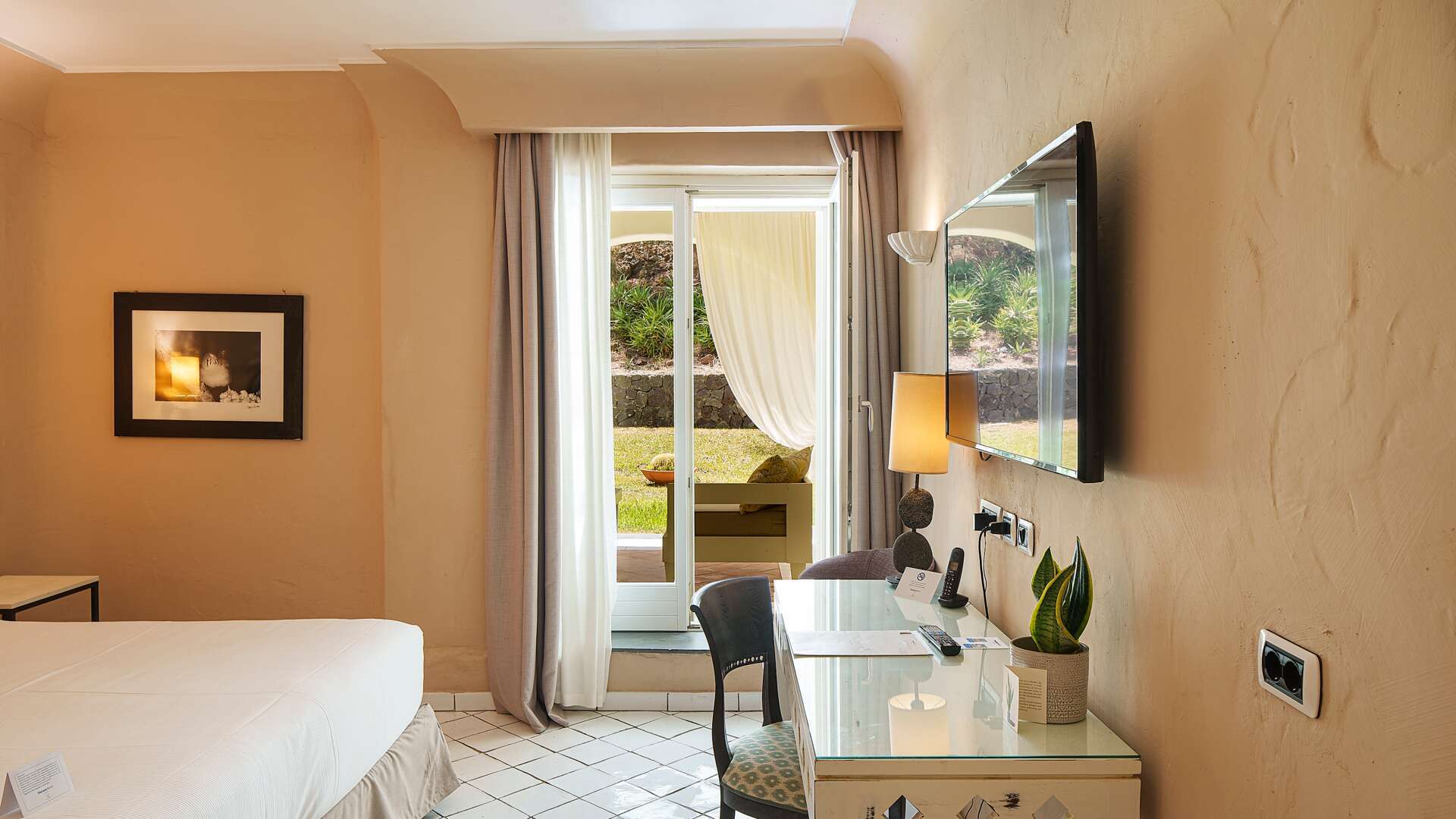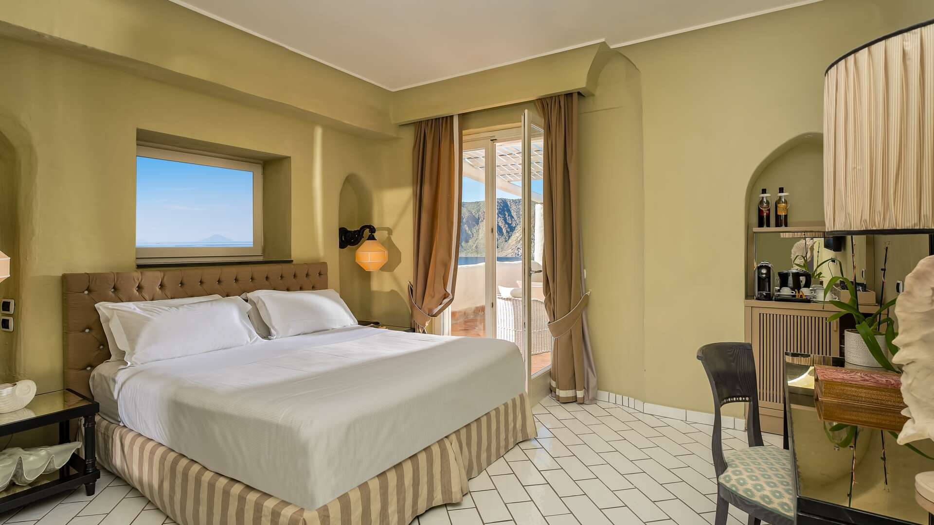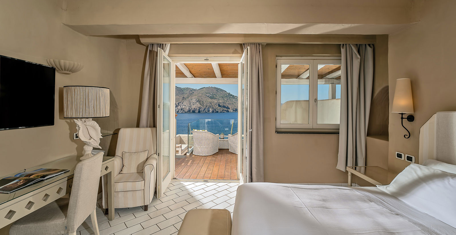An exclusive retreat with soft Mediterranean lines mixed with the harmonious Aeolian architecture, formed by typical pulere (columns), cannizzi (reed roofing) and arches facing the sea. The rooms of the elegant and romantic Therasia bring to mind the wild elements of this land, thanks to the skilful use of local materials: from lava stone to terracotta, cedar wood and olive wood. The thousand nuances of soft colours relax the soul, which can find its natural balance in the perfect silence of this oasis.