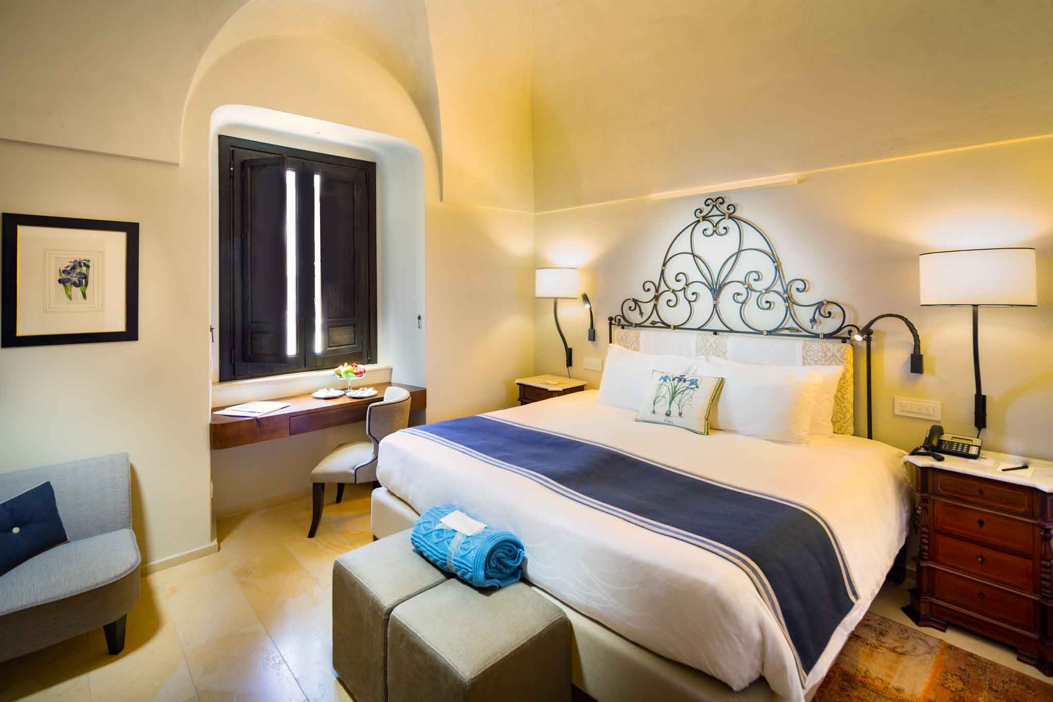 Inside, the design thoughtfully balances historical authenticity with contemporary luxury. Vaulted ceilings and original architectural elements remain intact, while Jerusalem stone bathrooms feature heated floors, rain-head showers, Italian toiletries, and, in many cases, deep soaking tubs. The suites—each individually designed and some with private terraces—offer a completely unique layout, enhancing the feeling of staying in a timeless private residence overlooking the sea.