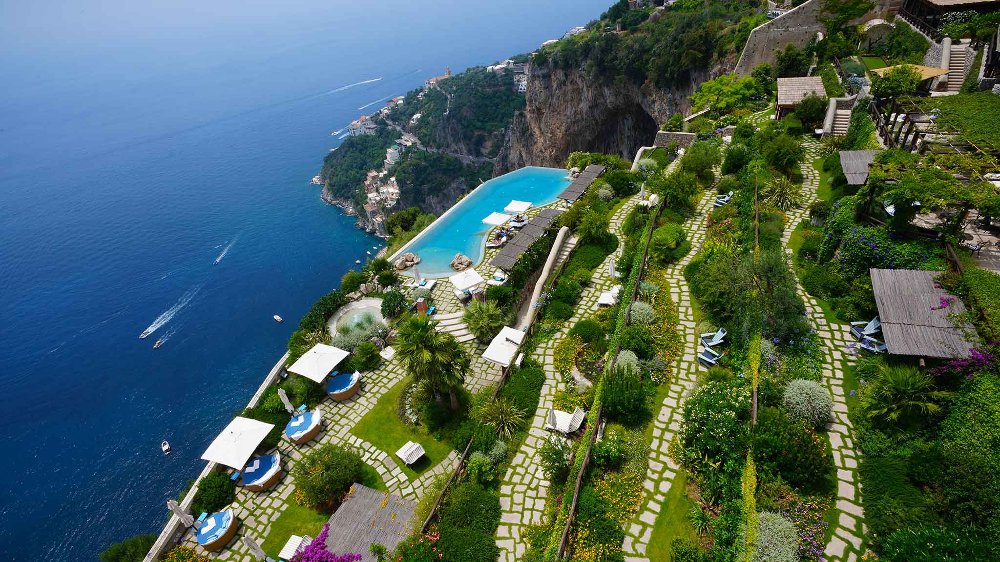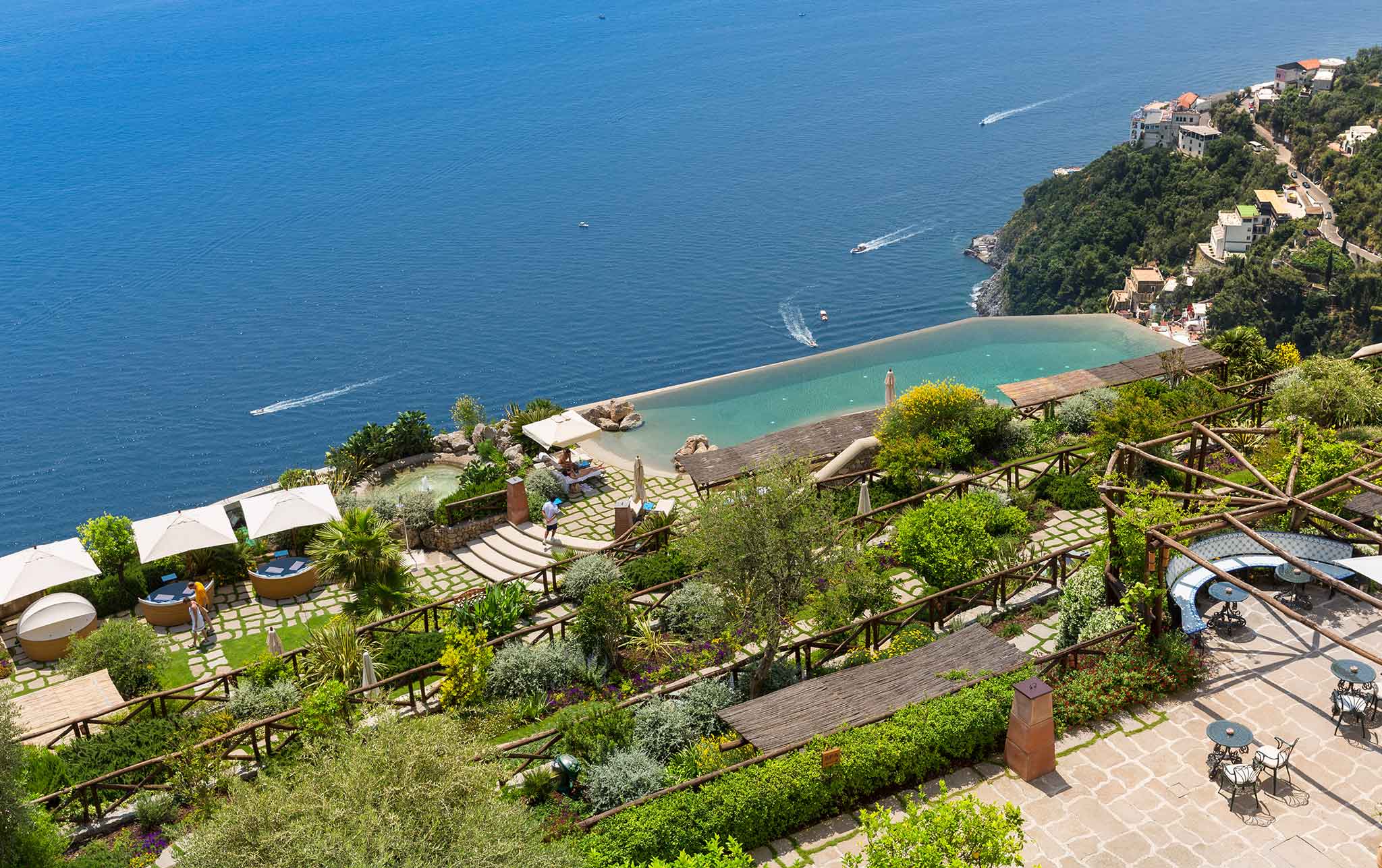 The gardens themselves are a highlight—four terraced levels of lush landscape, each thoughtfully planted and meticulously maintained. These botanical tiers descend from the dining terrace to the edge of the cliff, creating a Mediterranean paradise reminiscent of classical Italian villas. Daybeds, loungers, and shaded areas invite guests to linger at their leisure, all culminating in what is arguably the most dramatic infinity pool on the Amalfi Coast. Seemingly vanishing into the horizon, the pool offers a breathtaking visual experience as land, sea, and sky merge in perfect harmony.
