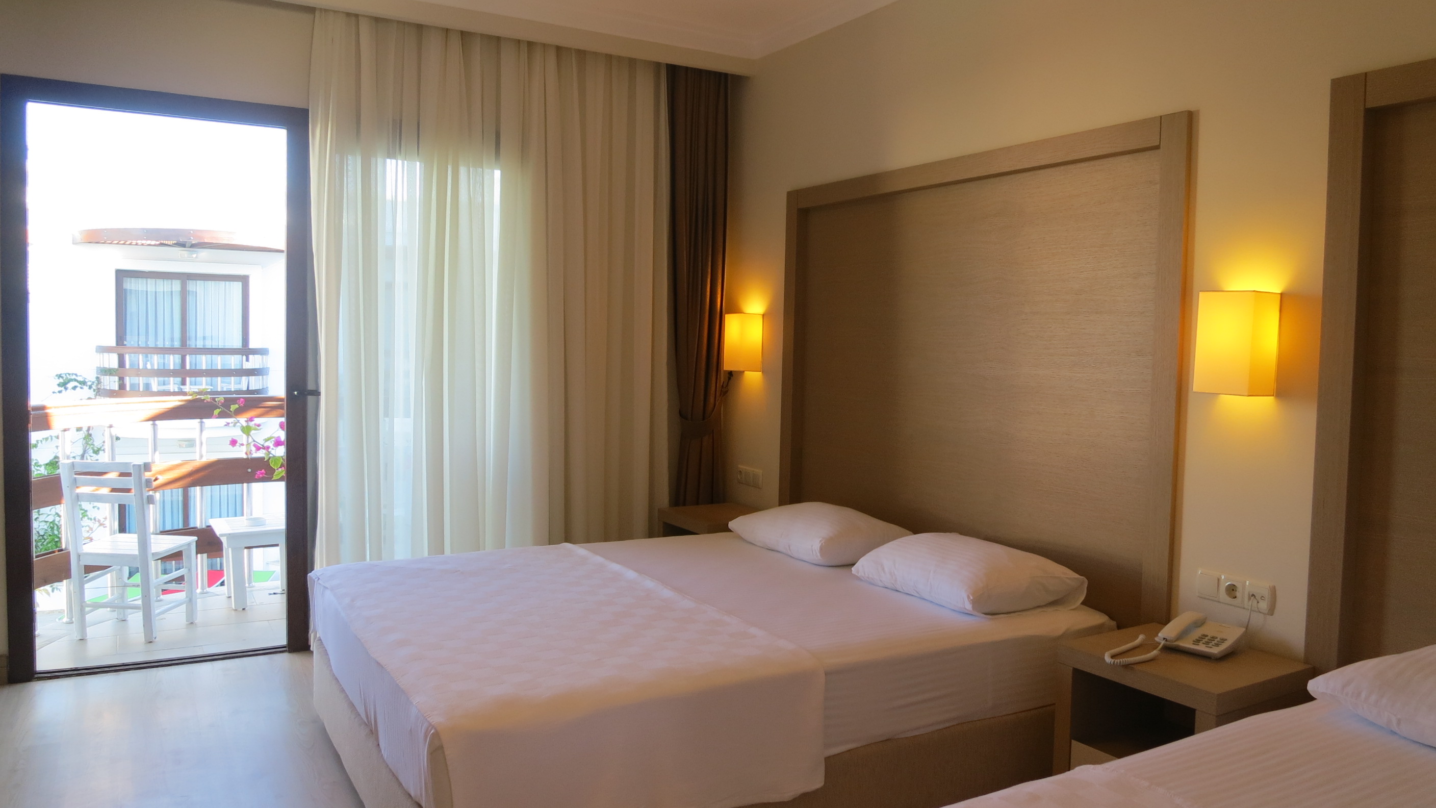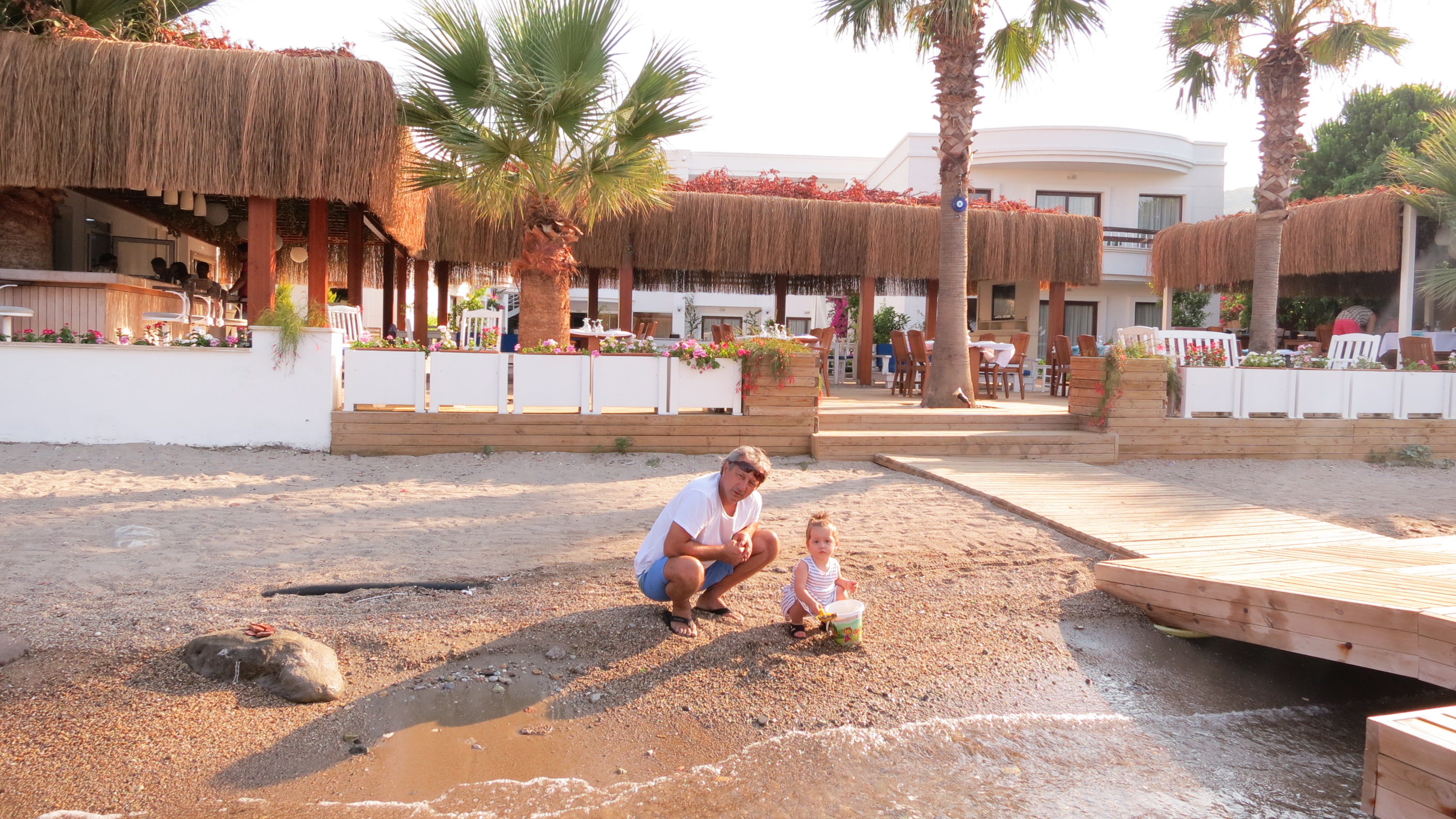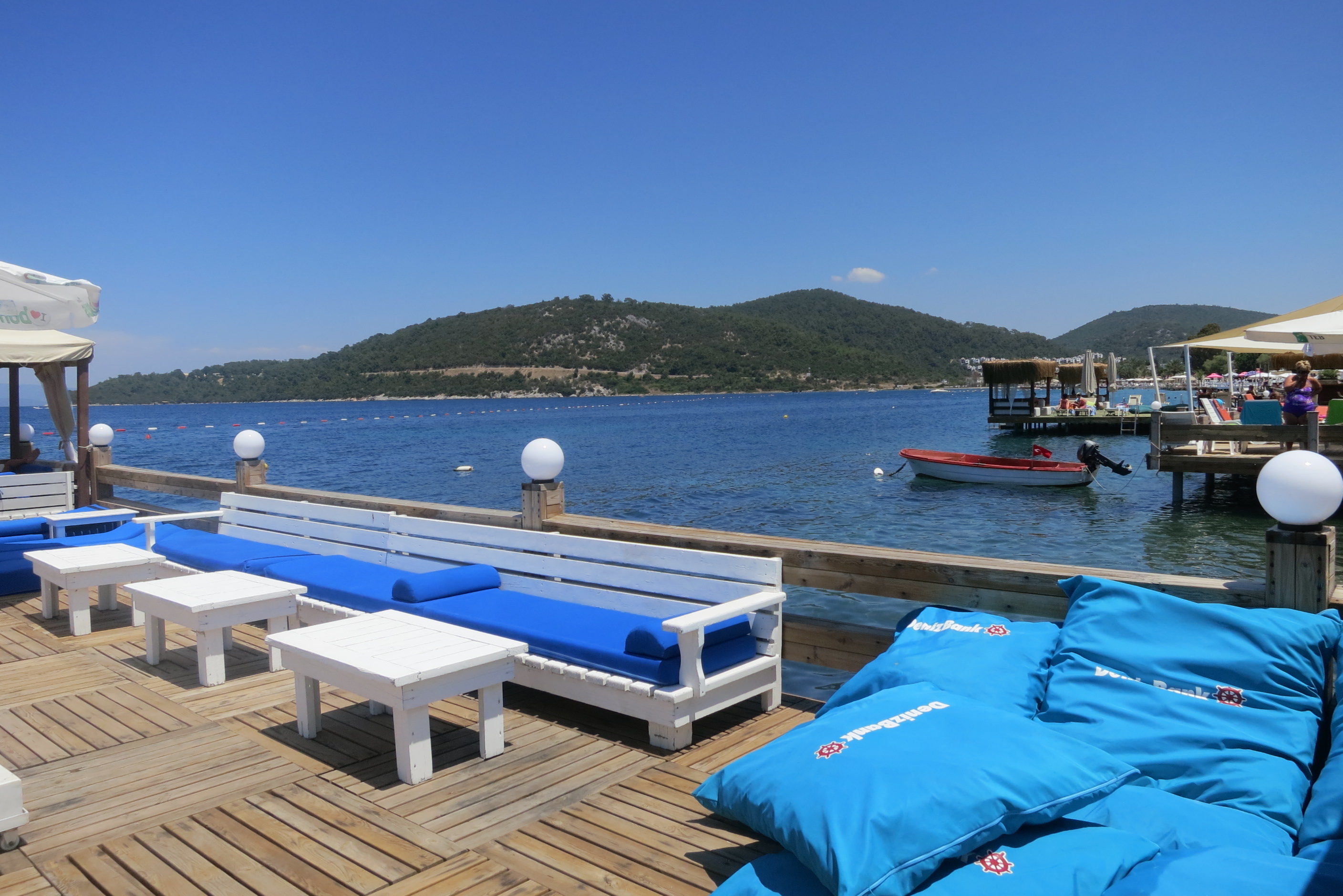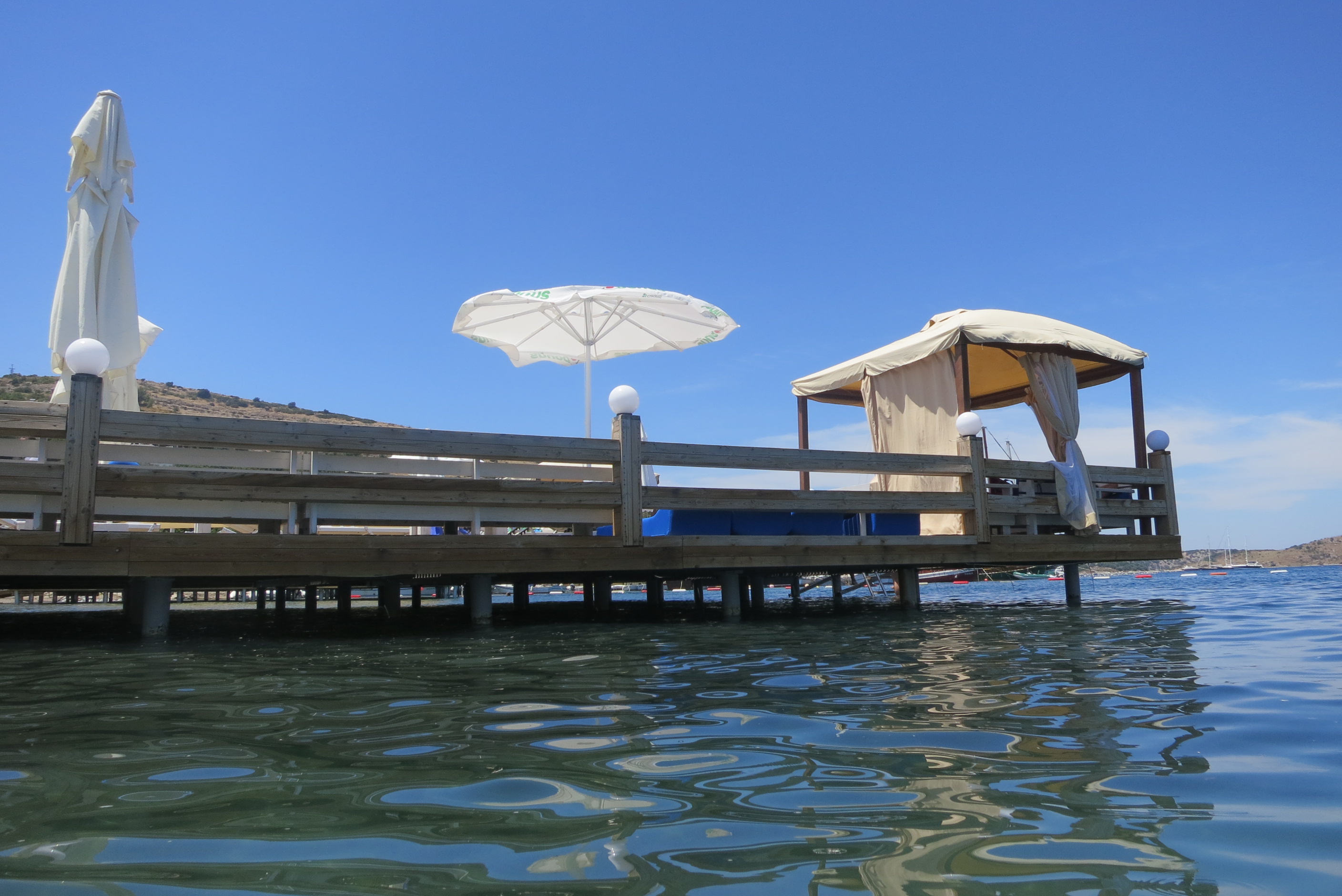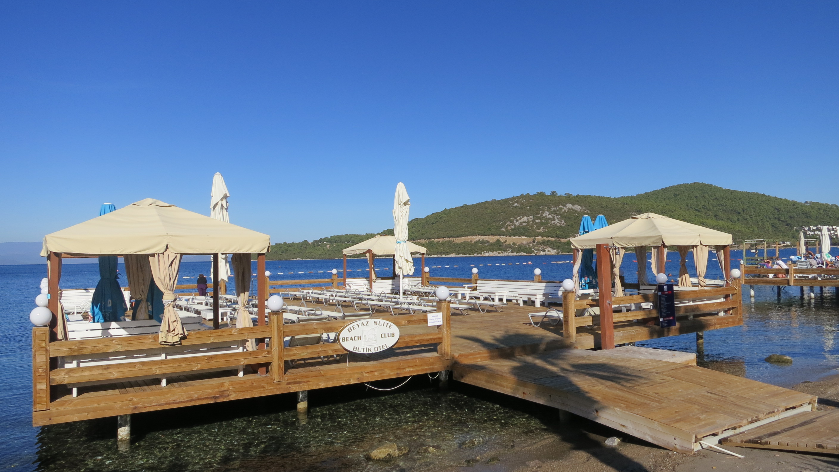 Outside a good sized swimming pool and a children’s pool are surrounded with sunbeds and lead to the palm covered bar and restaurant where breakfast is served; throughout the day snacks are available. Directly in front of the restaurant is Gölköy’s small sandy beach and the hotels’ very large wooden jetty furnished with comfortable sun beds, shady lounging corners and steps into the very clear sea.