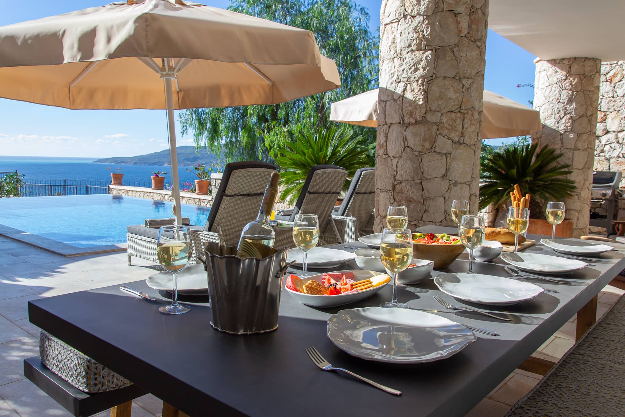 A large infinity swimming pool for you to cool off in and numerous seating areas with chic contemporary sofas to lounge on, whilst enjoying a glass of the very good local wine.