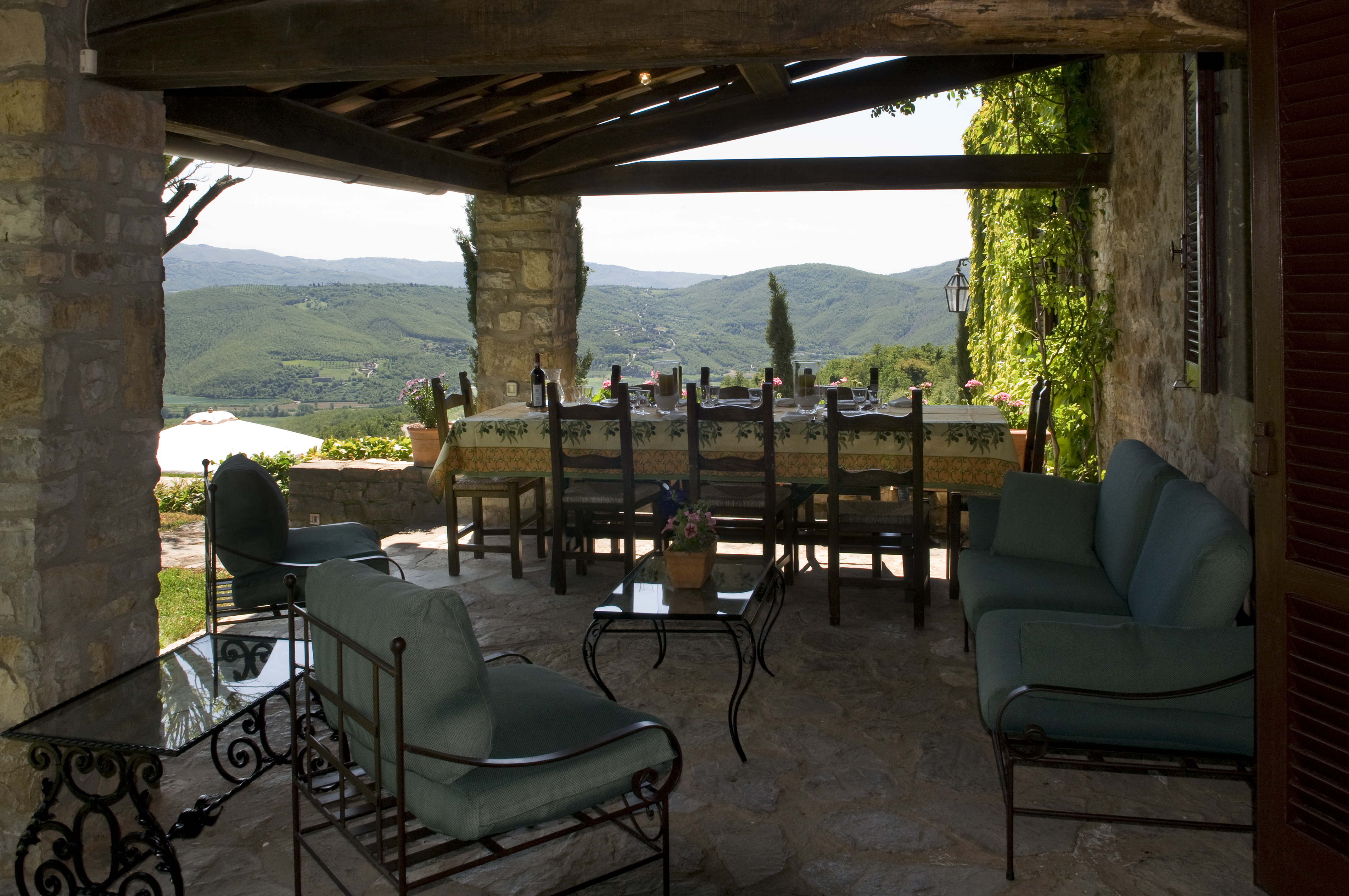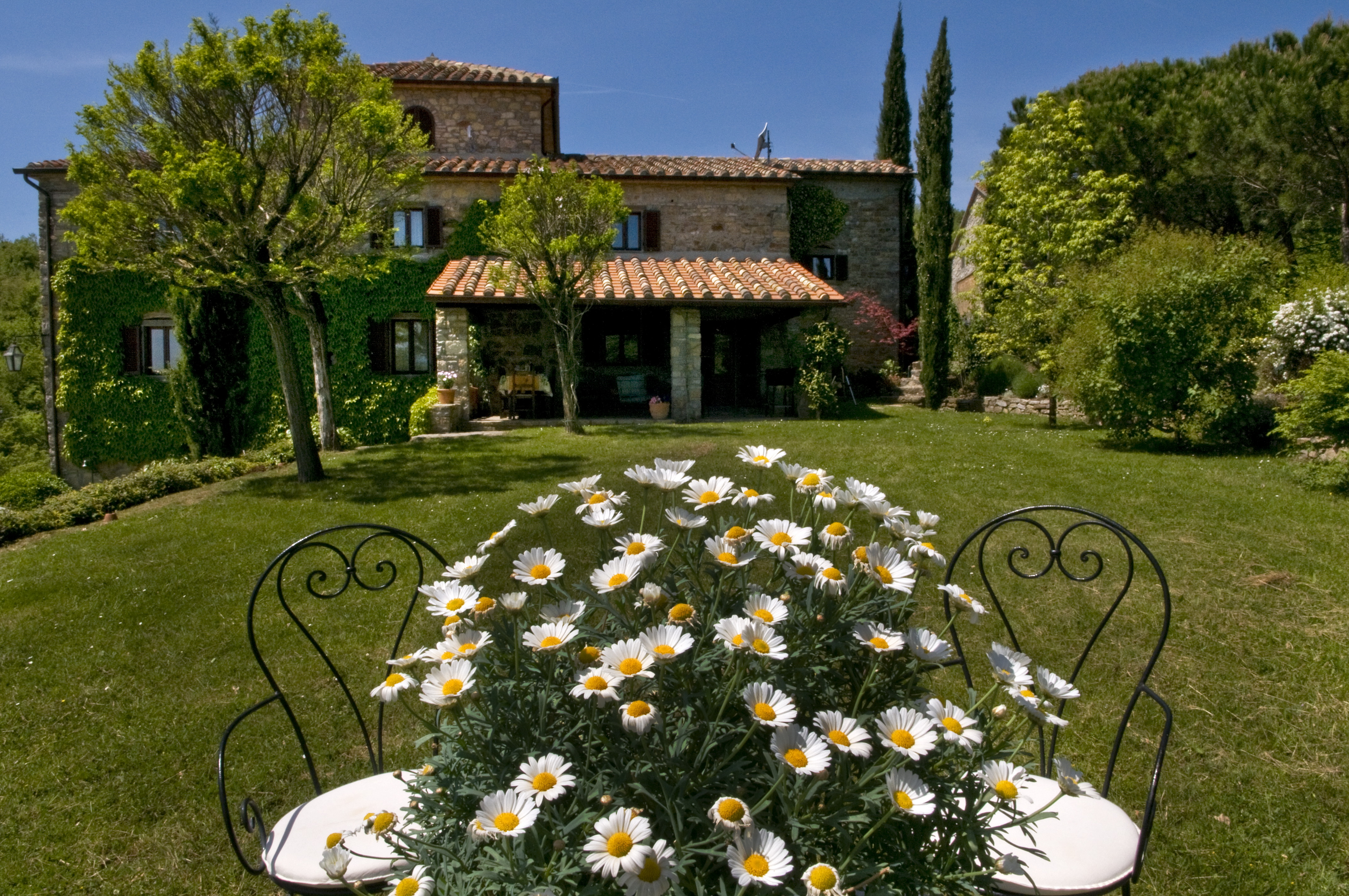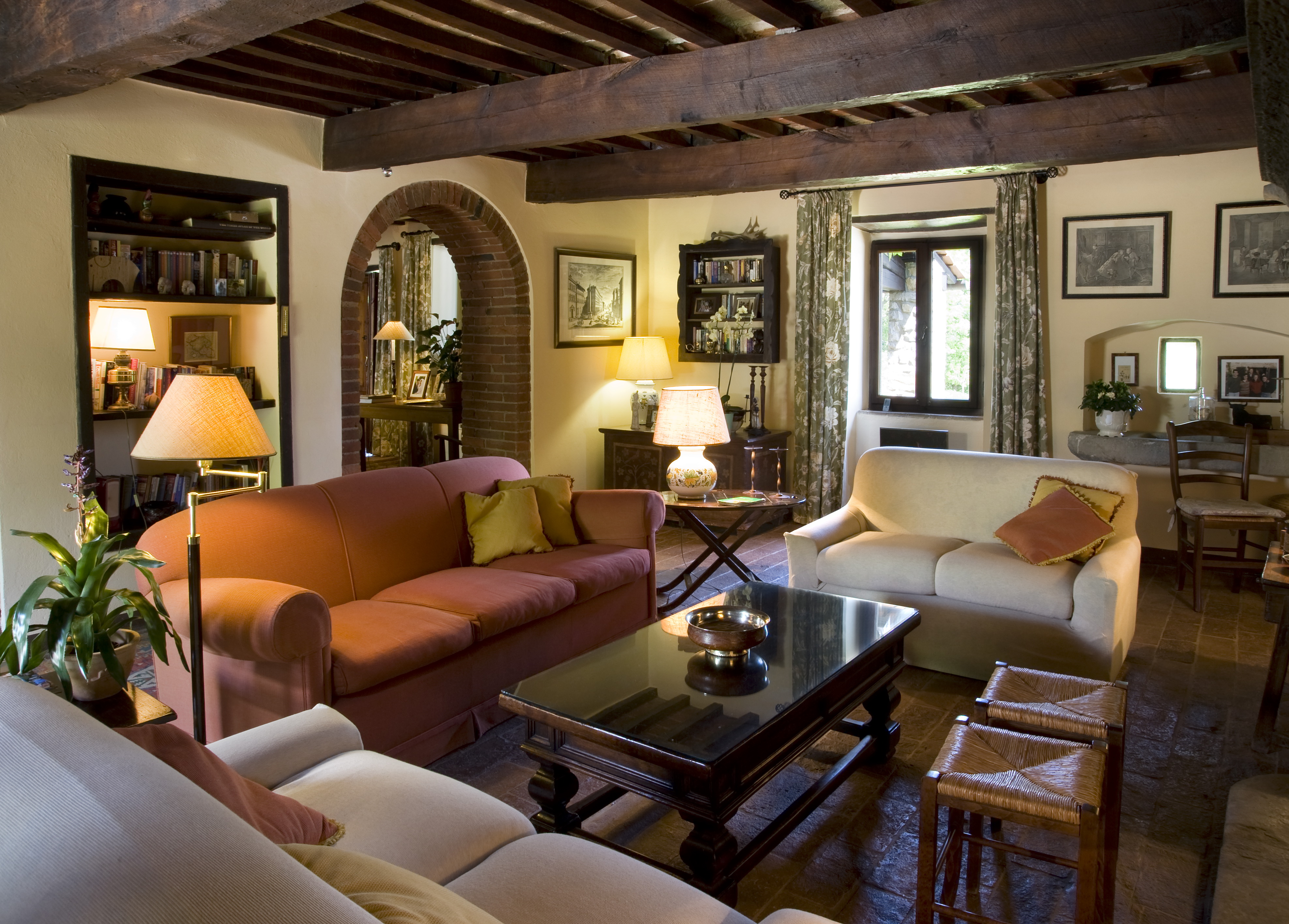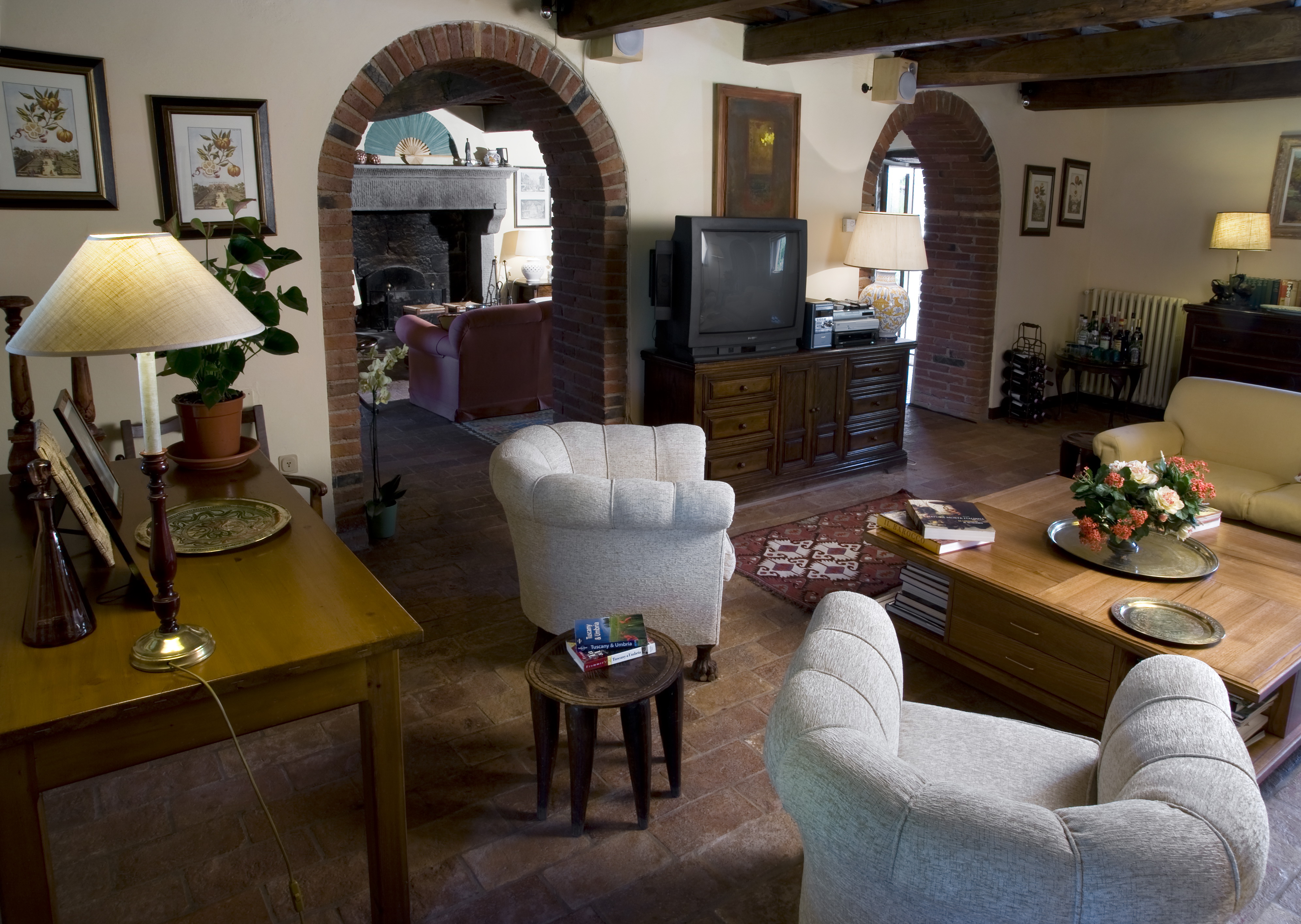 Decorated in typically Tuscan style with mellow terracotta d’Assisi floors, exposed chestnut beams and thick whitewashed walls it needs no air conditioning and remains cool in the summer and warm in the winter, insulated from the strongest summer sun or harshest winter gale. Furnished with period country furniture, it offers comfortable spacious accommodation ideal for a family looking for a base to expore or just to relax together.